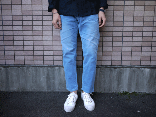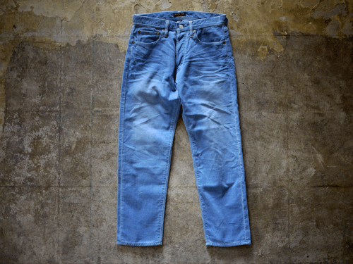 こちらはインディゴ染めした細畝のコーディロイを使用したクロップド丈の5ポケットパンツになります。膝下からテーパードを強めに効かせたスッキリとした細身のシルエットになっています。2年ほどしっかり穿きこんだ状態をイメージして、ヒゲやアタリなどもリアルに再現しています。個人的にはサーフテイストやユーズド感のあるアイテムとの組み合わせがお薦めです。