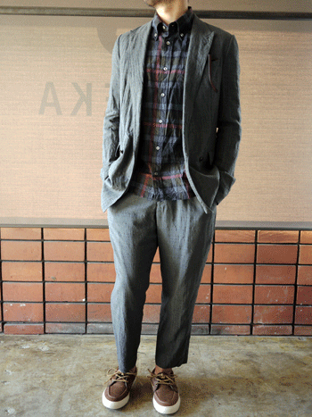 こちらはソフトな風合いと独特の光沢感を持つテンセル素材を使用したシリーズになります。この春、非常に注目度の高いダブルのジャケットも<kolor>の手にかかると上手く力の抜けた印象に仕上がっています。淡いトーンのタータンチェック柄も上品な全体の雰囲気にとても合っています。一見すると堅いイメージのダブルのジャケットですが極端に細く絞ったアームホールとシェイプさせたウエストが洗練されたシルエットを形成しています。こちらは是非一度騙されたと思って試していただきたい一着です。