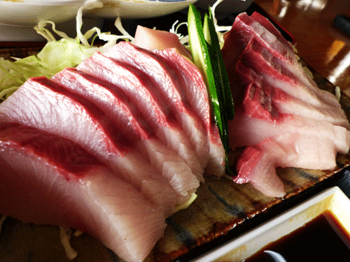 刺身定食(¥1200-)を注文したら尾鷲市の魚であるブリが出てきました。肉厚で歯ごたえもよく、醤油に付けた瞬間に脂が浮くほどです。ちょうど今が旬の時期のようですね。
