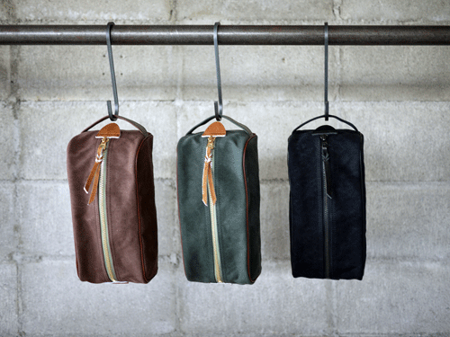 こちらはシンプル構造で武骨な雰囲気の化粧ポーチです。広いく安定感があるマチは、ファスナーを開けたまま置いて使うのに適したデザインになっています。ポーチを一つとっても細かな所まで気の利いたディテールやこだわりを感じる作りにはいつも感服してしまいます。