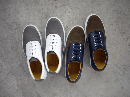 今回ピックアップしたモデルはオーセンティックなスニーカーのデザインに上質な素材を用い、メダリオン装飾を施すことでスニーカーというカジュアルアイテムをワンランク上の上品なアイテムへと昇華させています。アッパーのきめ細かいスエードと厚みのあるレザーの質感は高級感が漂っています。White、Navy共に好配色に仕上がっています。ちなみにNavyは当店の別注カラーになります。