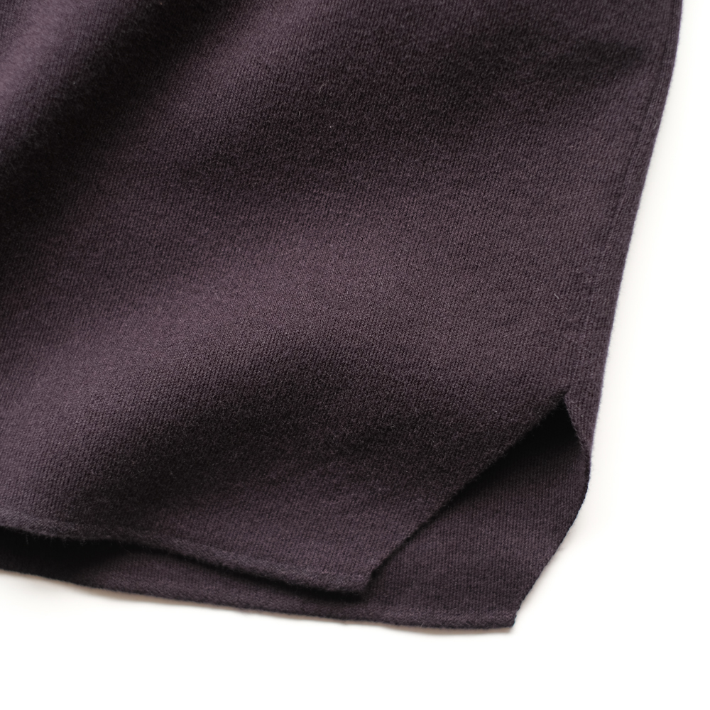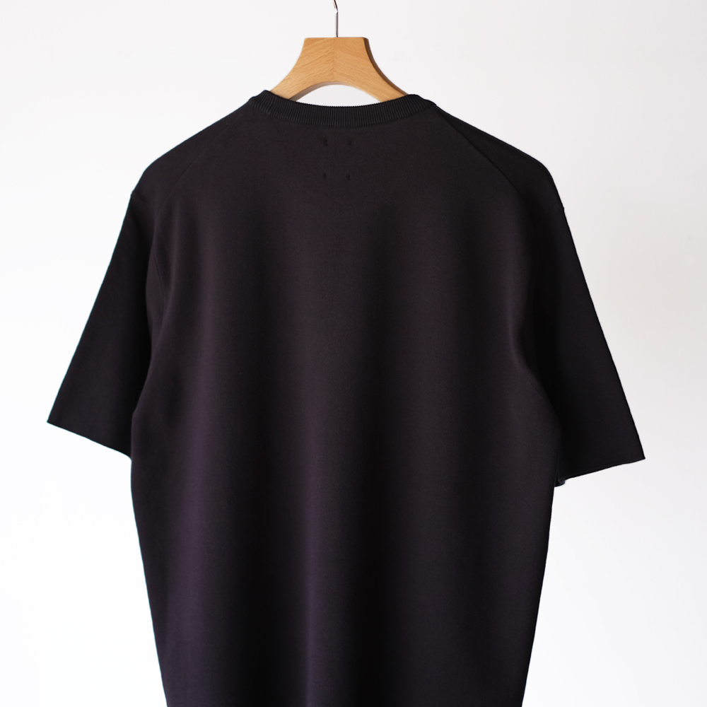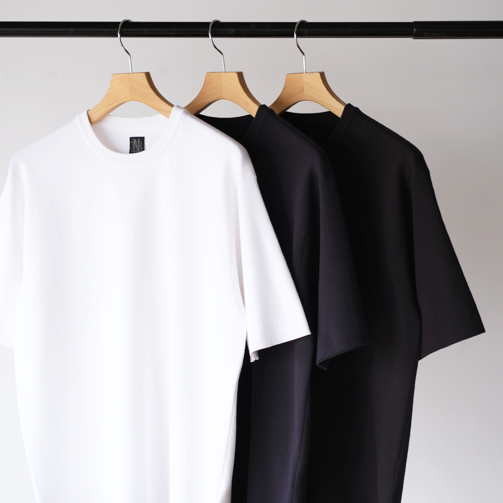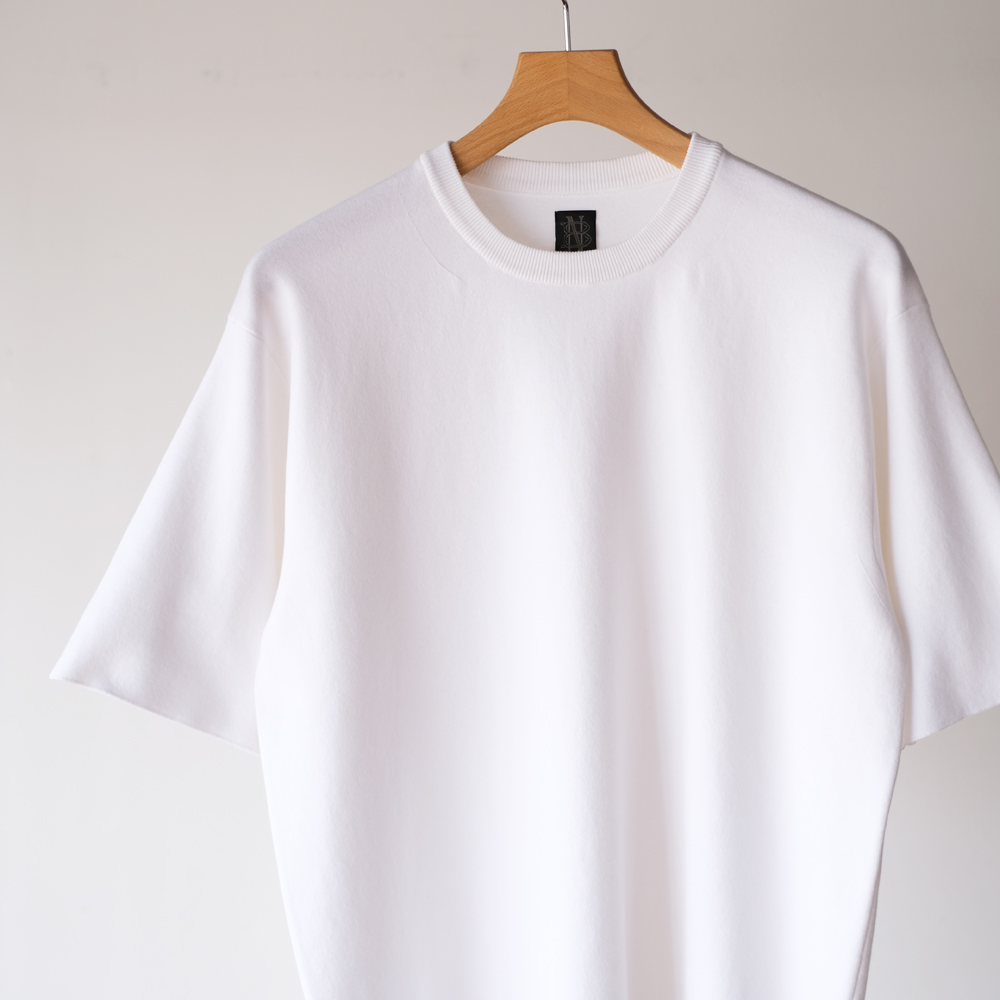 こちらは世界で最もハイゲージの横編機で超細番手のコットン強撚糸をスムース編みしたアイテムです。ニットならではのスッキリとしたディテールと1枚で着用しても安心感があり、スムースという編み方によるキックバックが耐久性にも優れています。