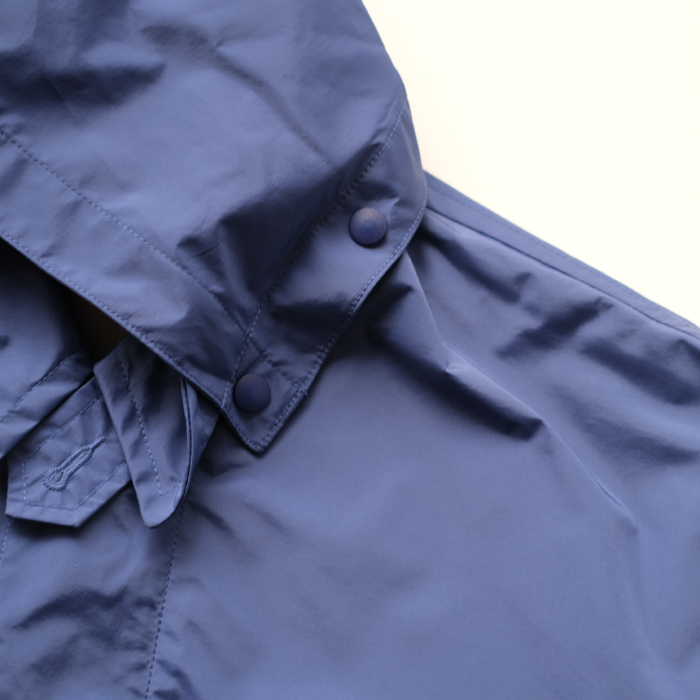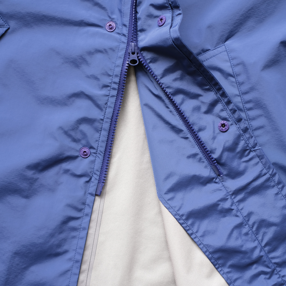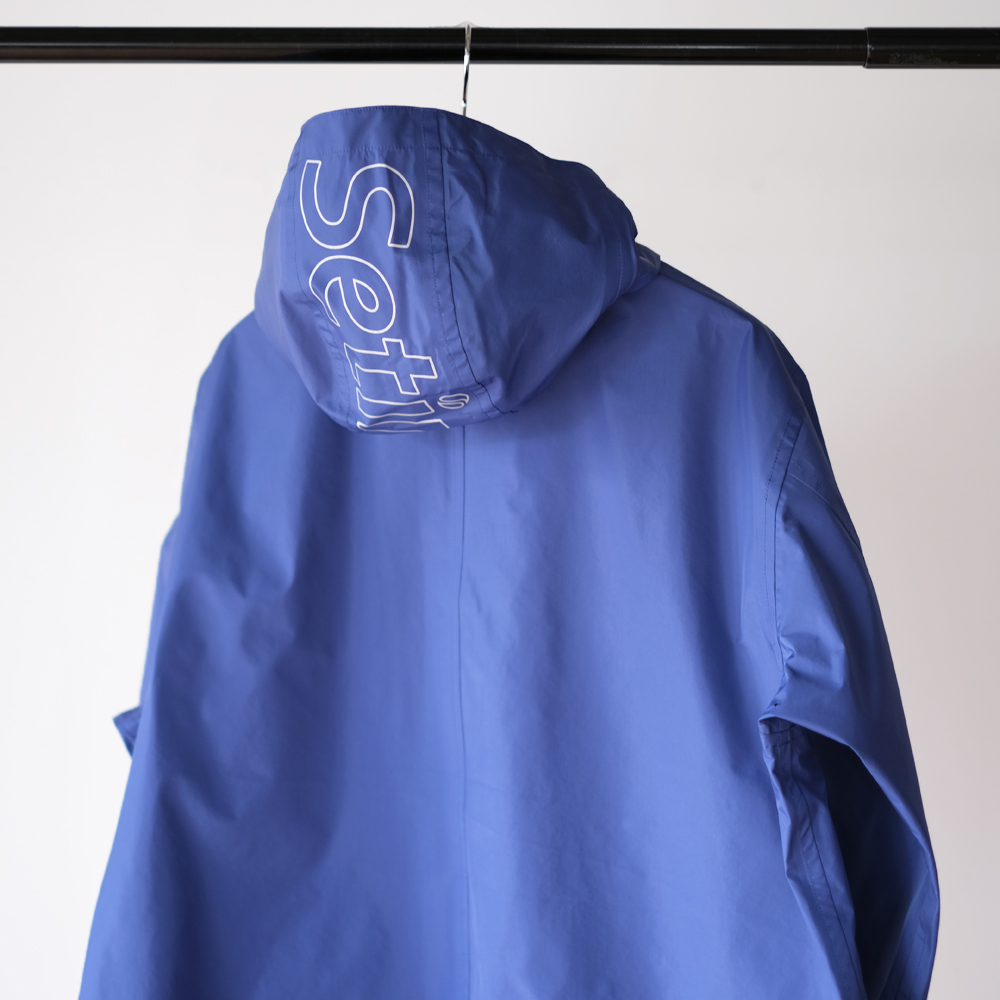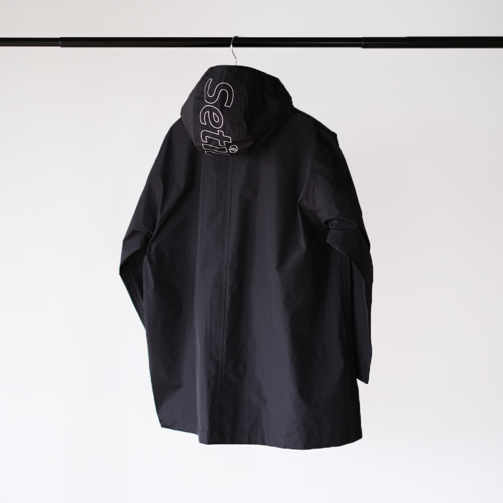 こちらは撥水性のある高機能素材を使用した、ミドル丈のコートになります。フード部分は取り外し可能で大胆にブランドロゴがリフレクタープリントされています。左のポケット口には反射糸で施されたロゴの刺繍がアクセントとなっております。