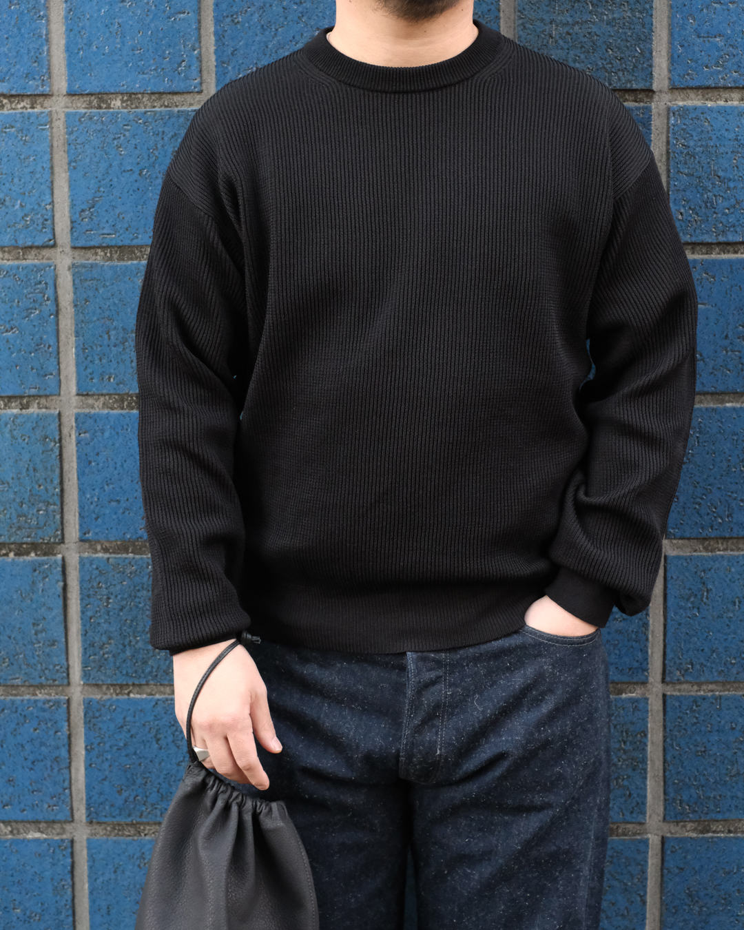 こちらは植物由来成分を用いた日本独自の加工を施した、コットン100%の両畦編みニットになります。さらりとしたドライなタッチと、ほどよい清涼感のある風合いが特徴で、張りのある編み地が、シンプルながらも存在感のある表情を生み出してくれる一着となります。