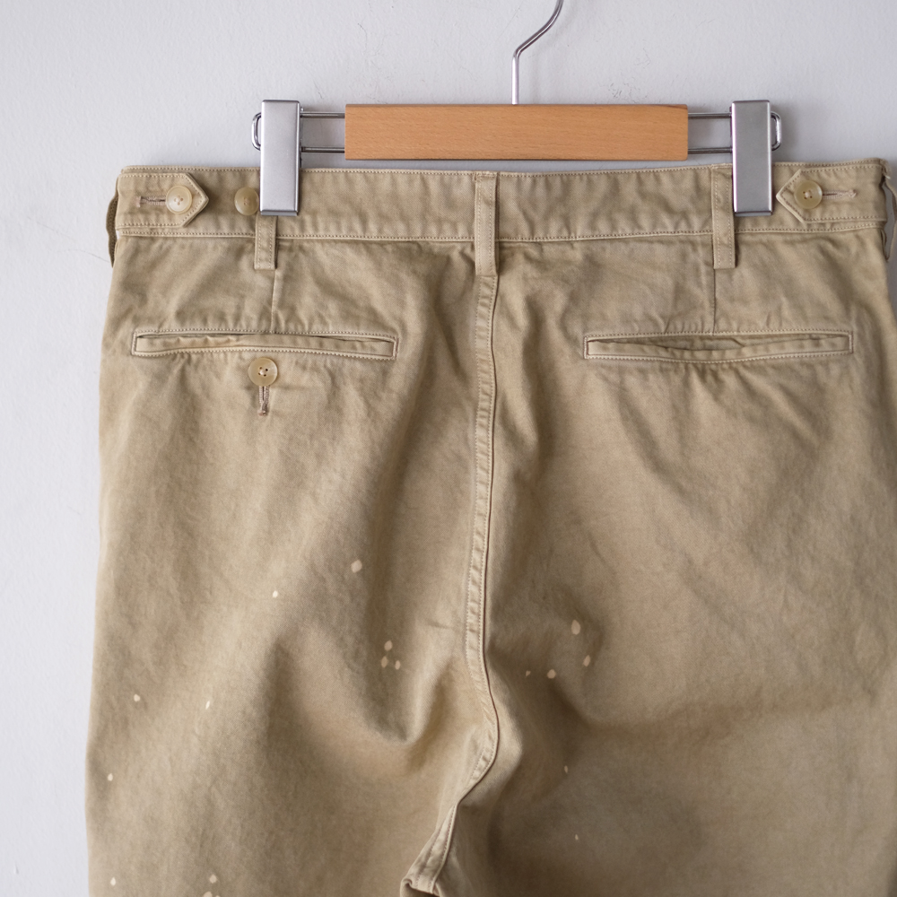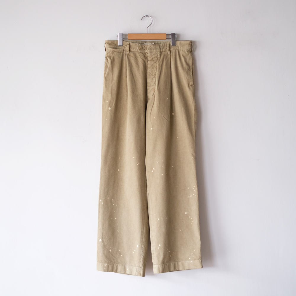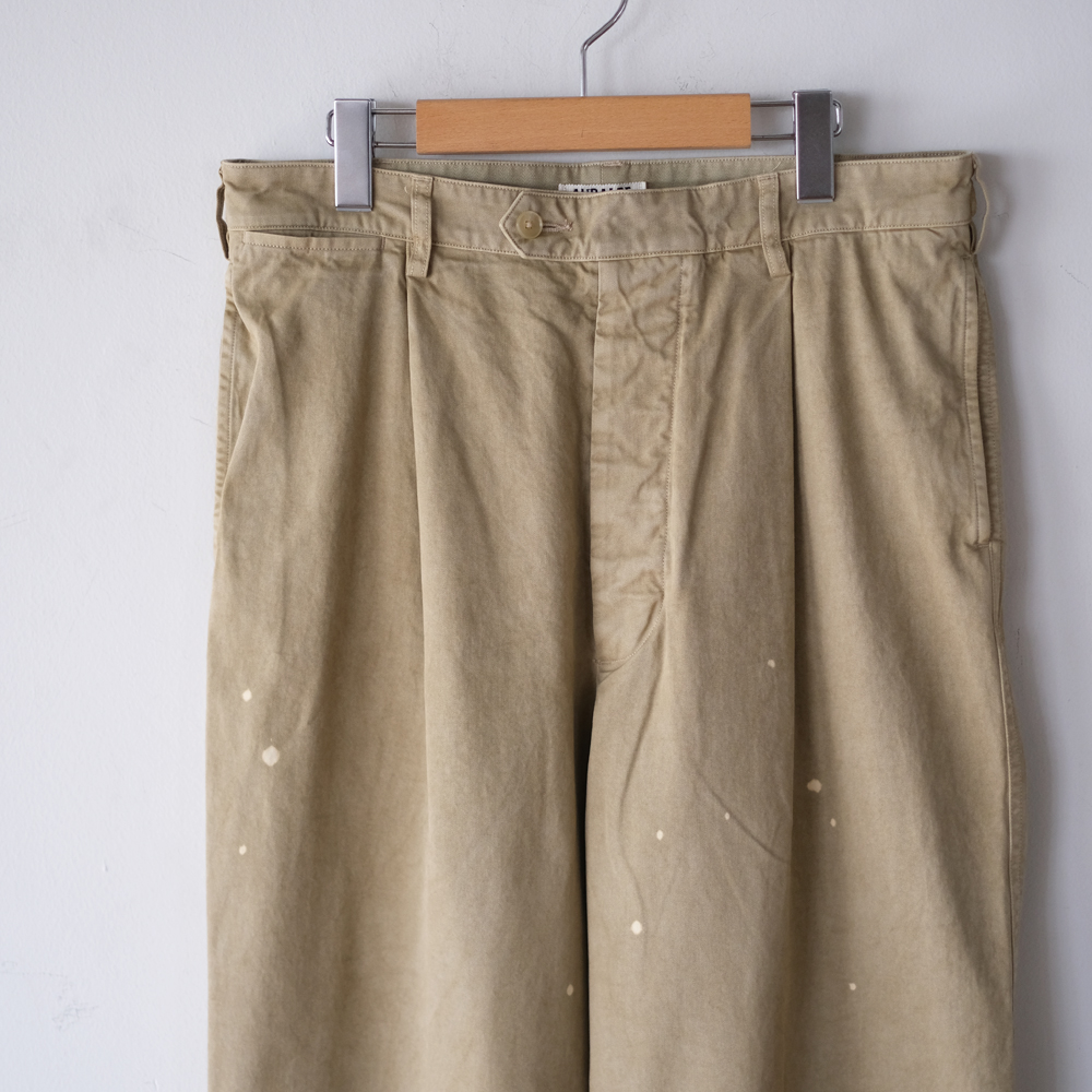 こちらはエジプト産の超長綿・フィンクスコットンを使用した、ライトウェイトのチノクロスになります。表面にはピーチ加工を施し、綿本来のナチュラルな風合いと程よい落ち感を引き立てています。さらに製品染めを施すことで、原料の上質さがいっそう際立ち、非常になめらかなタッチに仕上がっています。奥行きのある色合いとヴィンテージライクな表情も、この素材ならではの魅力となっております。
