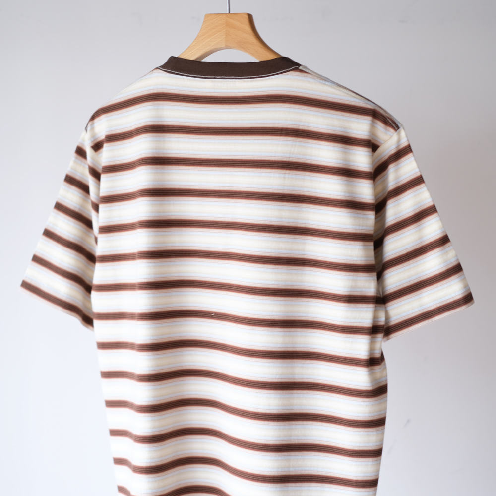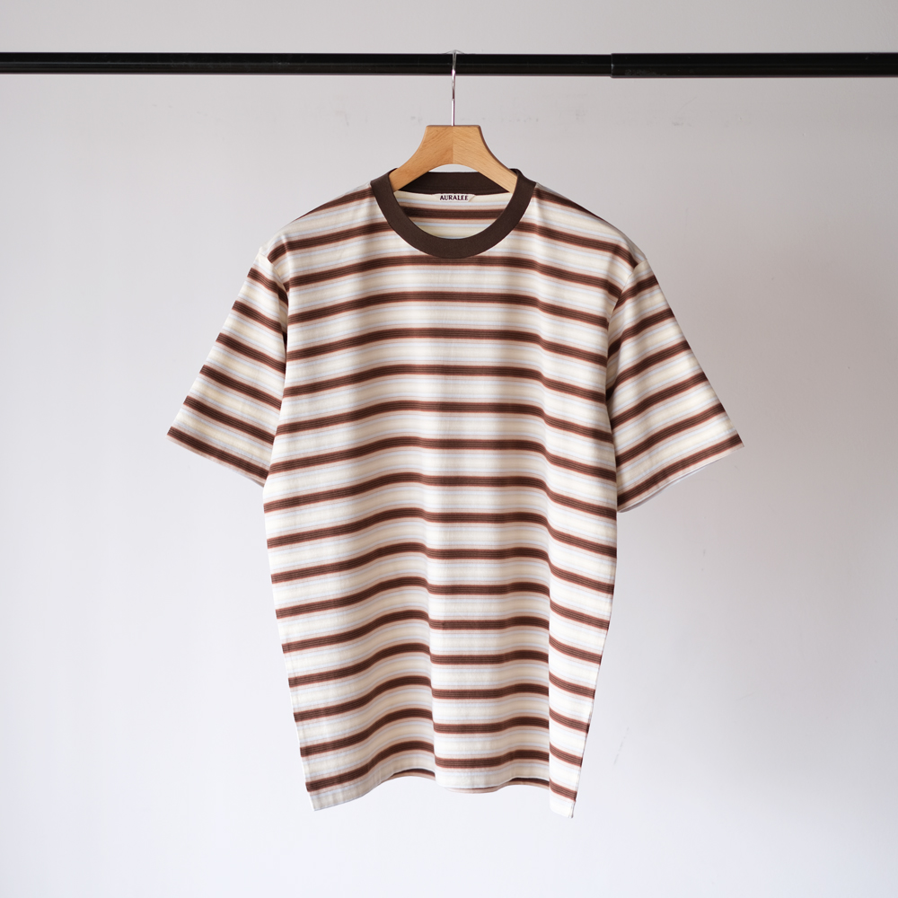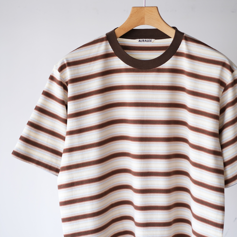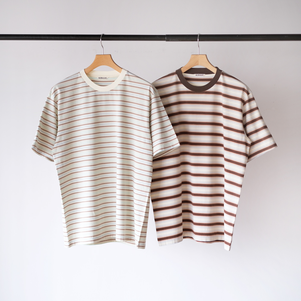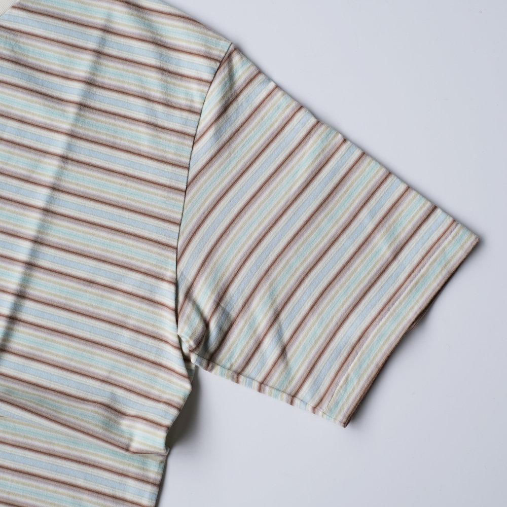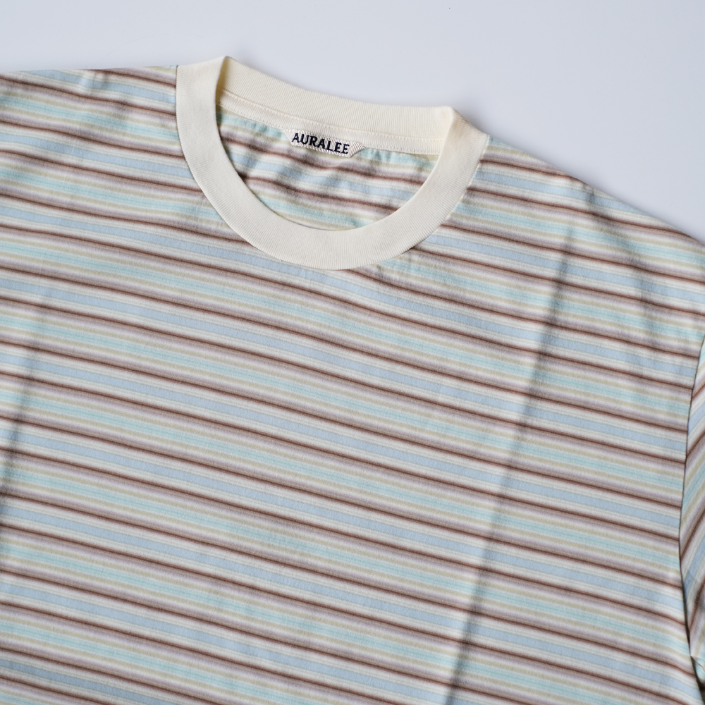 こちらはハイゲージの編み機を使用し、23色もの糸を巧みに組み合わせて編み上げたグラデーションボーダーの天竺素材になります。繊細な色の重なりが生み出す、奥行きのある美しい色彩が魅力の一着です。