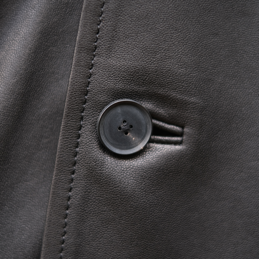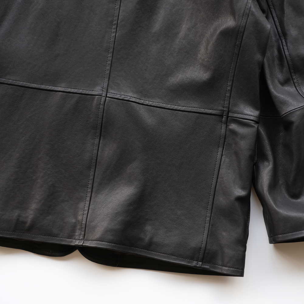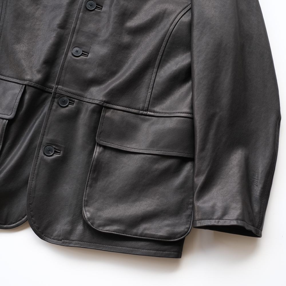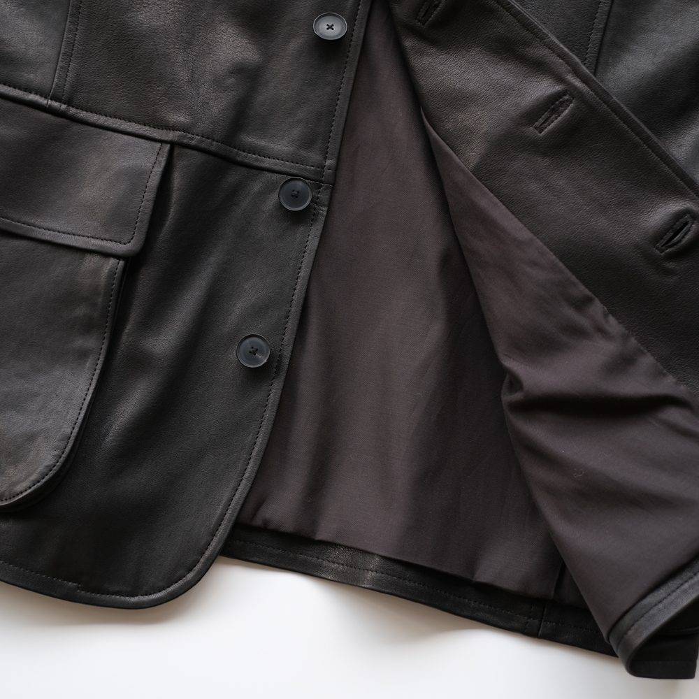 こちらは植物タンニンで鞣されたシープレザーならではの、ナチュラルなシボ感と上品な光沢が特徴のレザーブルゾンになります。顔料を用いないアニリン仕上げにより、原皮本来の風合いや表情が際立ち、使い込むほどに深みと艶が増していきます。天然素材ならではの美しさと、時間と共に豊かに変化していく風合いが魅力です。