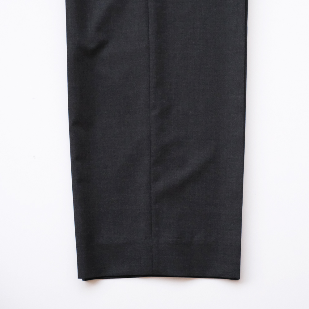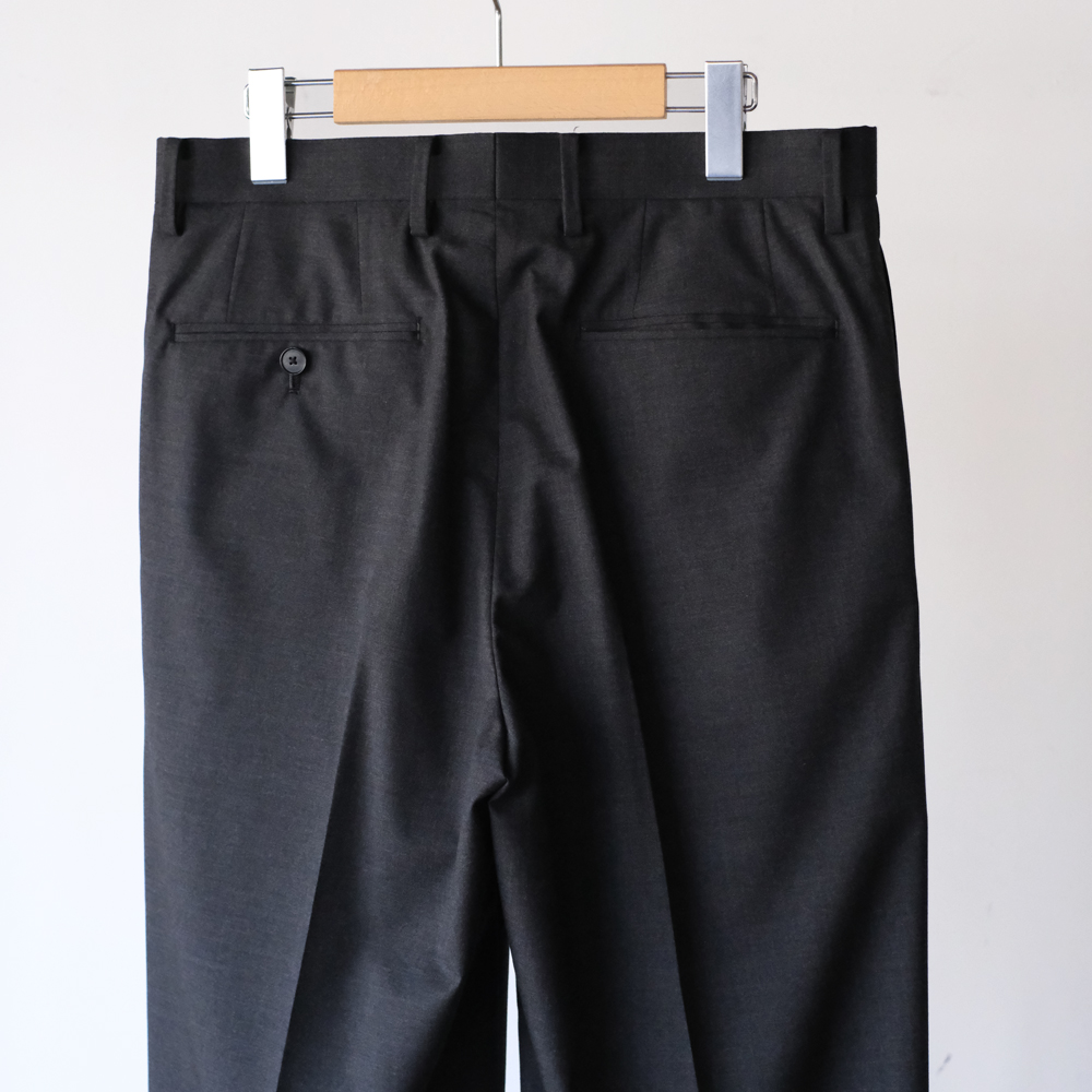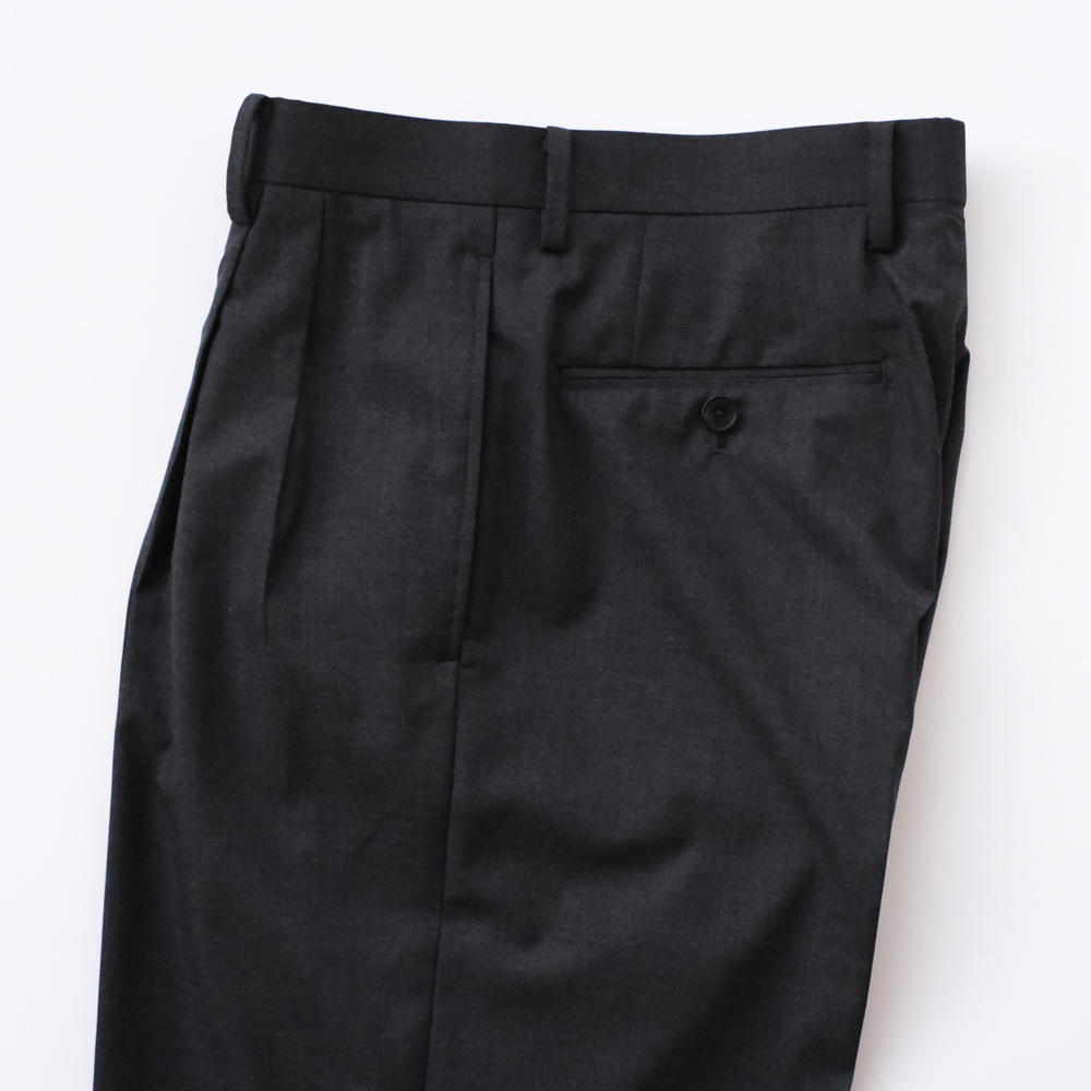 こちらのスラックスはスーパー180’sウールを使用した極細番手の糸を高密度に織り上げた、極薄のウールトロピカル素材になります。繊細な光沢と、肌に馴染むような滑らかさが特徴で、軽やかで上質なタッチに仕上がっています。