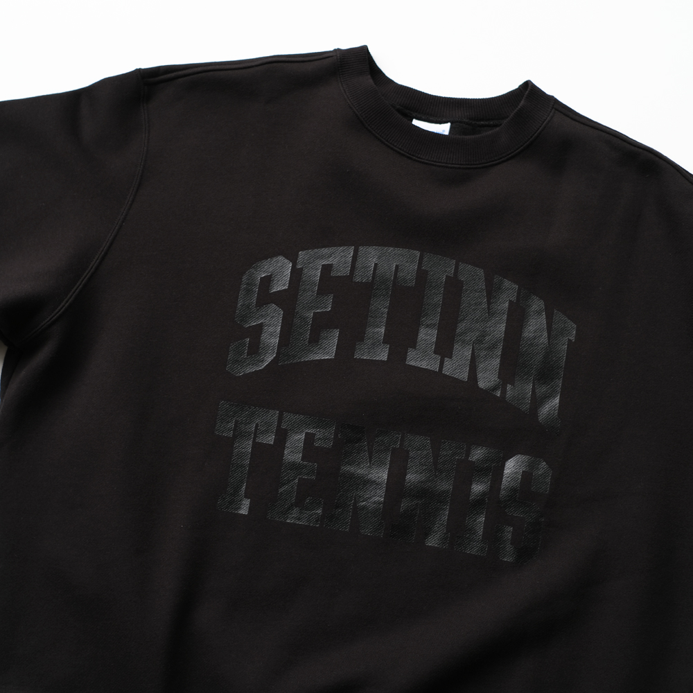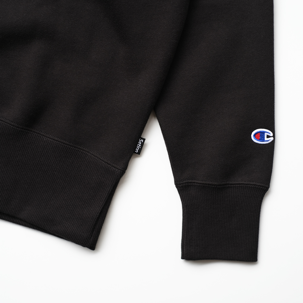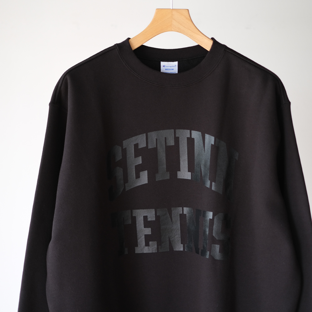 こちらはSetinnがChampionに別注をかけたクルースウェットになります。環境に配慮されたアメリカ綿とリサイクルポリエステルをブレンドした素材を使用しています。ポリエステル糸を芯としてその周りをコットンでカバーした特殊な糸を部分的に使用 肌触りの良いコットンの風合いを活かしつつ、コットン100%に比べて乾きやすく型くずれしにくいです 。 Setinn別注のフィット、ピスネームの差し込み、 ボディカラーによってプリント手法を変えたスペシャルなアイテムとなっております。