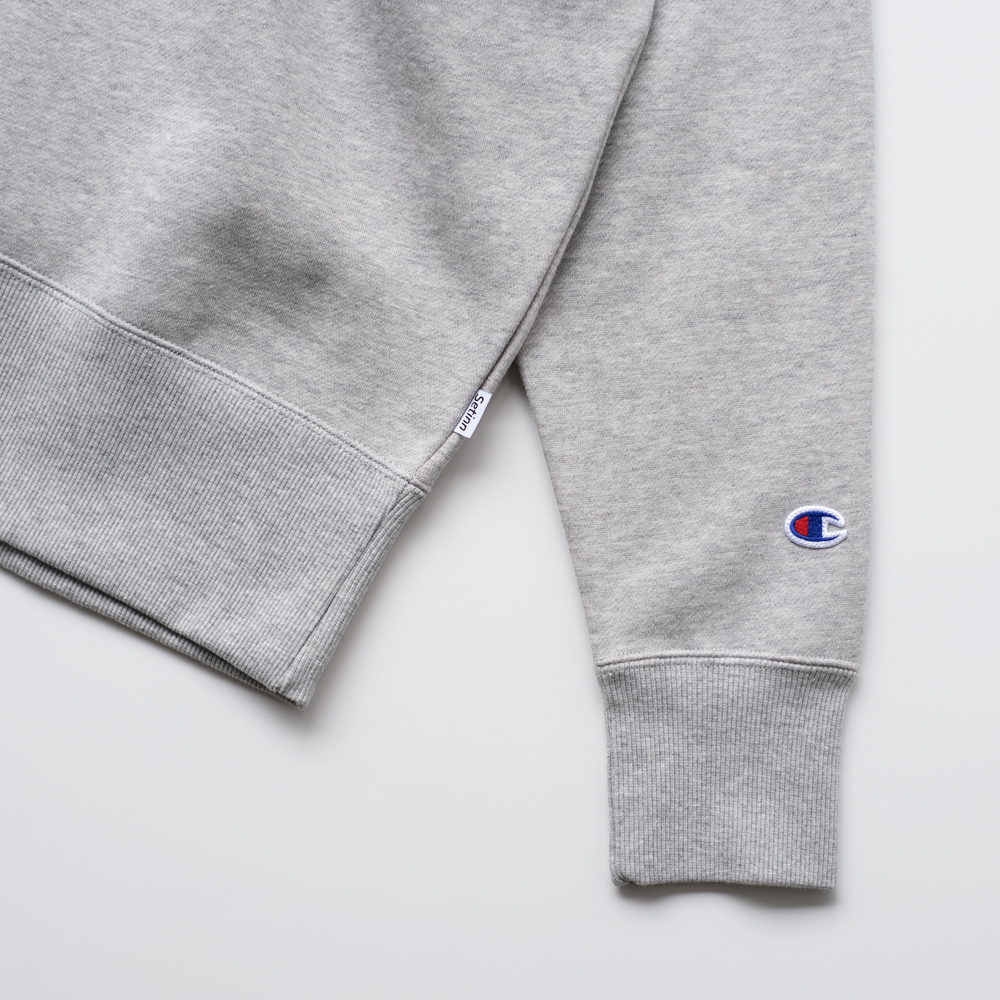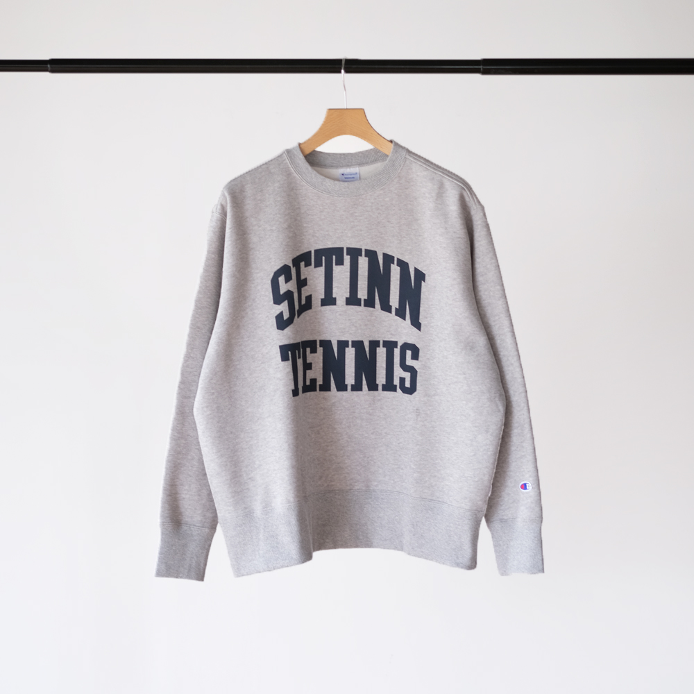 こちらはSetinnがChampionに別注をかけたクルースウェットになります。環境に配慮されたアメリカ綿とリサイクルポリエステルをブレンドした素材を使用しています。ポリエステル糸を芯としてその周りをコットンでカバーした特殊な糸を部分的に使用 肌触りの良いコットンの風合いを活かしつつ、コットン100%に比べて乾きやすく型くずれしにくいです 。 Setinn別注のフィット、ピスネームの差し込み、 ボディカラーによってプリント手法を変えたスペシャルなアイテムとなっております。