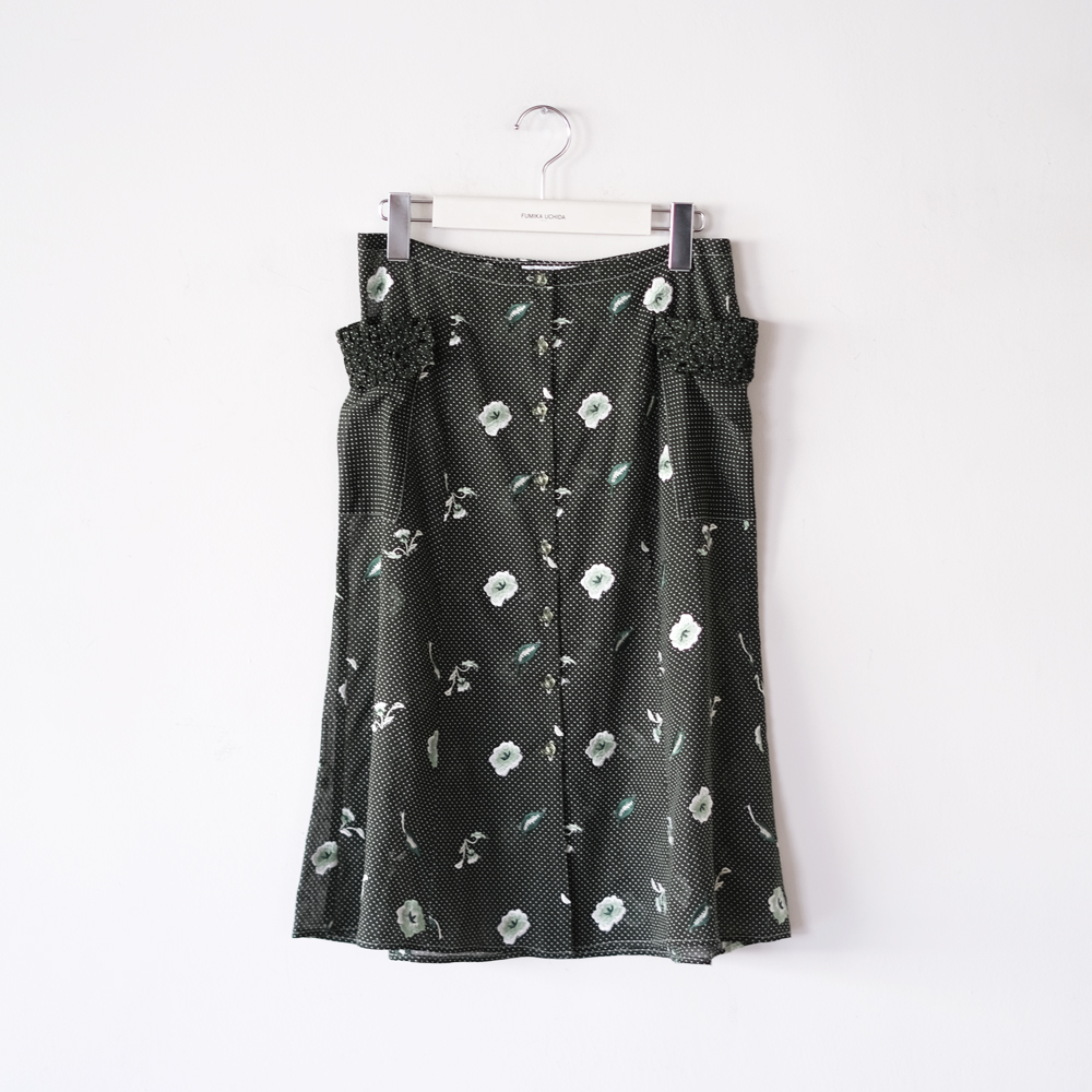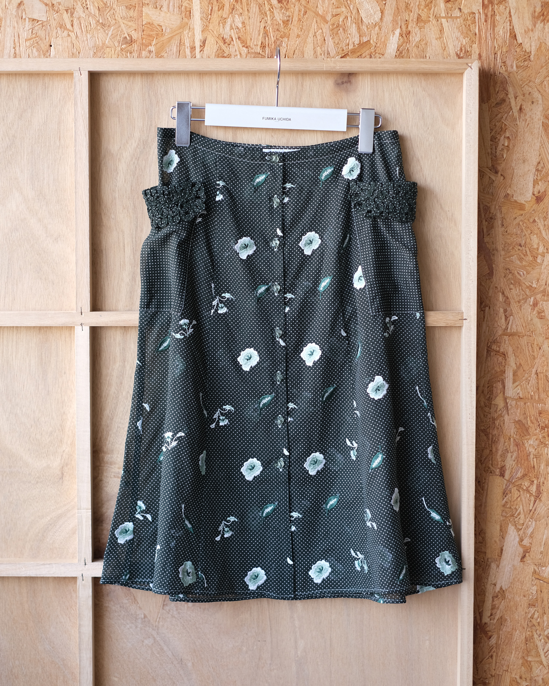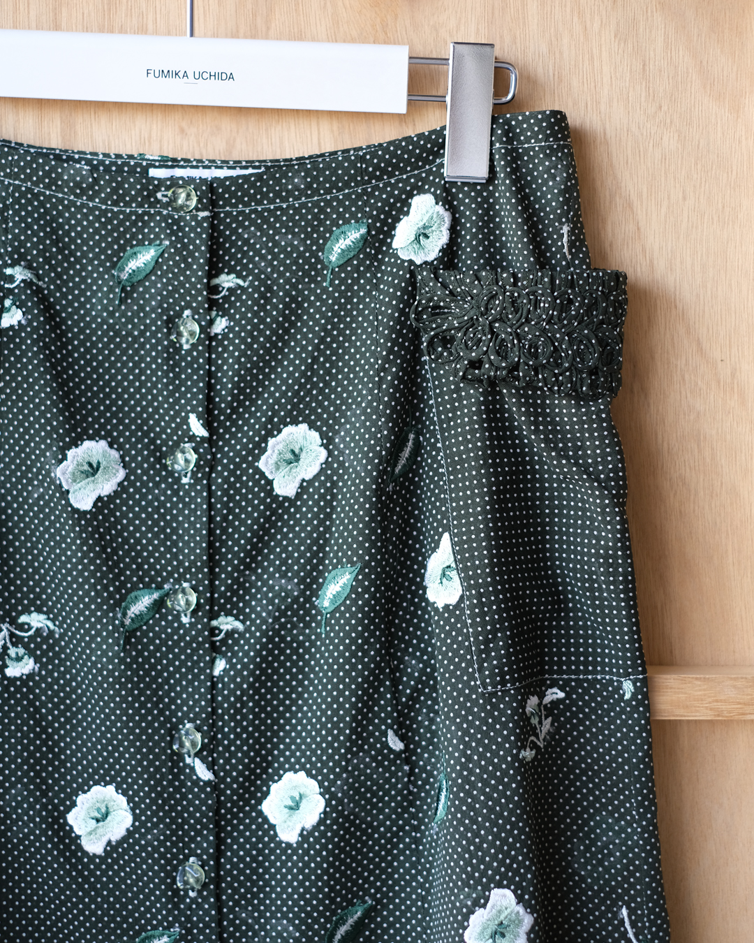 こちらは清涼感のあるコットンボイルに、ドットプリントと花柄の刺繍を組み合わせたミディスカートになります。腰位置に配したコード刺繍のエプロンポケットがクラシカルなアクセントを添え、コンパクトなアウトラインに立体感をもたらします。前立てにはオリジナルの彫刻ボタンが付き、ワンウォッシュの天日干し加工が施されております。