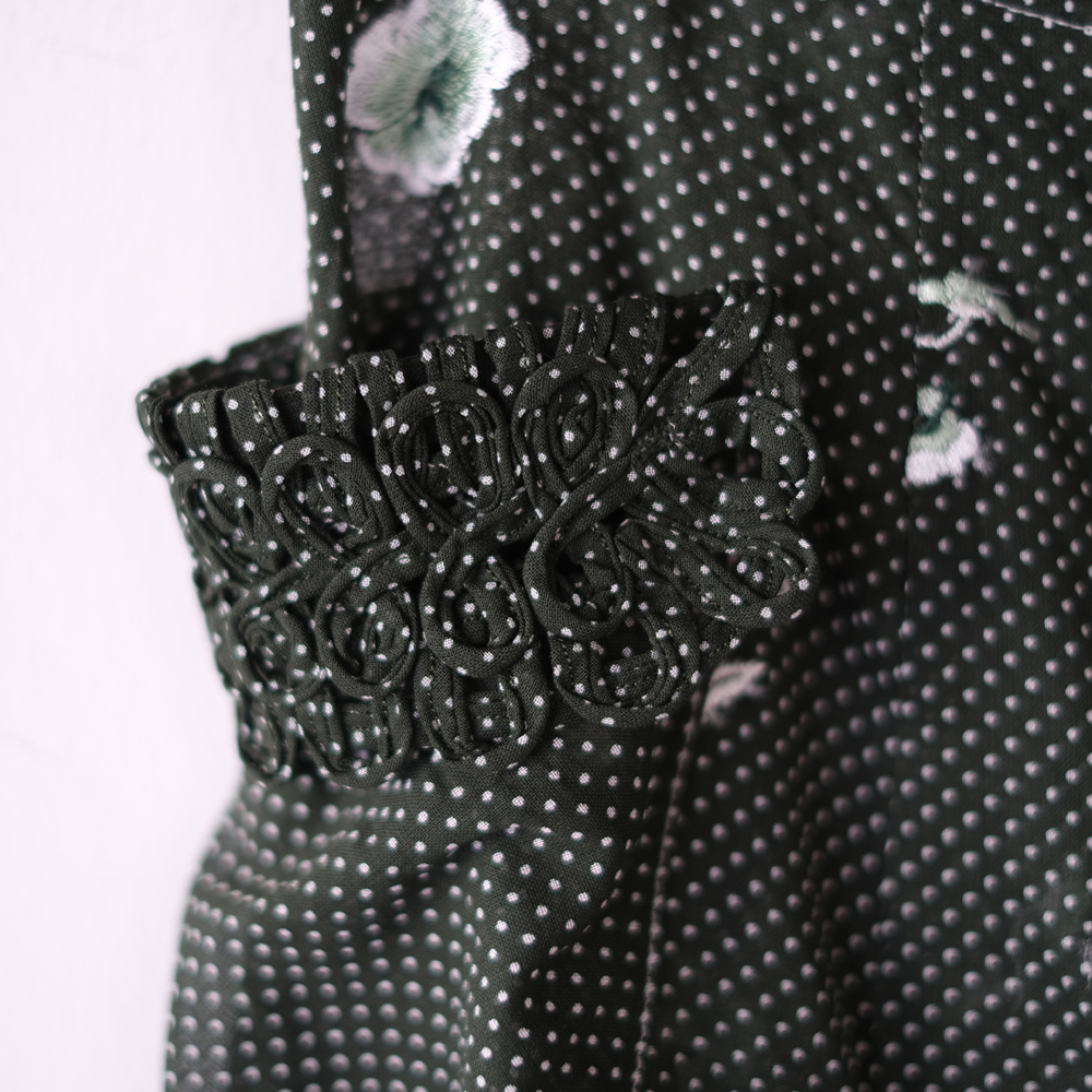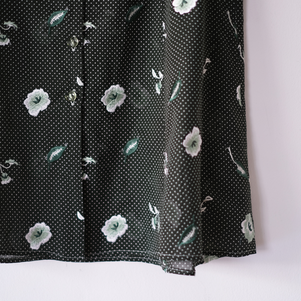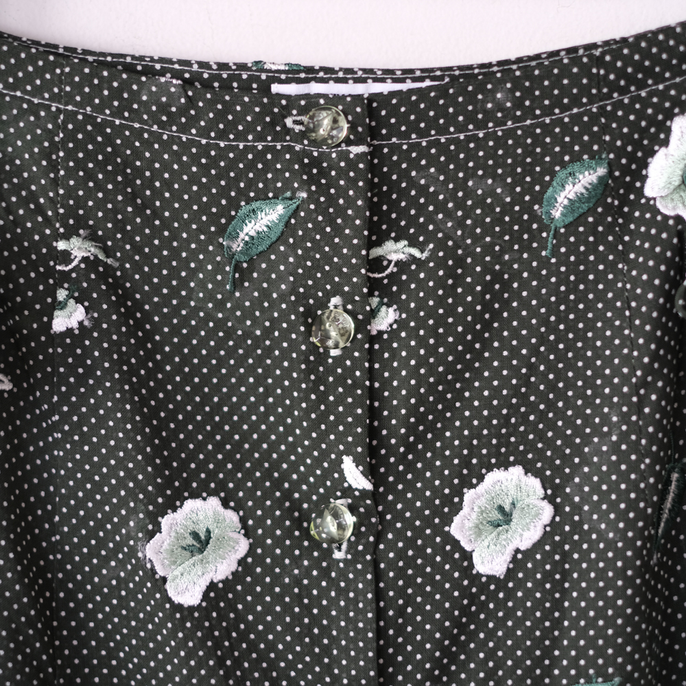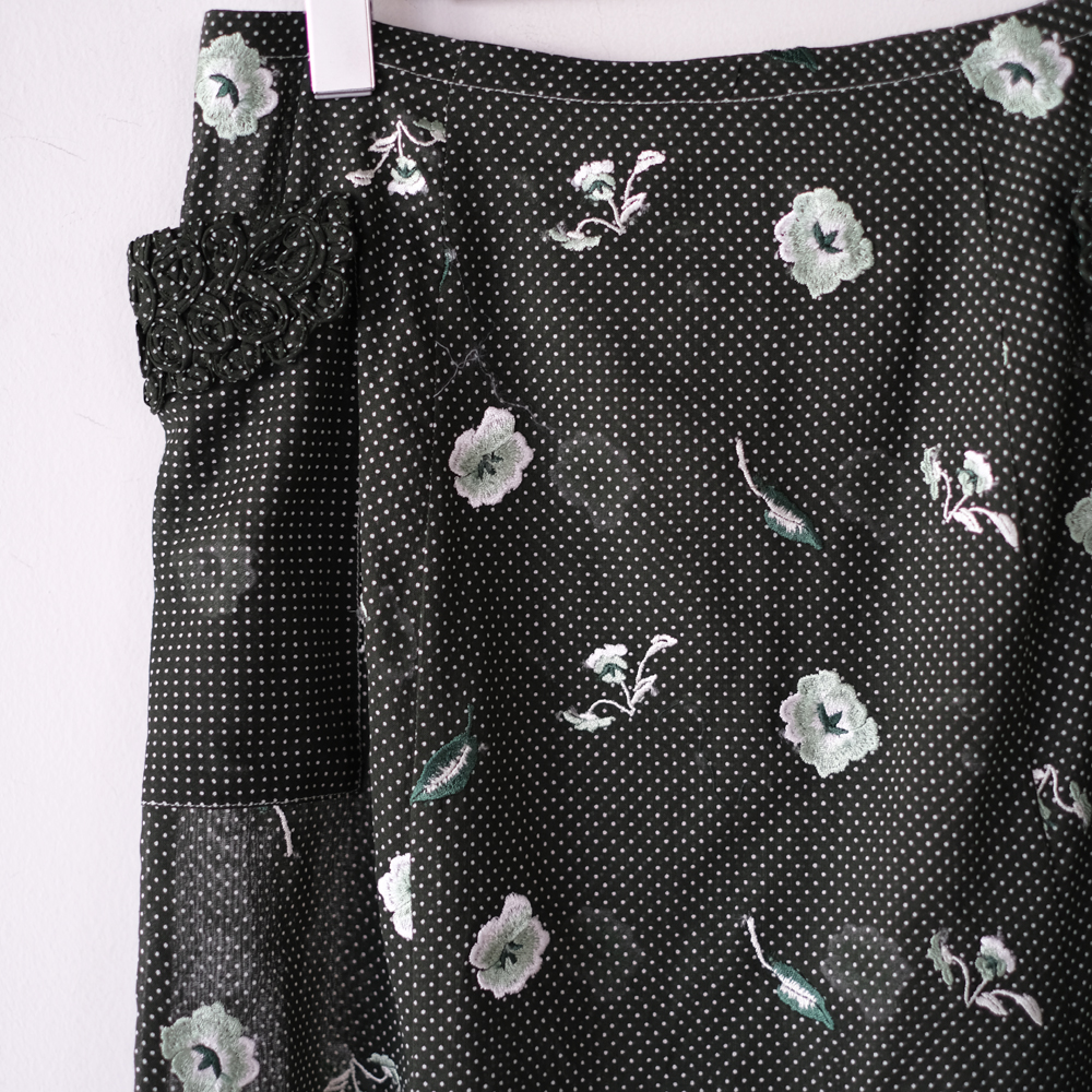 こちらは清涼感のあるコットンボイルに、ドットプリントと花柄の刺繍を組み合わせたミディスカートになります。腰位置に配したコード刺繍のエプロンポケットがクラシカルなアクセントを添え、コンパクトなアウトラインに立体感をもたらします。前立てにはオリジナルの彫刻ボタンが付き、ワンウォッシュの天日干し加工が施されております。