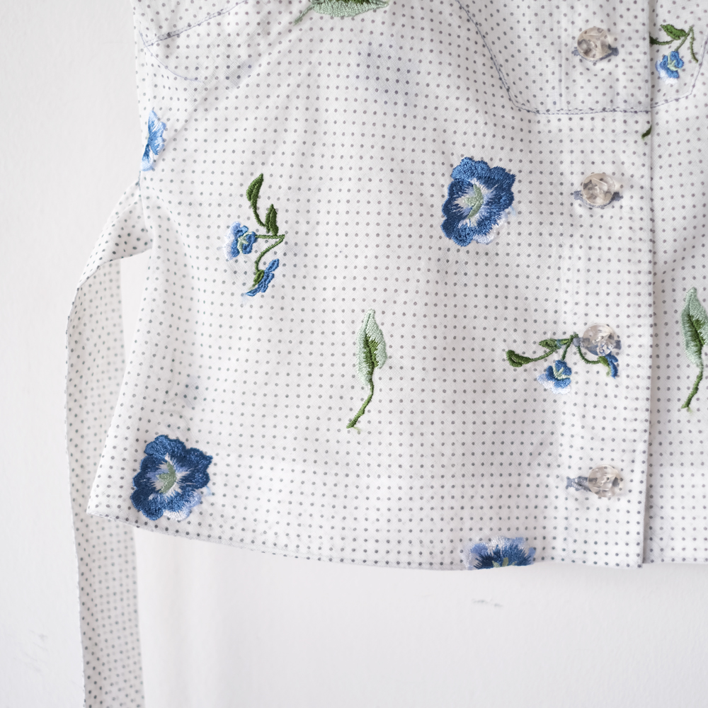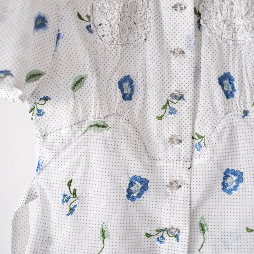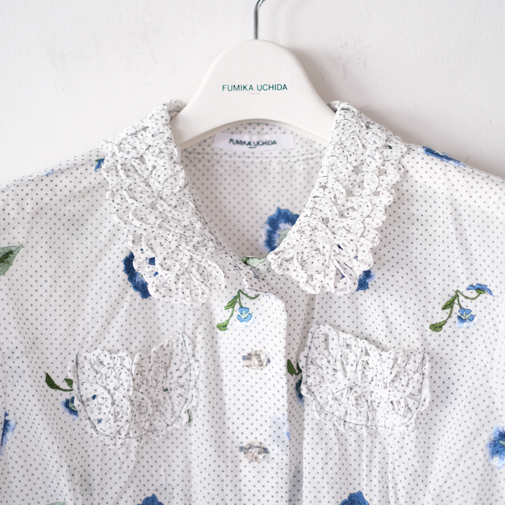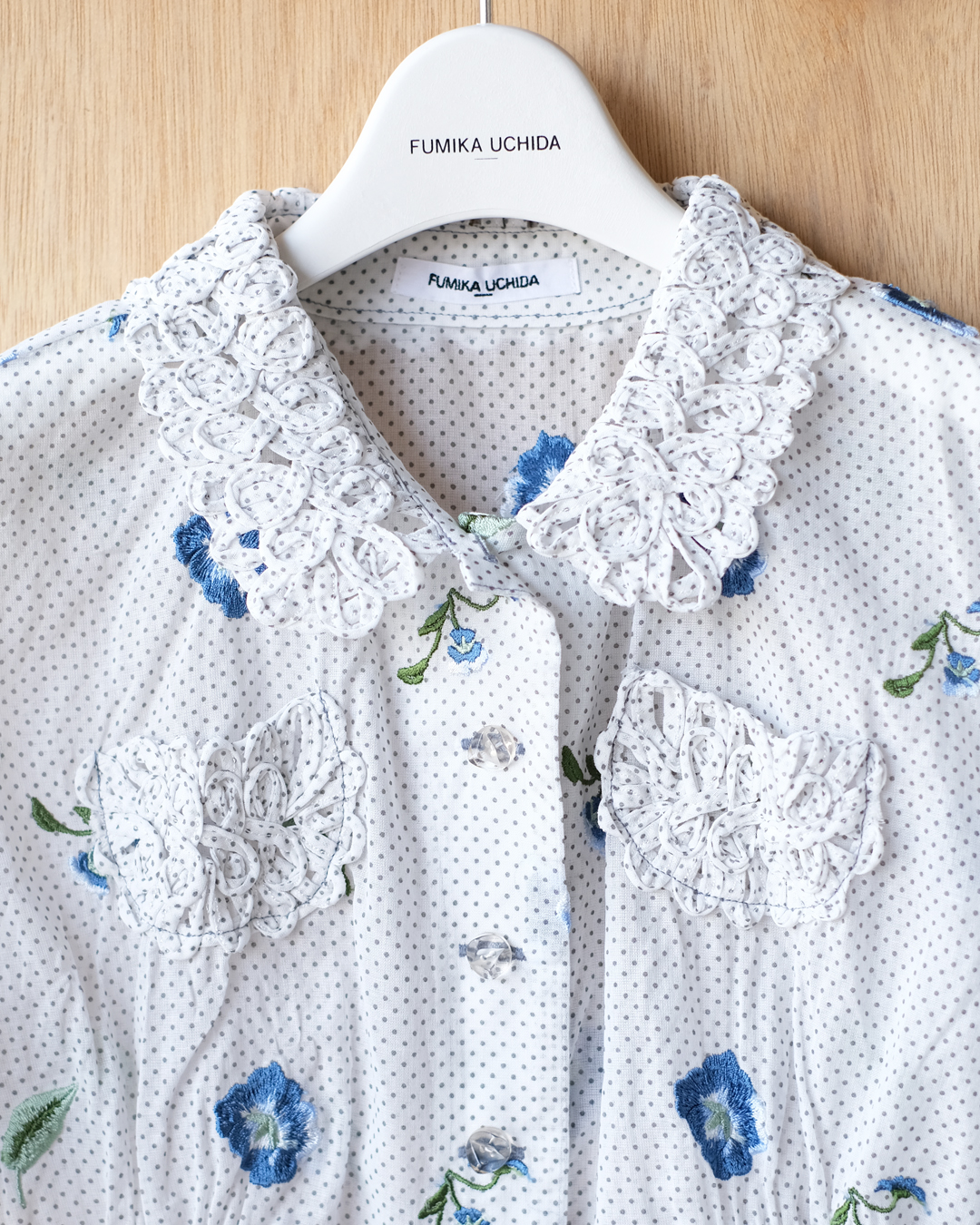 こちらは清涼感のあるコットンボイルに、ドットプリントと花柄の刺繍を組み合わせたシャツになります。コード刺繍で整形する襟とポケットがクラシカルなムードを引き立て、コンパクトなシルエットに自然な立体感を添えています。前立てはオリジナルの彫刻ボタン開きで、ワンウォッシュの天日干し加工を施しています。