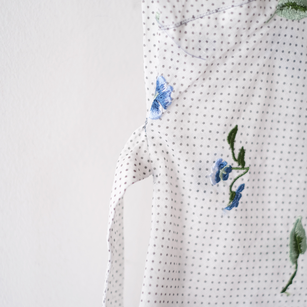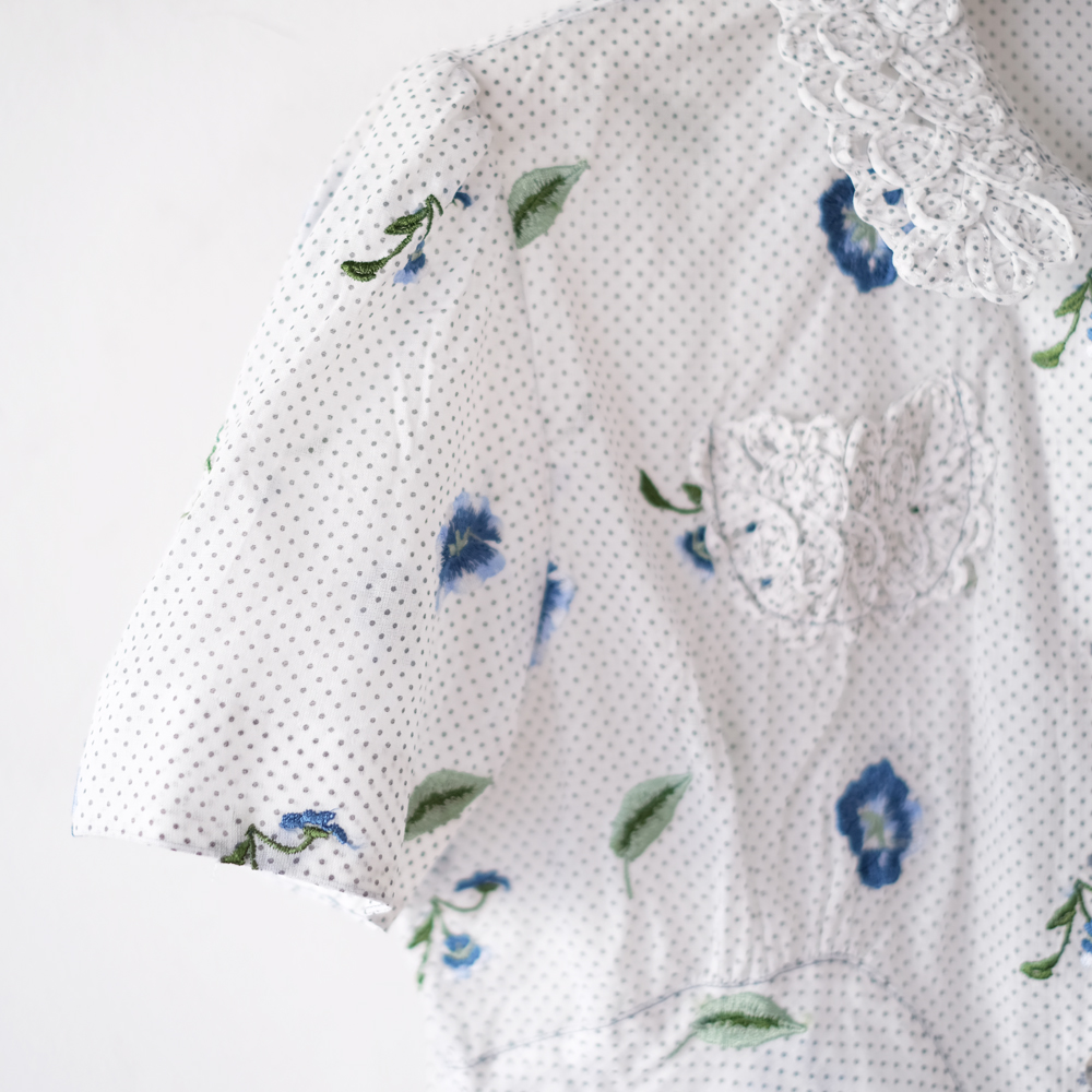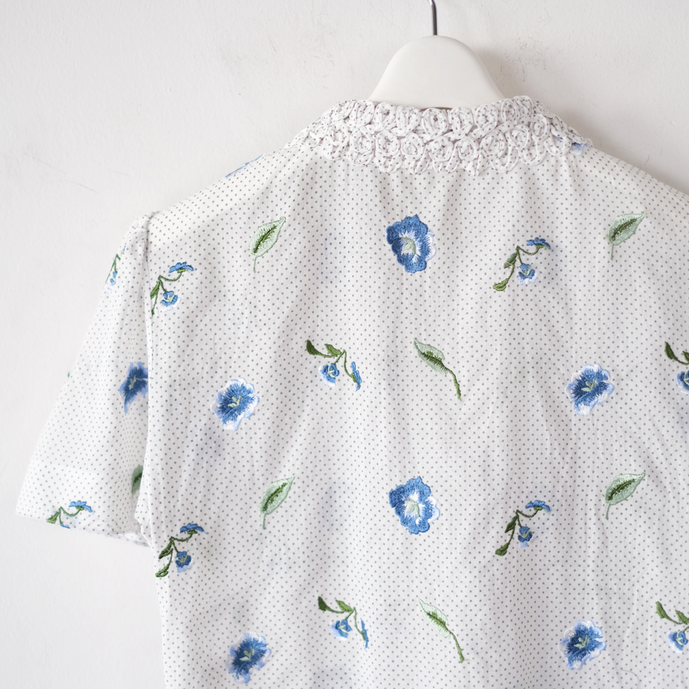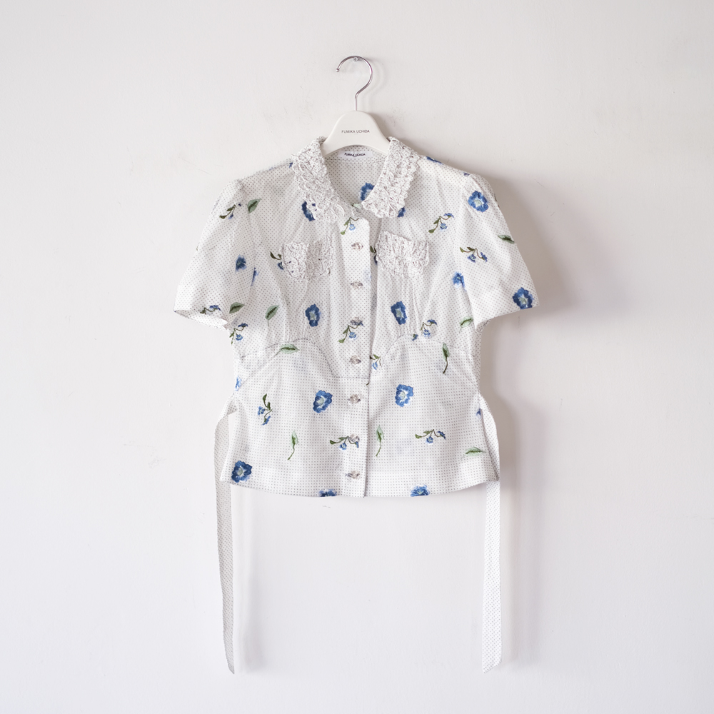 こちらは清涼感のあるコットンボイルに、ドットプリントと花柄の刺繍を組み合わせたシャツになります。コード刺繍で整形する襟とポケットがクラシカルなムードを引き立て、コンパクトなシルエットに自然な立体感を添えています。前立てはオリジナルの彫刻ボタン開きで、ワンウォッシュの天日干し加工を施しています。