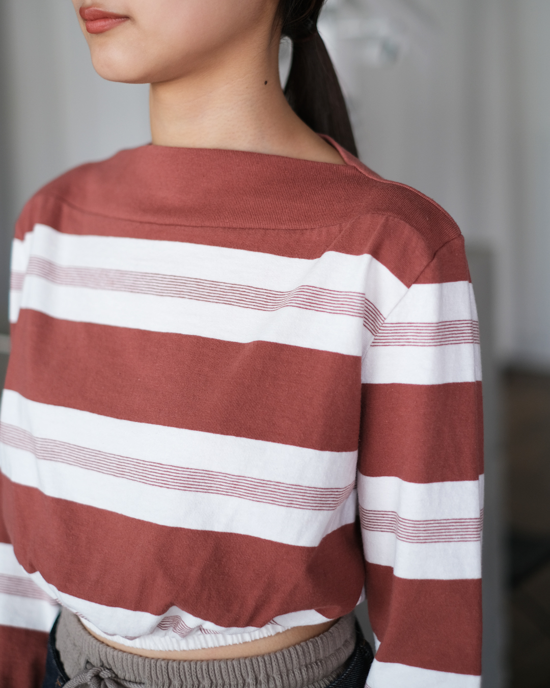 こちらはヴィンテージライクな粗野さのあるコットン糸を使用したオリジナルのボーダー柄生地で作られたクロップド丈のロングスリーブTシャツになります。リブ素材をワイドに切り替えた立体感のあるボートネックシルエットとなります。