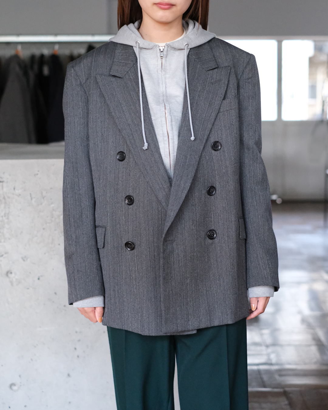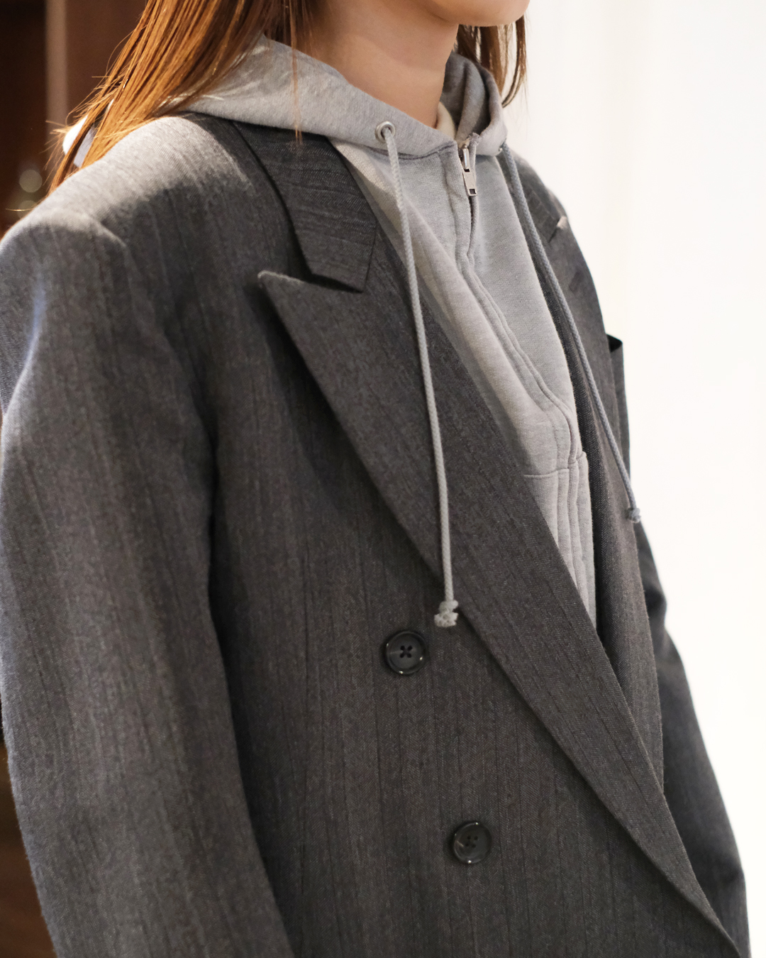 こちらは上品なヘリンボーン織で杢調の深みのあるグレーが奥行きのある表情を生み出すスーチング素材を使用したピークドラペルダブルブレストジャケットになります。レーヨンをブレンドすることで程よい落ち感と柔らかなドレープ、開き止まりをやや深めに設定することでVゾーンに抜け感をもたらし、シャープかつモダンな印象に仕上げられています。