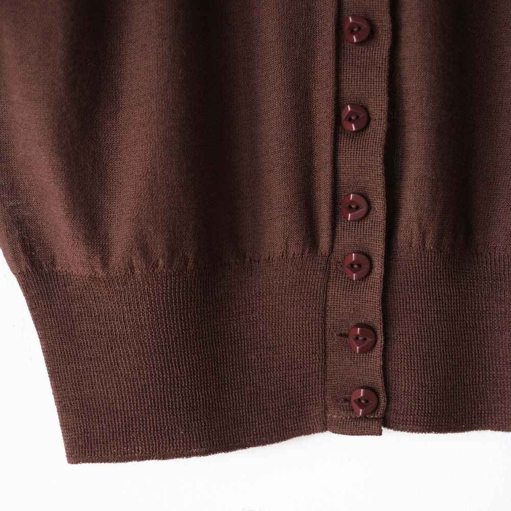 こちらは上質なメリノウールの未防縮糸を強撚し、編み上げられたロングスリーブカーディガンになります。未防縮糸ならではの膨らみと、ガーゼ調の編み地による繊細な透け感が、軽やかな印象を生み出します。コンパクトなシルエットにオリジナルの彫刻ボタンが立体感を添えてくれます。