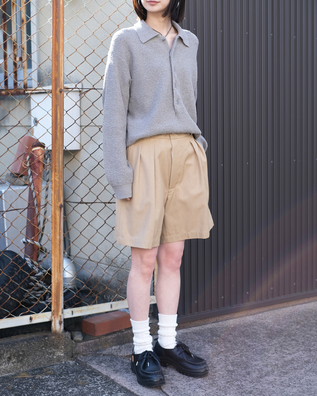 こちらはヴィスコースコットンの程よいドレープ感をもつツイル生地で仕立てられた2タックショーツになります。フロントはボタンアップ仕様で、後身右側にヒップポケットを配しております。またオリジナルのメタルボタンを使用しております。