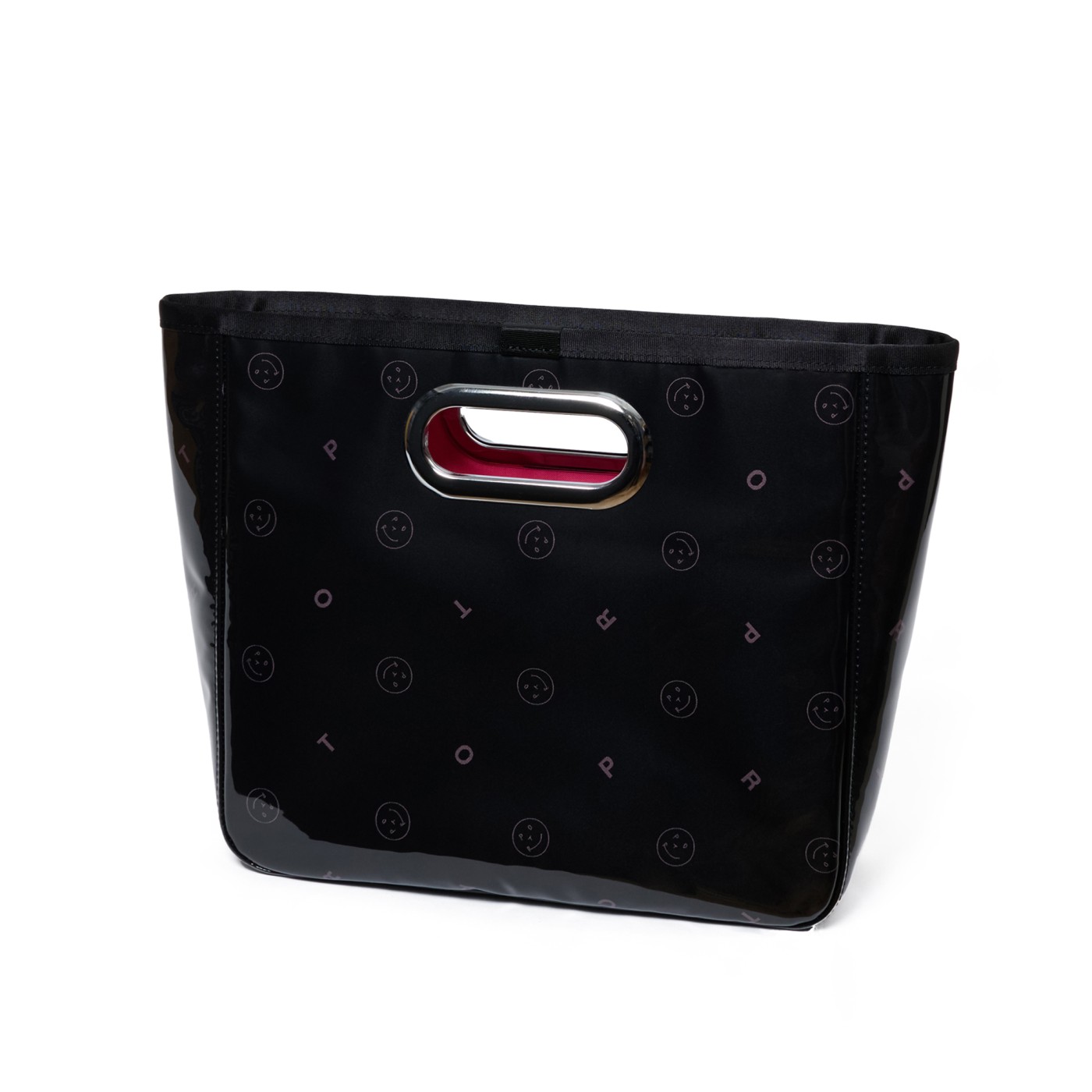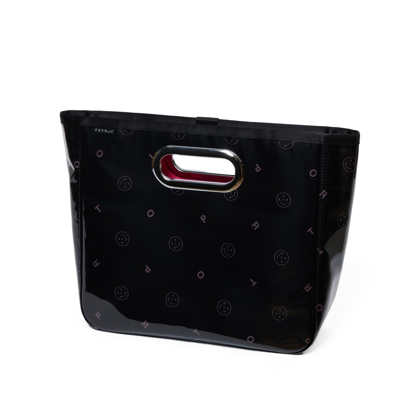 美しく繊細なジャカード織りの生地に、グロッシーなPVC素材を纏わせたバッグ本体は、光を受けてつやを放ちます。