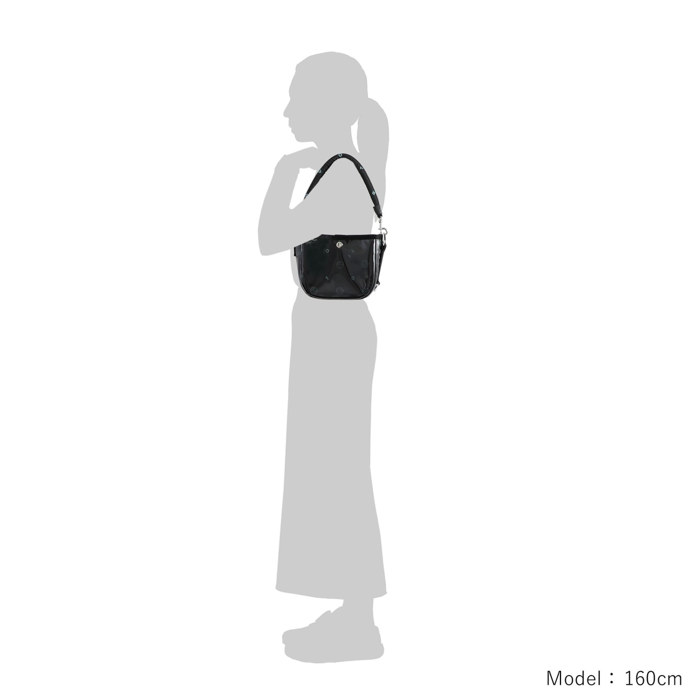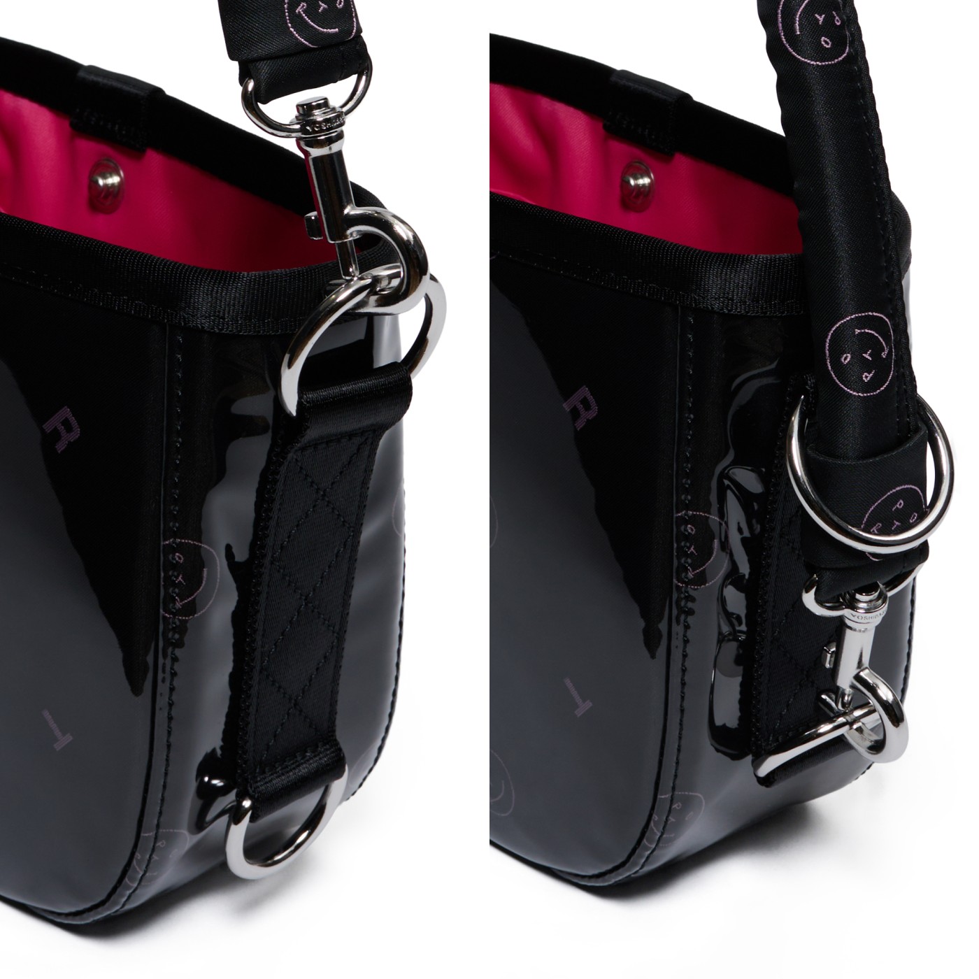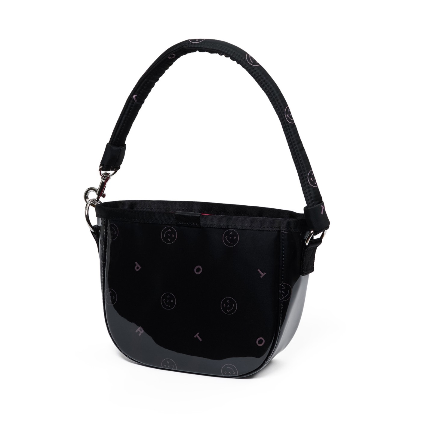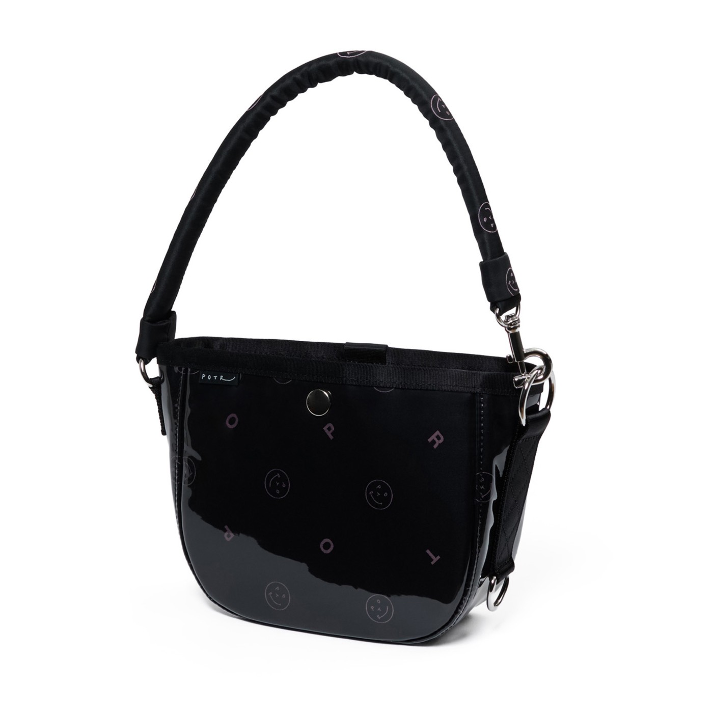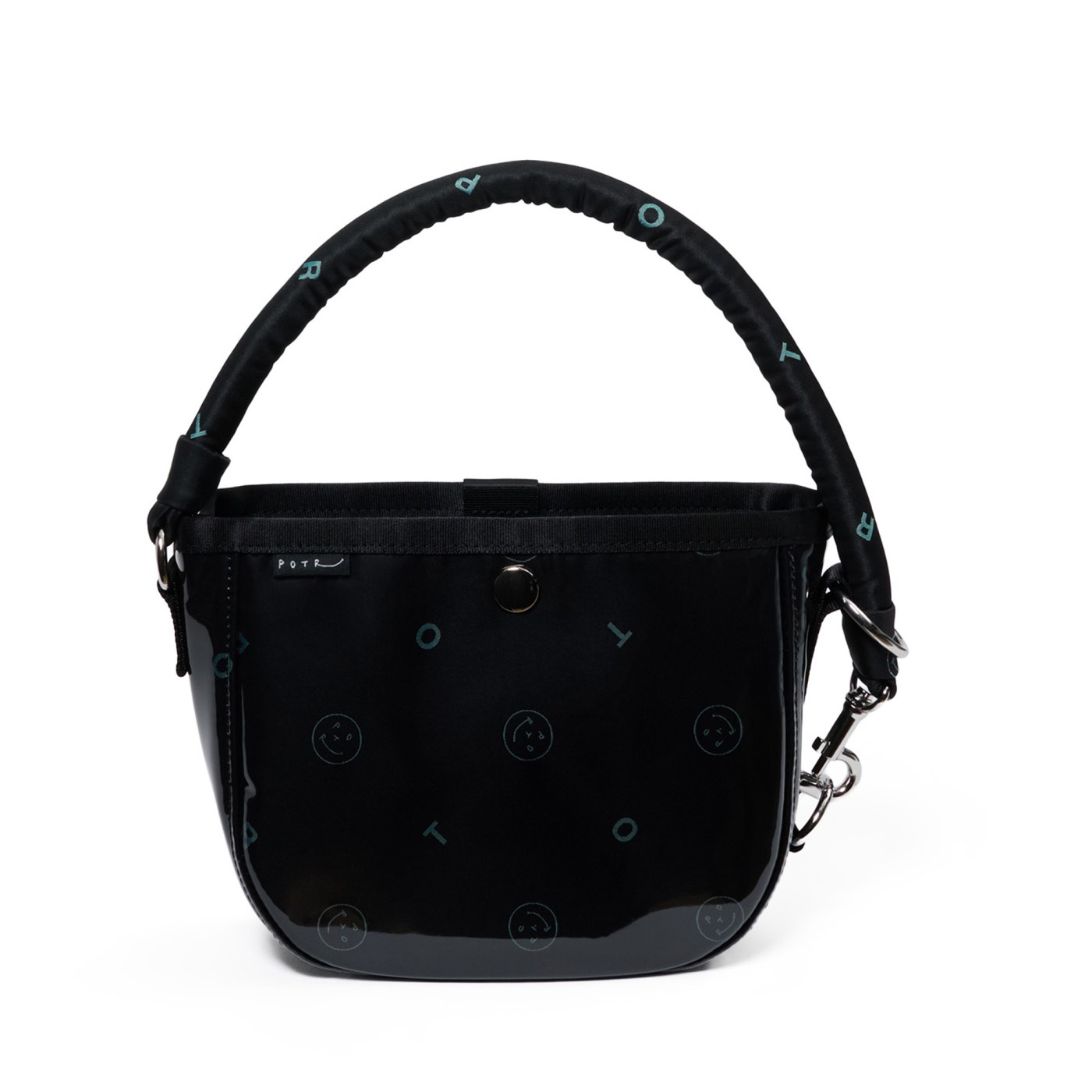 美しく繊細なジャカード織りの生地に、グロッシーなPVC素材を纏わせたバッグ本体は、光を受けてつやを放ちます。