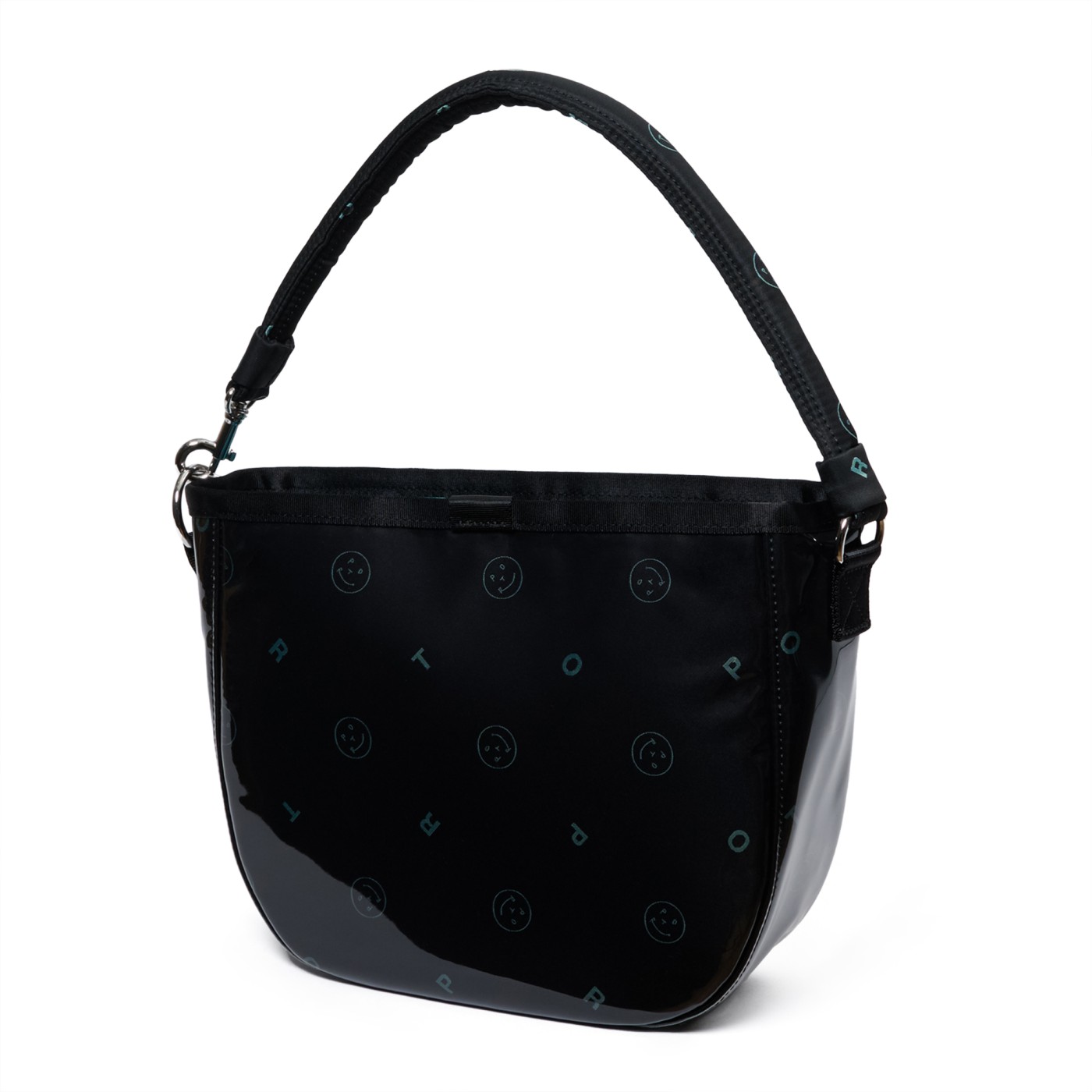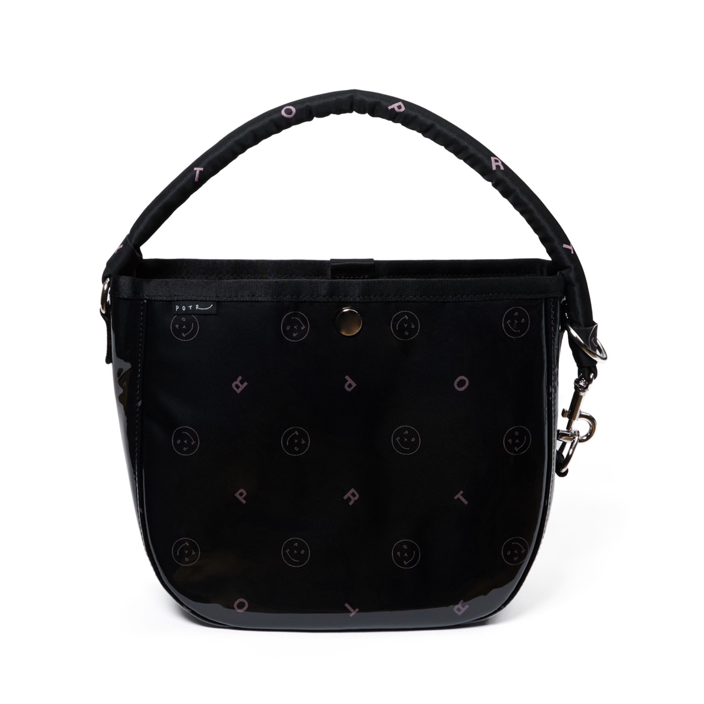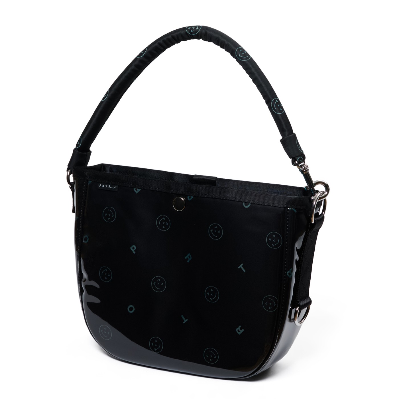 美しく繊細なジャカード織りの生地に、グロッシーなPVC素材を纏わせたバッグ本体は、光を受けてつやを放ちます。