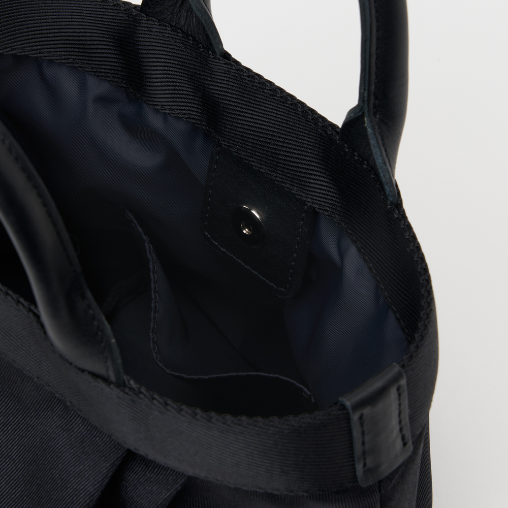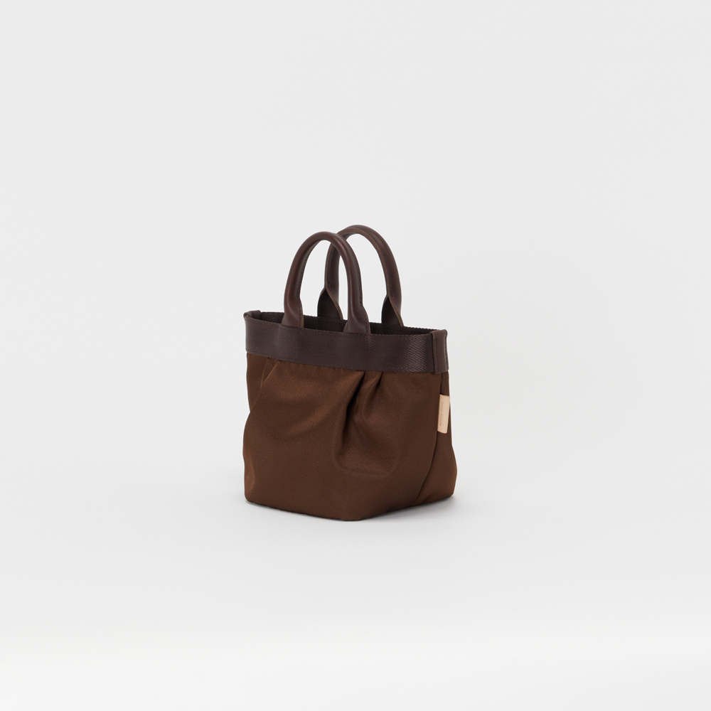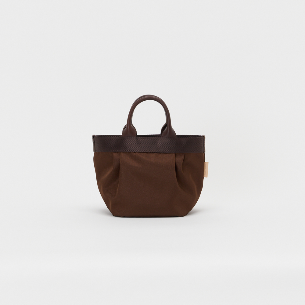 こちらはパンツのタックに着想を得た立体的なフォルムが特徴の新作バッグになります。軽量で光沢のあるナイロンツイルに、厚手のナイロンテープとレザーハンドルを組み合わせることで、実用性と上質さを両立させました。ボディと裏地の両面には弱撥水を施し、日常使いにも適しています。財布や携帯が収まるコンパクトなサイズで、ちょっとしたお出掛けに最適です。