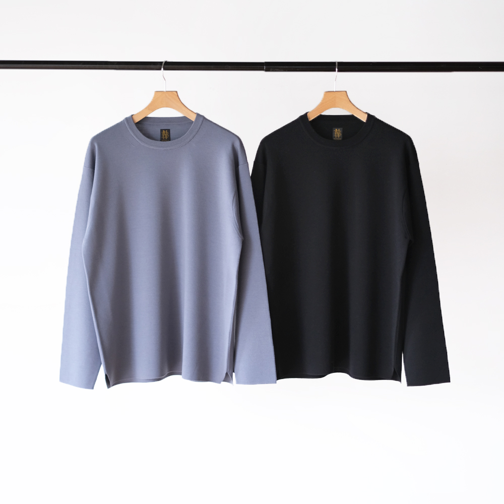 こちらは世界最高峰のハイゲージ編み機で細番手のウール糸をスムース組織で編み立てたクルーネックニットになります。超ハイゲージで軽く、且つハイゲージの弱点となり得るへたりやすさ・シワになりやすさを克服した取り扱いのしやすい頼れるニットです。滑らかさと膨らみの強いウールを使用しており、袖口や裾に縫製の縫い目が入らいないニットブランドならではの拘りの一着です。