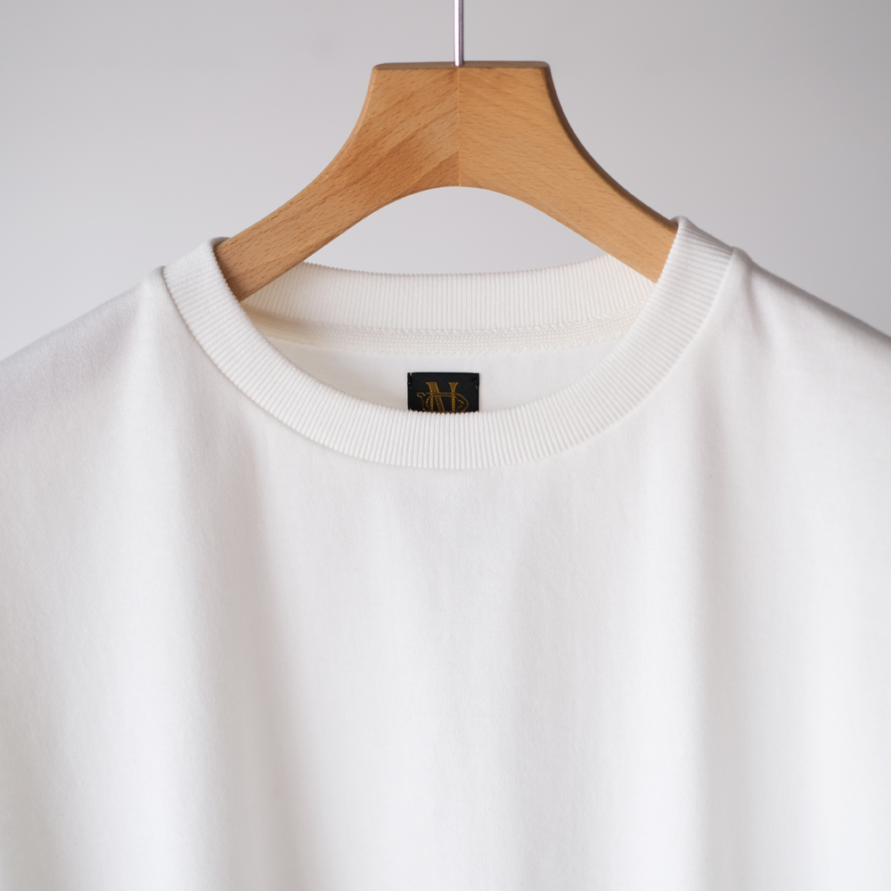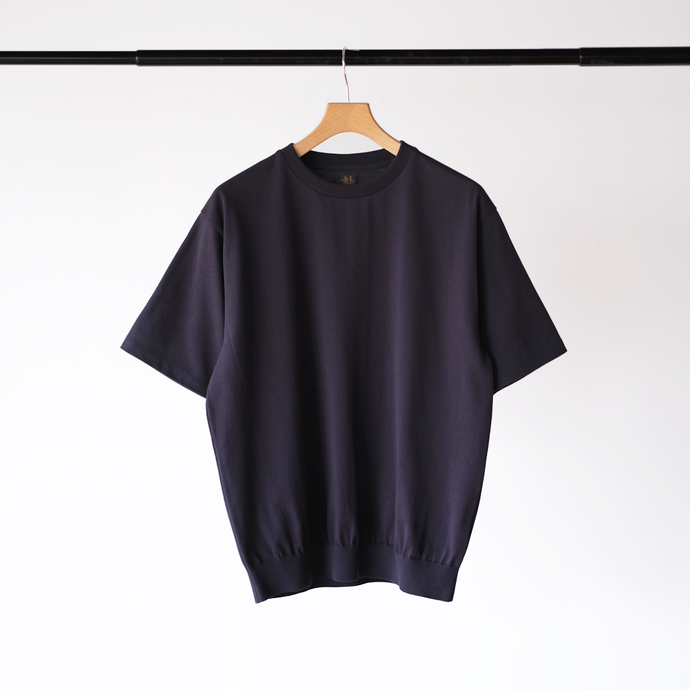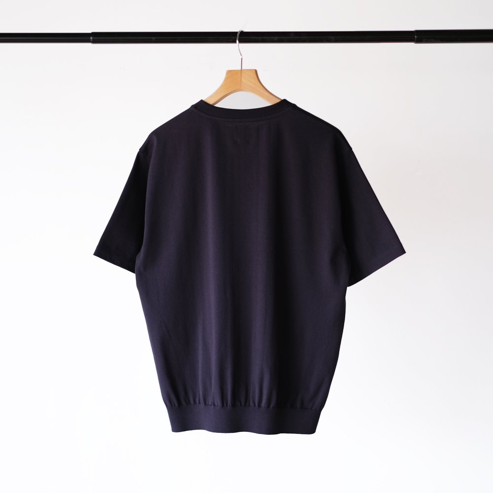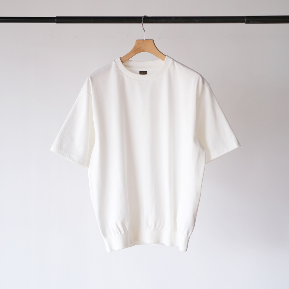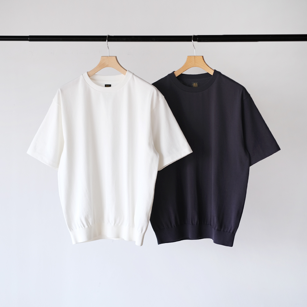 こちらは超長綿の毛羽立ちを抑えるためにコンパクト紡績した糸を使用し、しっかりと度詰めで編み立てた一枚になります。裾はニットならではの編み続きでリブ仕様に仕上げ、自然なブラウジングが生まれるシルエットとなっております。ナチュラルな光沢と立体感のあるフォルムが魅力で、ニットブランドならではのこだわりが感じられるシリーズです。
