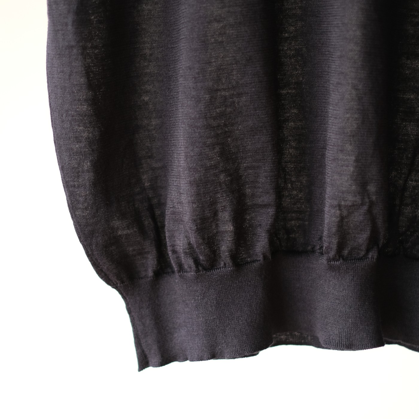 こちらは光沢感と清涼感が特徴のロイヤルラミーを極細番手に紡績した繊細な糸を使用しております。ハイゲージの編機でゆっくりと編み立てており、ラミー特有のハリコシと透け感、凹凸やシボ感が感じられる表情豊かで肌離れの良い商品となっています。