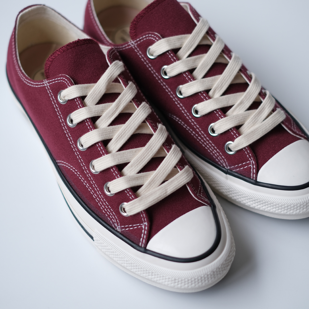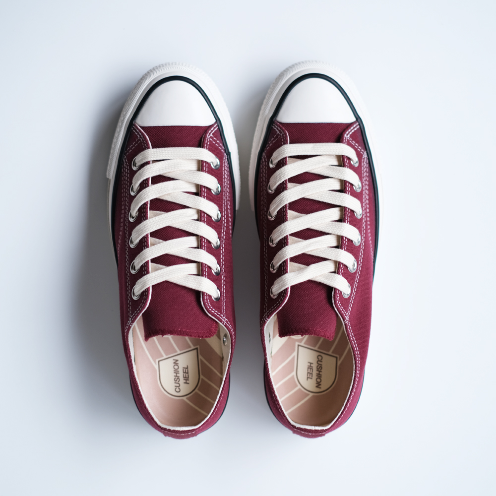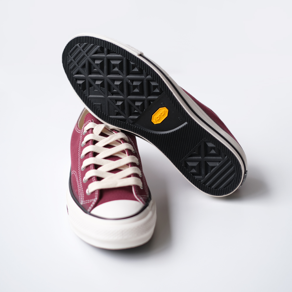 こちらはヴィンテージ市場でも人気の高い「マルーン」カラーのOXカットがリリースされました。アッパーはこれまでと変わらず国産シャトル織り機で紡いだ風合い豊かなキャンバスを使用し、1960年代のALL STARに見られる三ツ星ヒールラベルやサイドステッチ、ソールの糊がはみ出しているヴィンテージディテール等を再現しながらもE.V.Aと「PORON®」の2重構造とTPUシャンクを搭載したカップインソール、防滑性と耐摩耗性に優れ全天候に対応した「HIGH PERFORMANCE RUBBERCOMPOUND」の「VIBRAM® MEGAGRIP」ソールなど、ハイスペックな機能を搭載し快適な履き心地を実現しています。