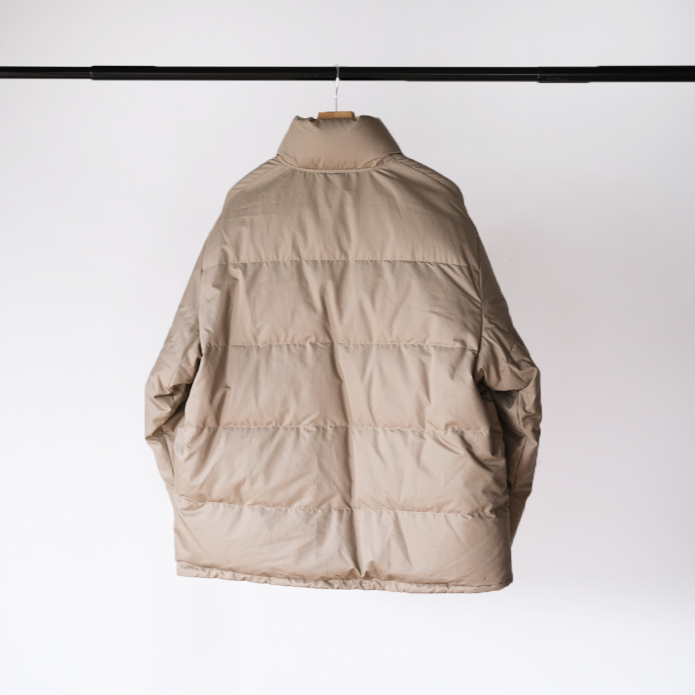 こちらは上質な細番手コットンを使用した超高密度コットンサテン素材のダウンジャケットになります。 特殊なシリコン加工を施し適度なハリ感と撥水性を持たせた素材です。
