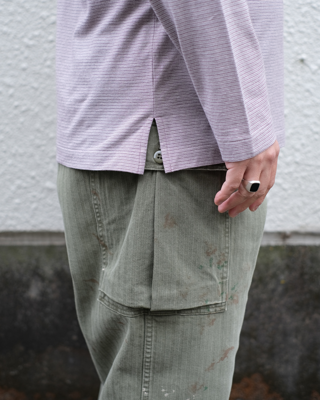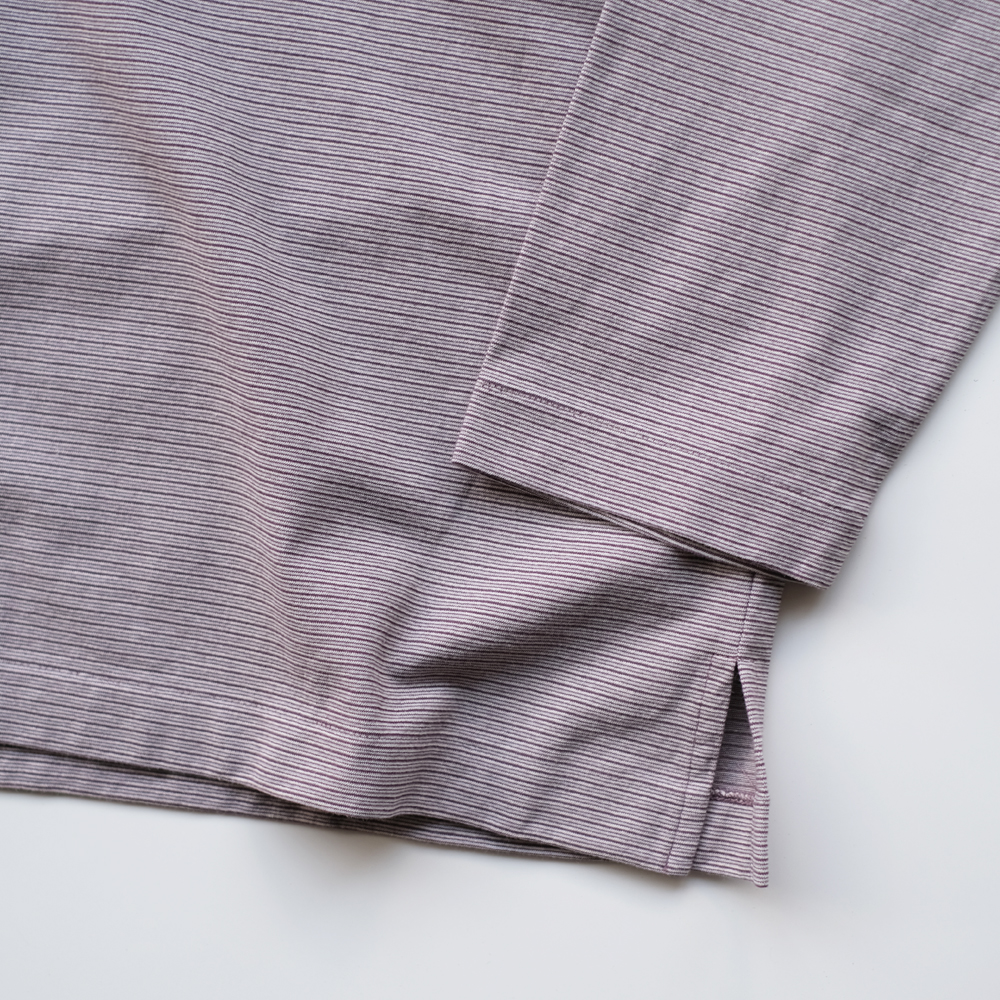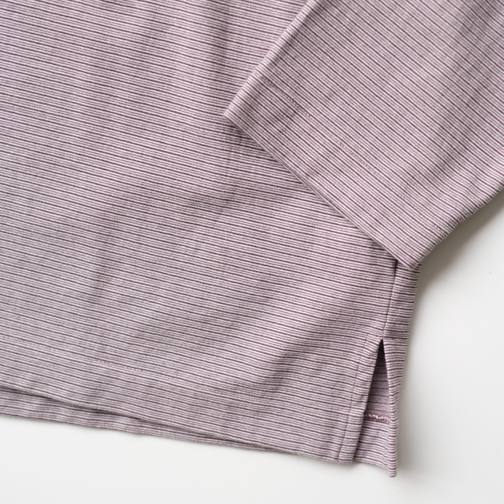 こちらは異種強撚糸同士を引き揃え、しっかりと度目を詰めて編み上げたハイツイスト‧コットン天竺ボーダー素材になります。 シャリ味と清涼感がありクリアな表面感、軽やかな質感、ヴィンテージな風合いが特徴です。