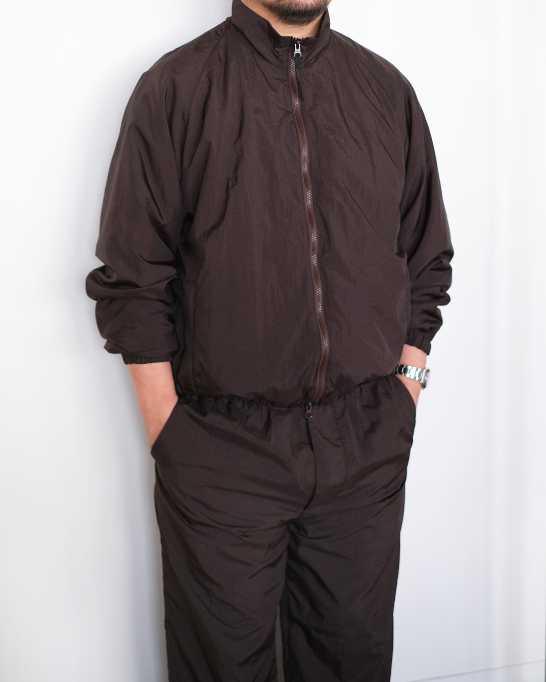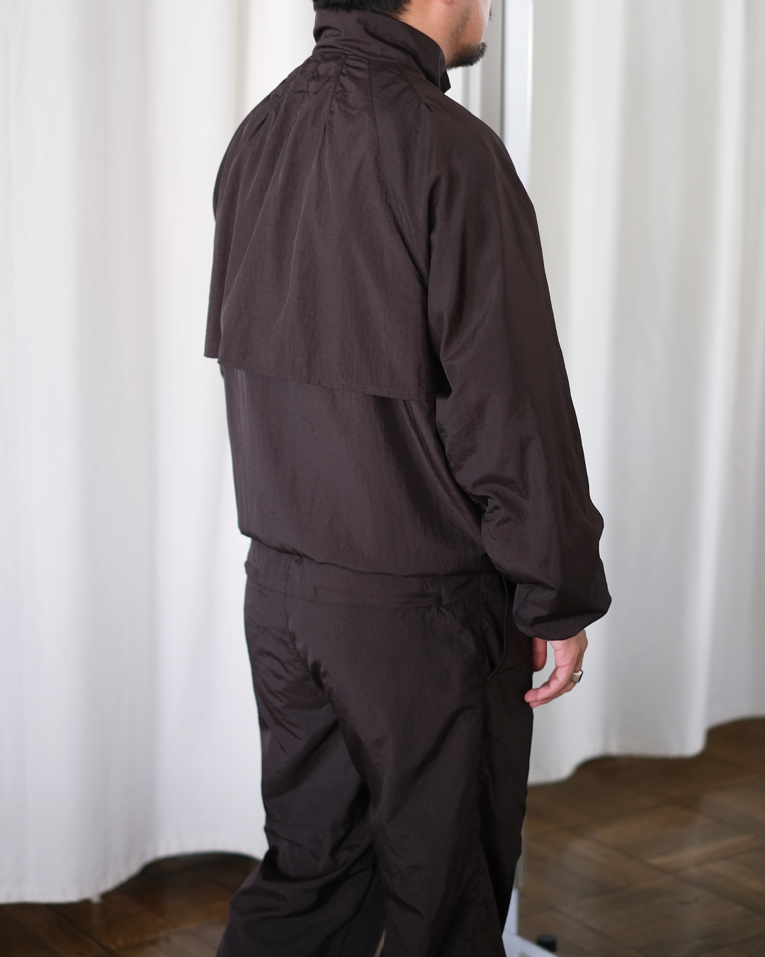 こちらは細番手のナイロン糸に塩縮加工を施し、独特のシワ感と光沢感を軽減しナチュラルな風合いが特徴のナイロンクロスになります。同素材の「Shirinked Nylon Track Pants」とセットアップで着用いただけます。