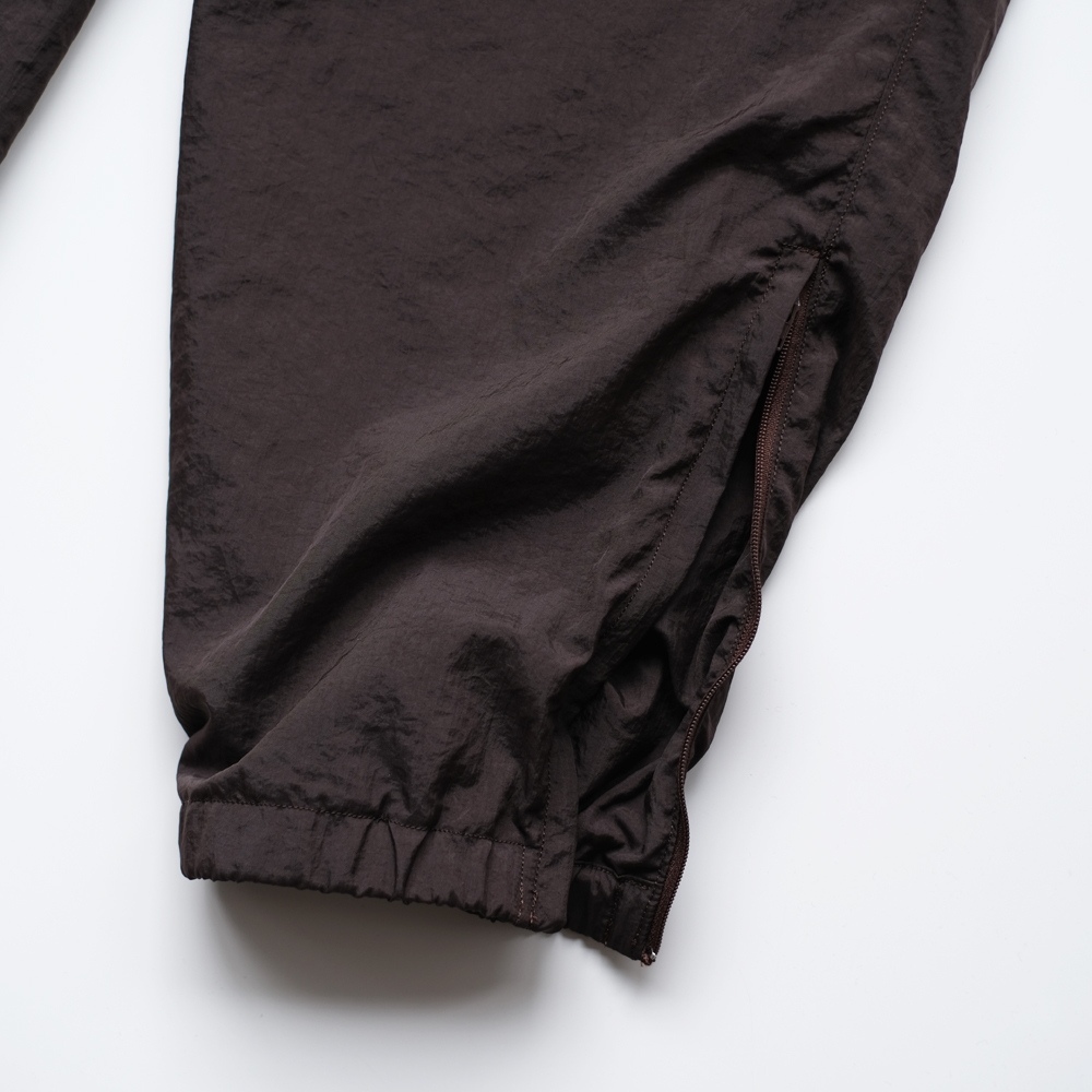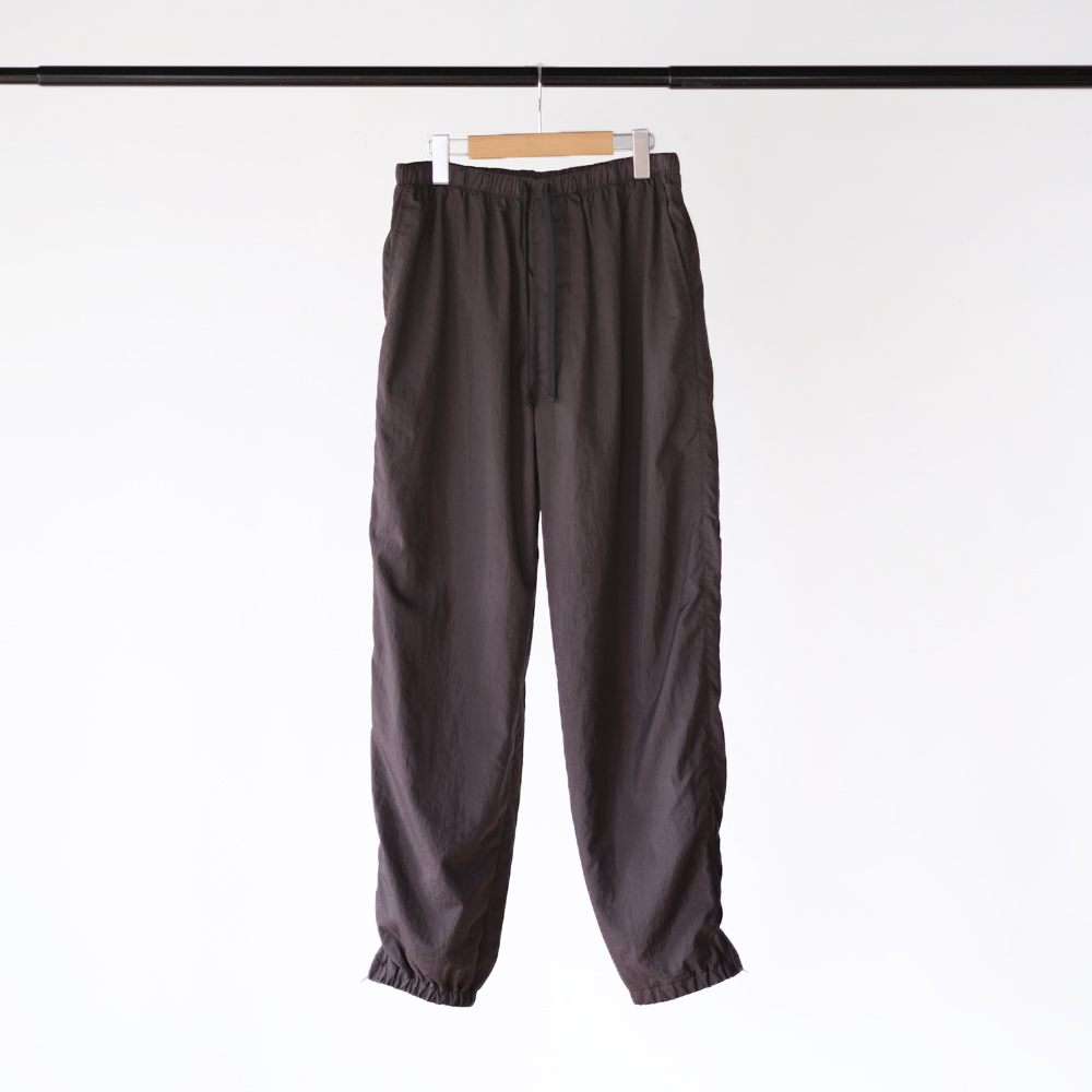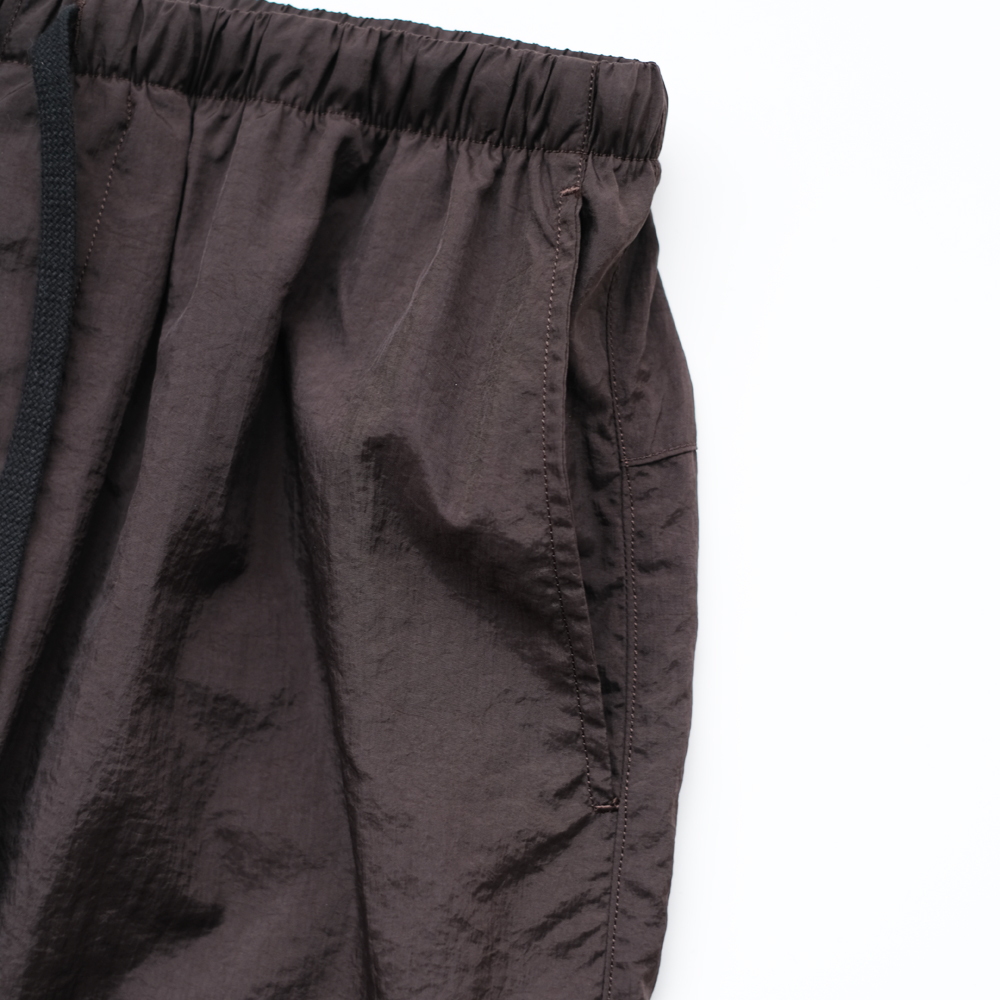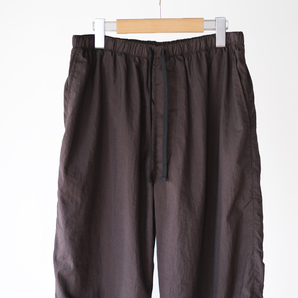 こちらは細番手のナイロン糸に塩縮加工を施し、独特のシワ感と光沢感を軽減しナチュラルな風合いが特徴のナイロンクロスのパンツになります。同素材の「Shrinked Nylon Blouson」とセットアップでご着用いただけます。