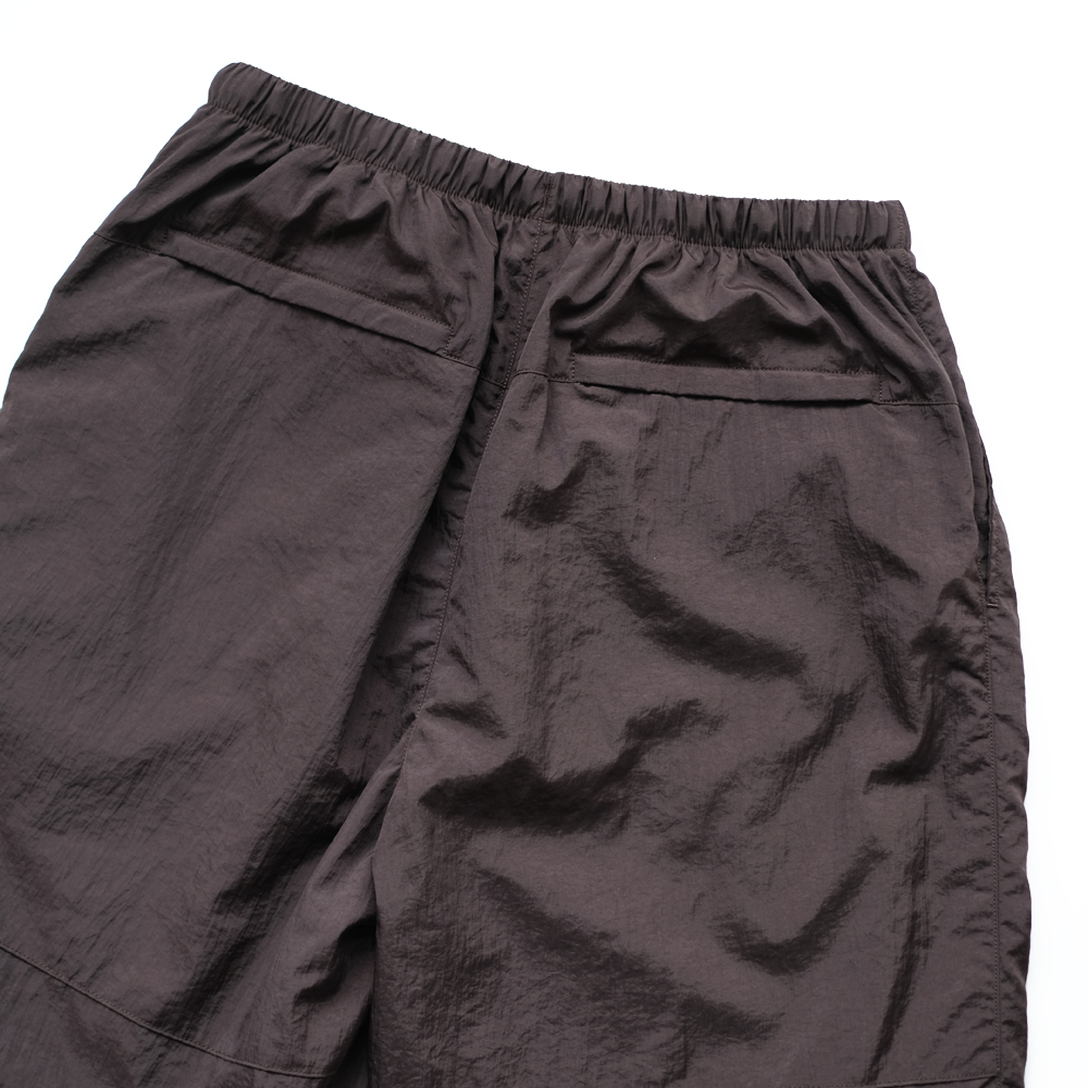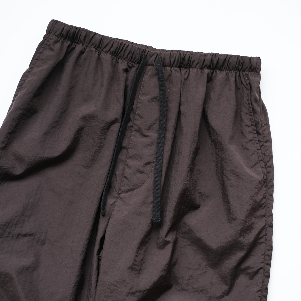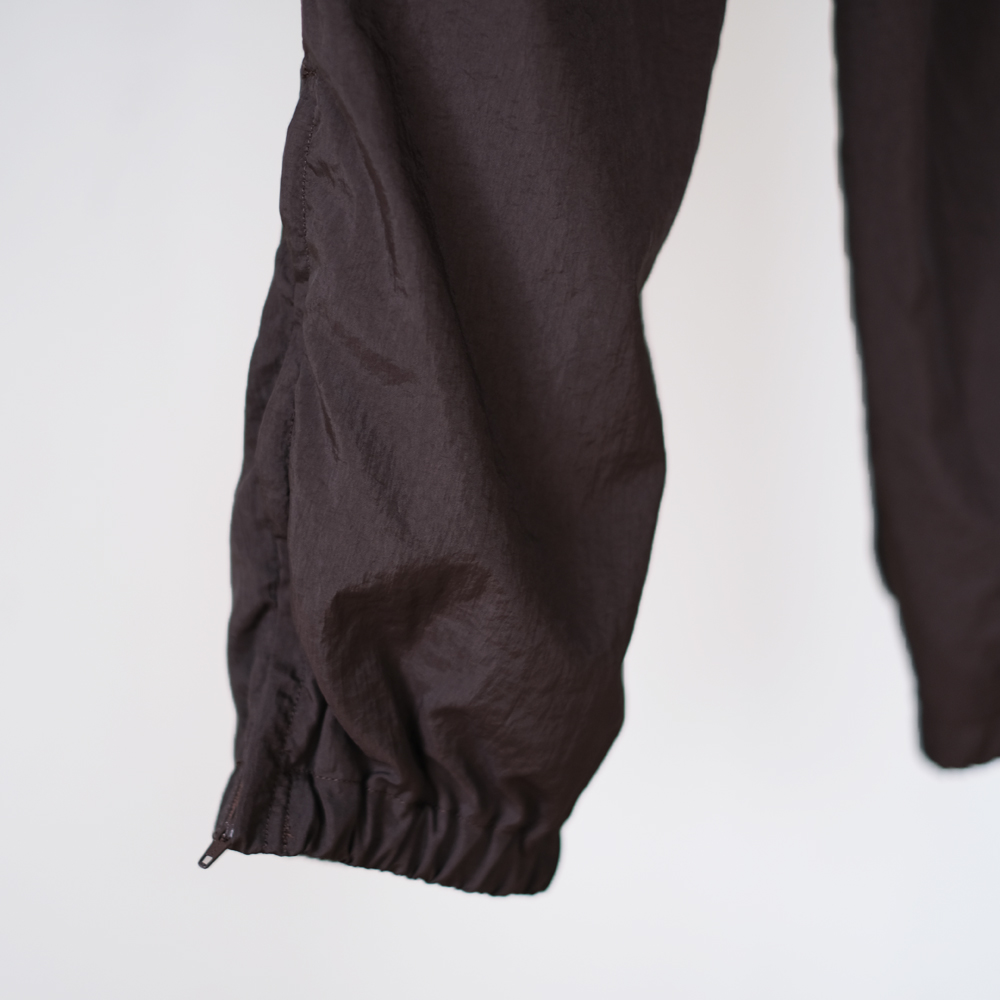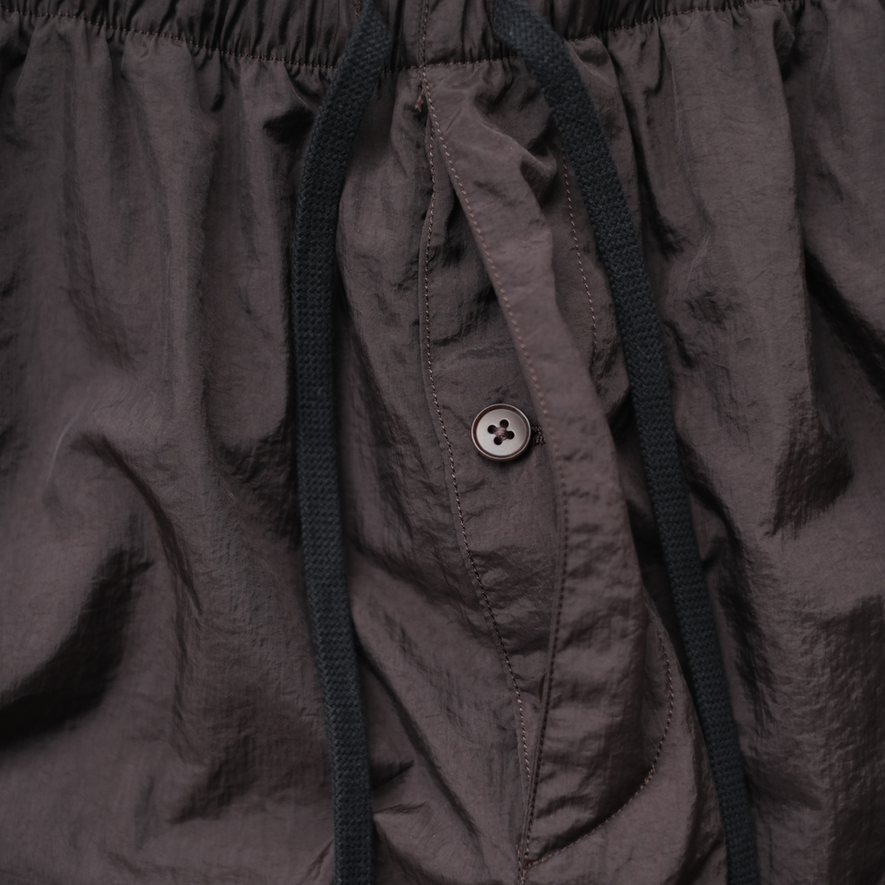 こちらは細番手のナイロン糸に塩縮加工を施し、独特のシワ感と光沢感を軽減しナチュラルな風合いが特徴のナイロンクロスのパンツになります。同素材の「Shrinked Nylon Blouson」とセットアップでご着用いただけます。