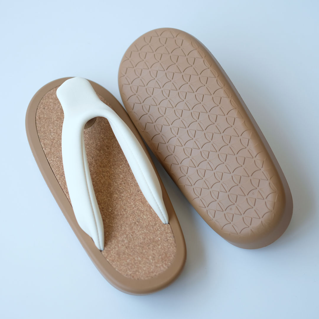 <OJOJO NAITŌ>のベーシックモデルとなるこちらは前ツボの特殊ゴムやインソールに採用されている独自開発のコルクなど、厳選した素材のみを使用しています。印象的な形の前ツボは指肢にぴったりとフィットして力が入りやすい構造にしており、これまでのビーチサンダルにあった「長く履くと疲れる」という悩みを大幅に軽減しています。花緒には水着などで使用される摩擦に強く伸縮性に優れた素材を使用しており、足当たりの良さと長時間履いても疲れない抜群のフィット感を実現しています。ゴム底はタイヤにも使用される強度や耐摩耗性に優れたSBR、芯には反発性が強くへたりにくいEVAを使用する事で、弾力性を高め硬いアスファルトでも足に負担をかけません。