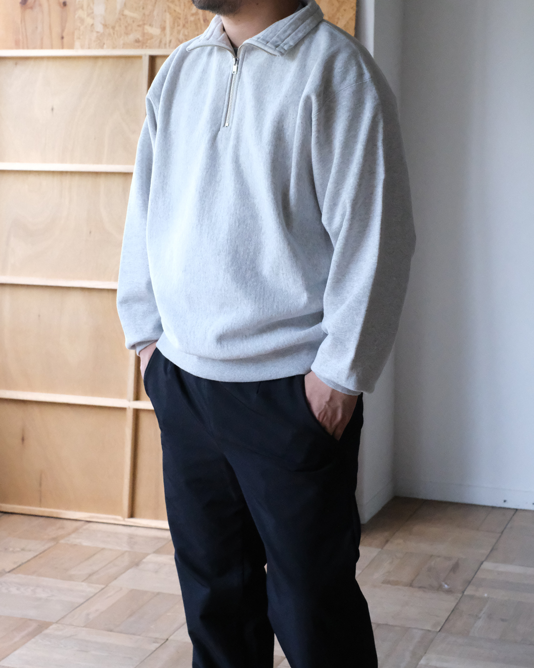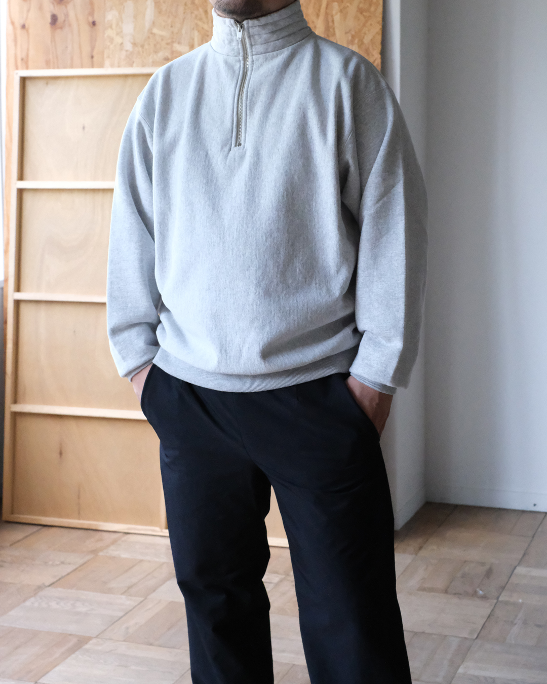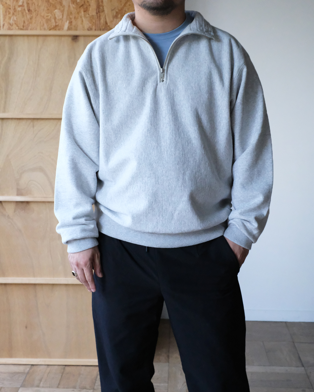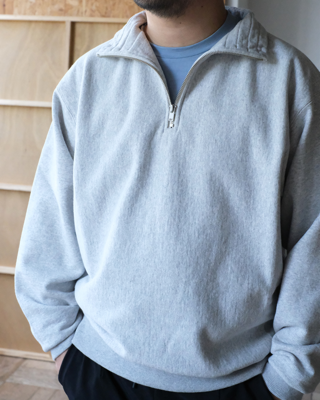 こちらは空気紡績したドライでナチュラルな糸を使用し、高密度にしっかり編み上げた定番オリジナルコットンのジッパーハイネックプルオーバー裏毛になります。少しフェードしたような染色を施しております。
