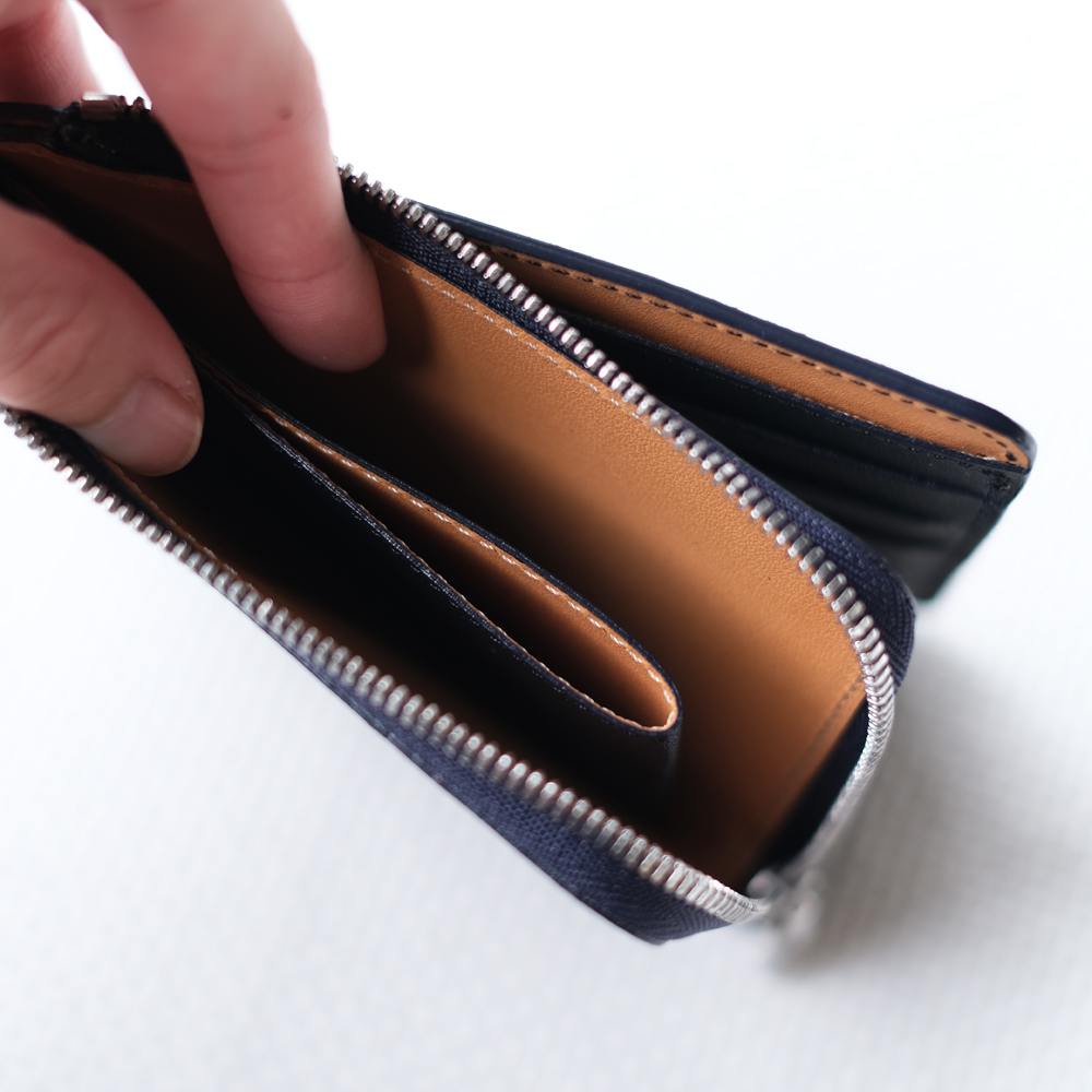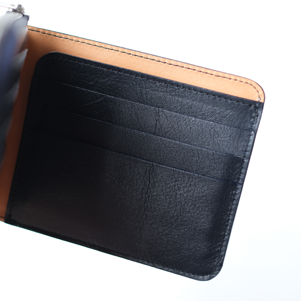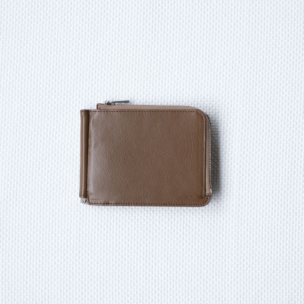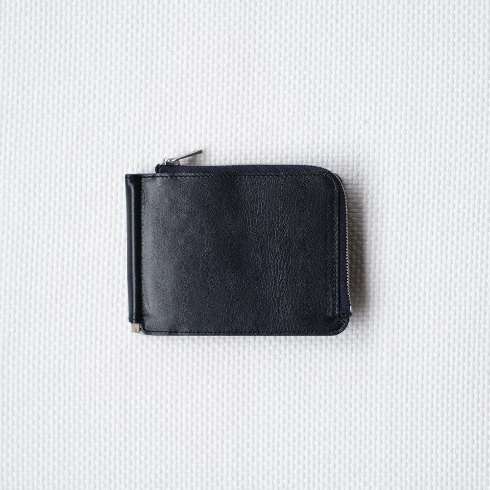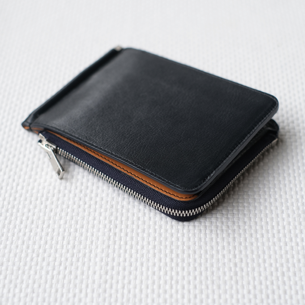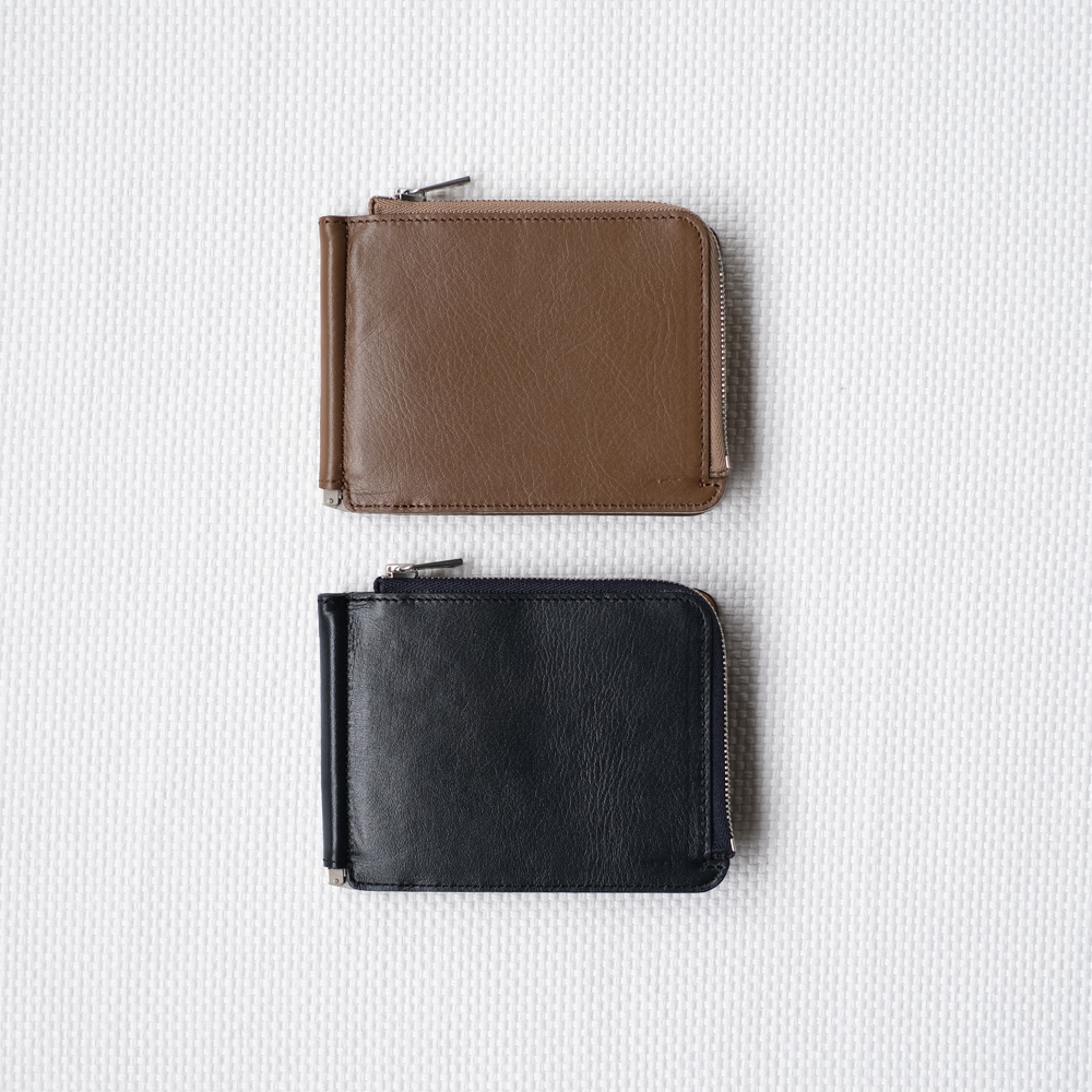 こちらはややシボ感のあるカウレザー素材を使用したマネークリップ付きの二つ折りウォレットになります。コインスペースをL型ジップで設けることで洗練されたデザインにアップデートされました。
