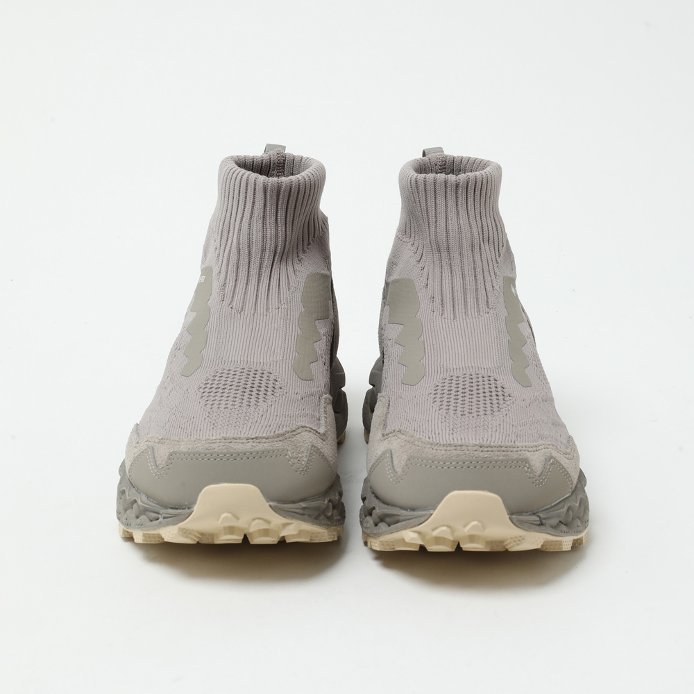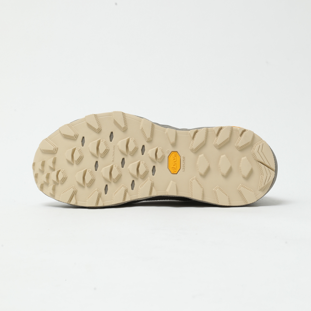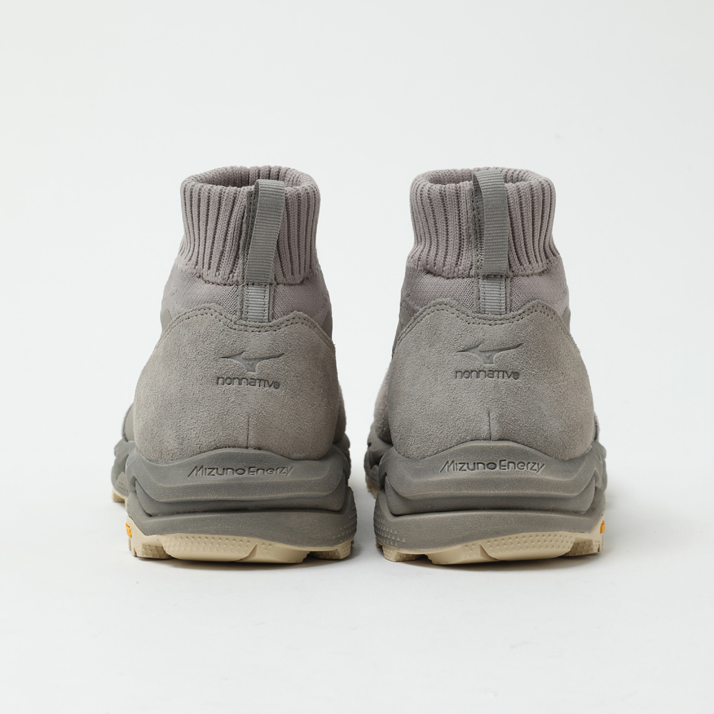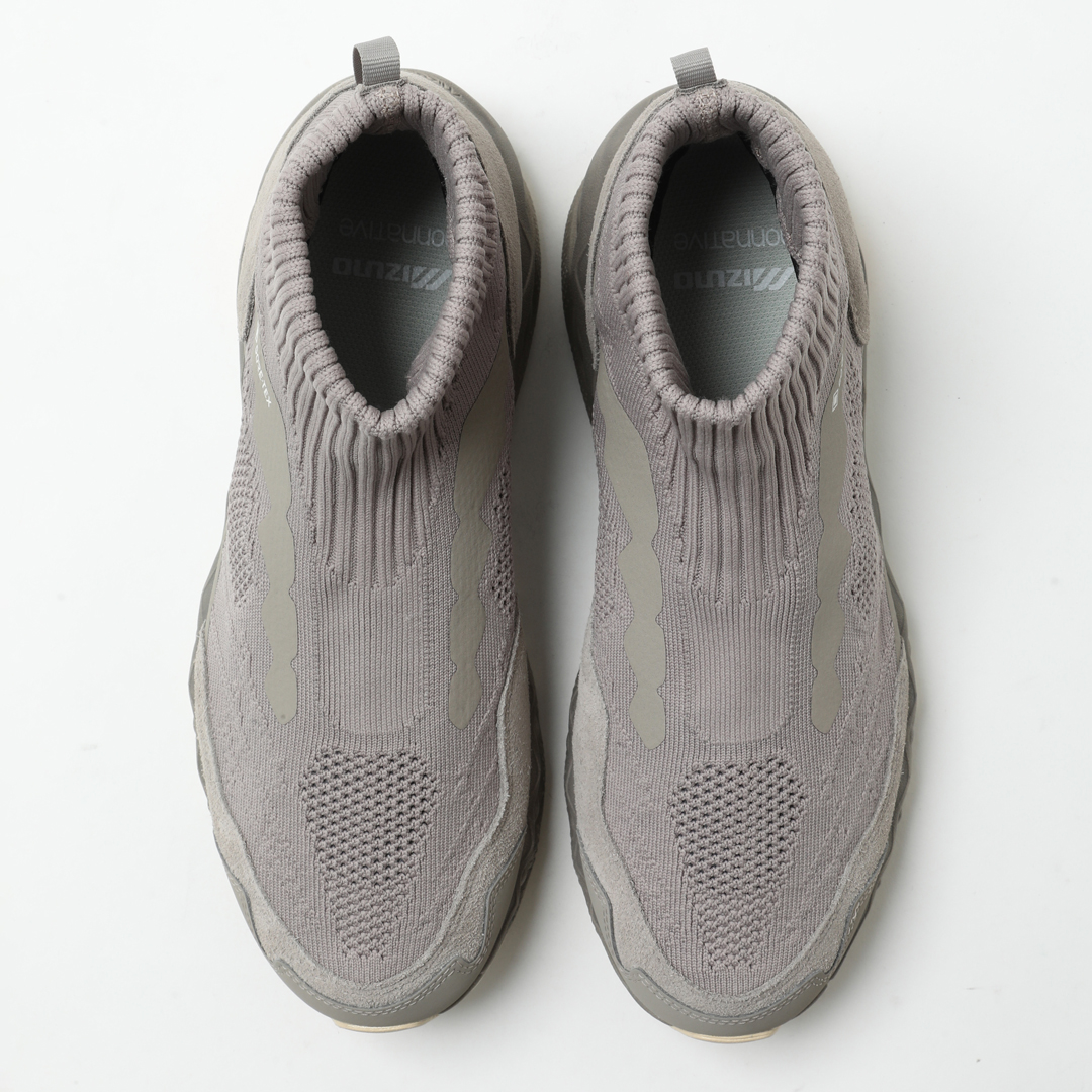 こちらは2023年に登場した「WAVE MUJIN TL GTX nonnative」の系譜を継ぐ、第2世代モデル「WAVE MUJIN LS MID GTX」になります。さらなる機能性と完成度を追求し、足元を支えるソールユニットを中心にアップデートが施されました。ミッドソールには<Mizuno>独自の「Mizuno Enerzy」を採用し、高反発と柔らかな履き心地を実現。フルレングスの「MIZUNO WAVE」がクッション性と安全性を高次元で両立します。ソールには〈VIBRAM®︎〉の「MEGAGRIP」と搭載し、あらゆる路面で優れたグリップを発揮します。ノーソーデザインが特徴的なアッパーには、ニット、天然皮革〈GORE-TEX®︎〉を組み合わせた構造。カラーリングには、シーズンの原点を象徴するVintage Khakiを採用しました。