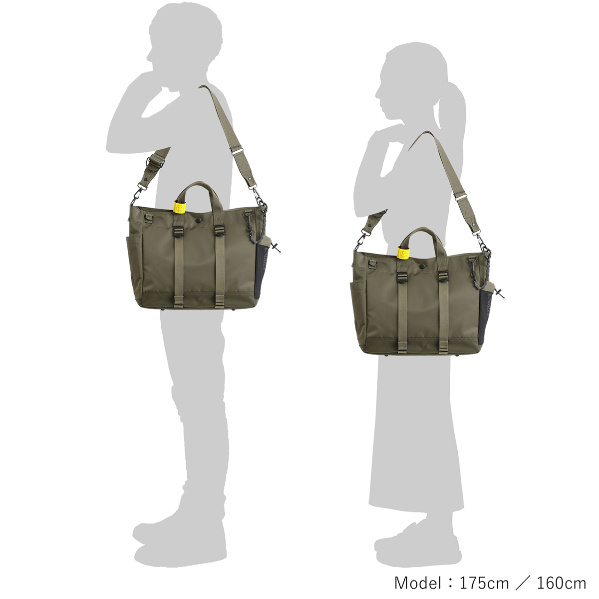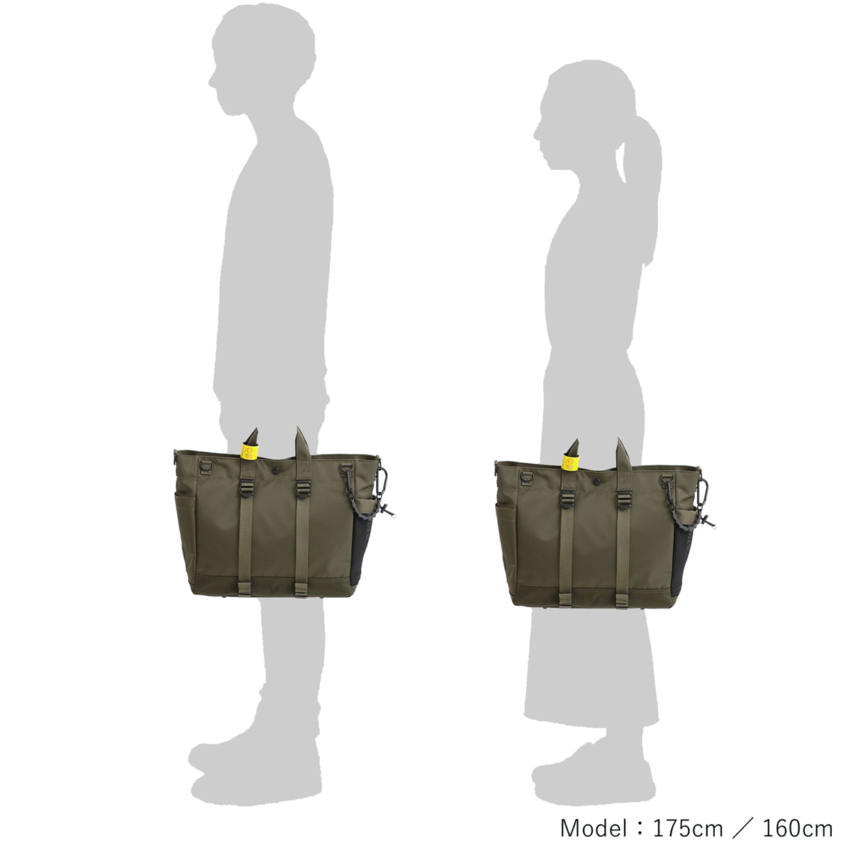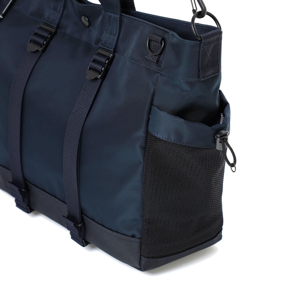 メイン素材にナイロンツイル生地を使用しており、PVC加工を施すことで耐水性を高めています。負荷のかかりやすい底マチ部分にはコーデュラバリスティックナイロンを採用し、耐久性も上げました。本体の前面や底面に身の回りのものを簡易的に固定して持ち運ぶことができるスリングバインダーも配しています。バックパックやウエストバッグはテープをクロスさせることで、見た目のアクセントにしました。ショルダーストラップはワンアクションで滑らかな調節が可能な画期的な仕様です。