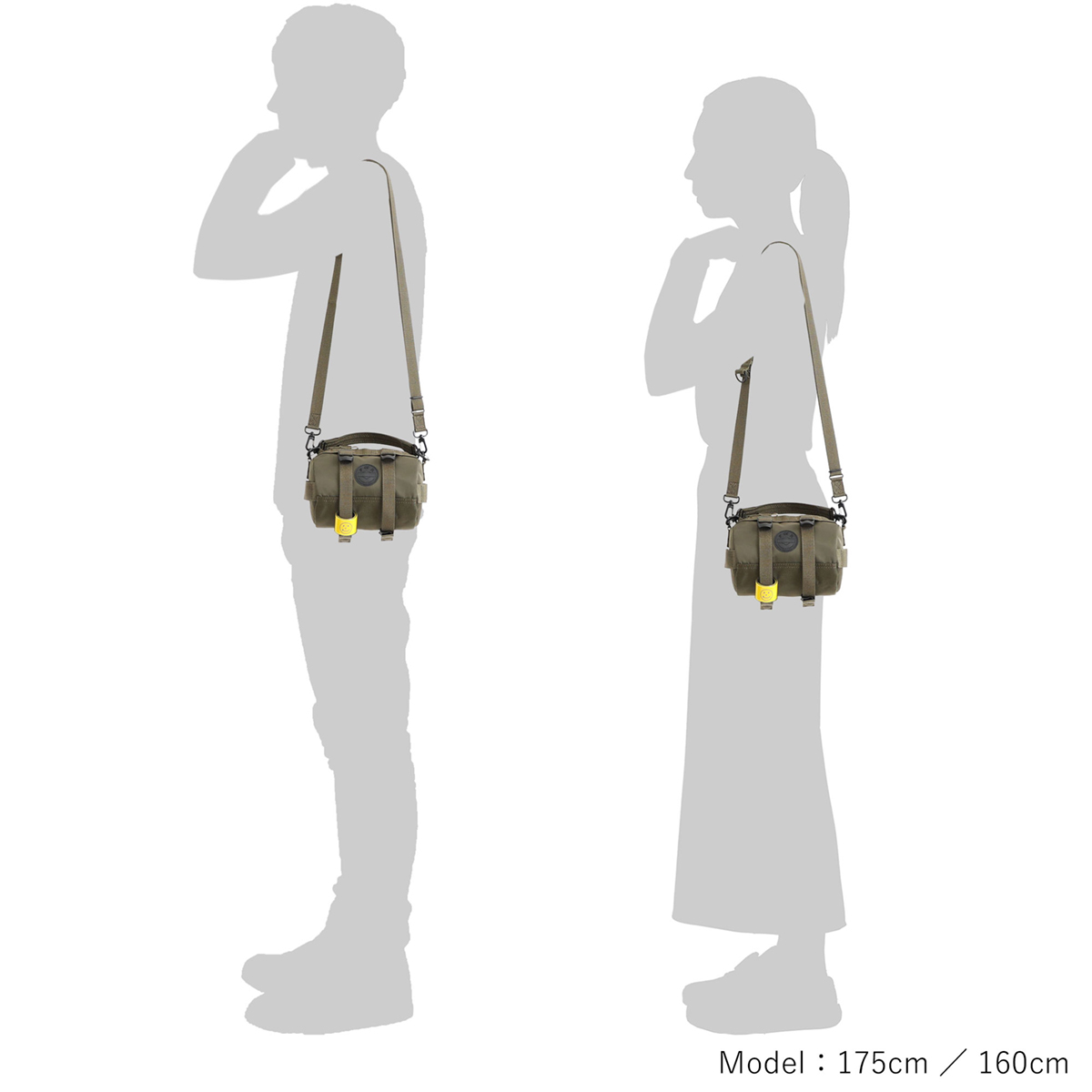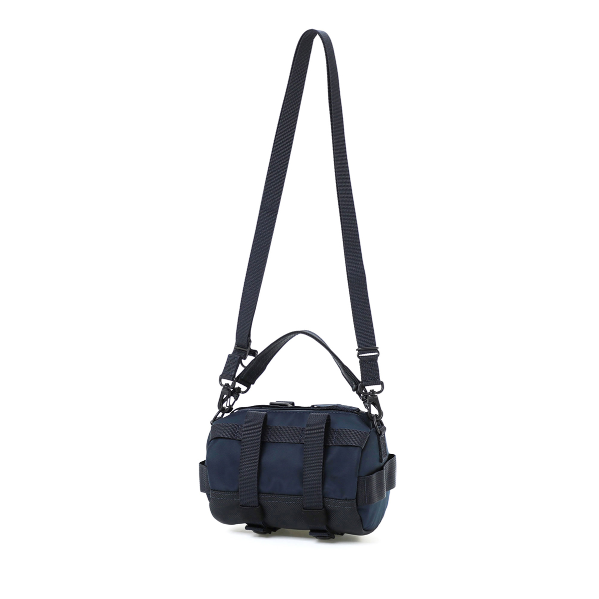 メイン素材にナイロンツイル生地を使用しており、PVC加工を施すことで耐水性を高めています。負荷のかかりやすい底マチ部分にはコーデュラバリスティックナイロンを採用し、耐久性も上げました。本体の前面や底面に身の回りのものを簡易的に固定して持ち運ぶことができるスリングバインダーも配しています。バックパックやウエストバッグはテープをクロスさせることで、見た目のアクセントにしました。ショルダーストラップはワンアクションで滑らかな調節が可能な画期的な仕様です。
