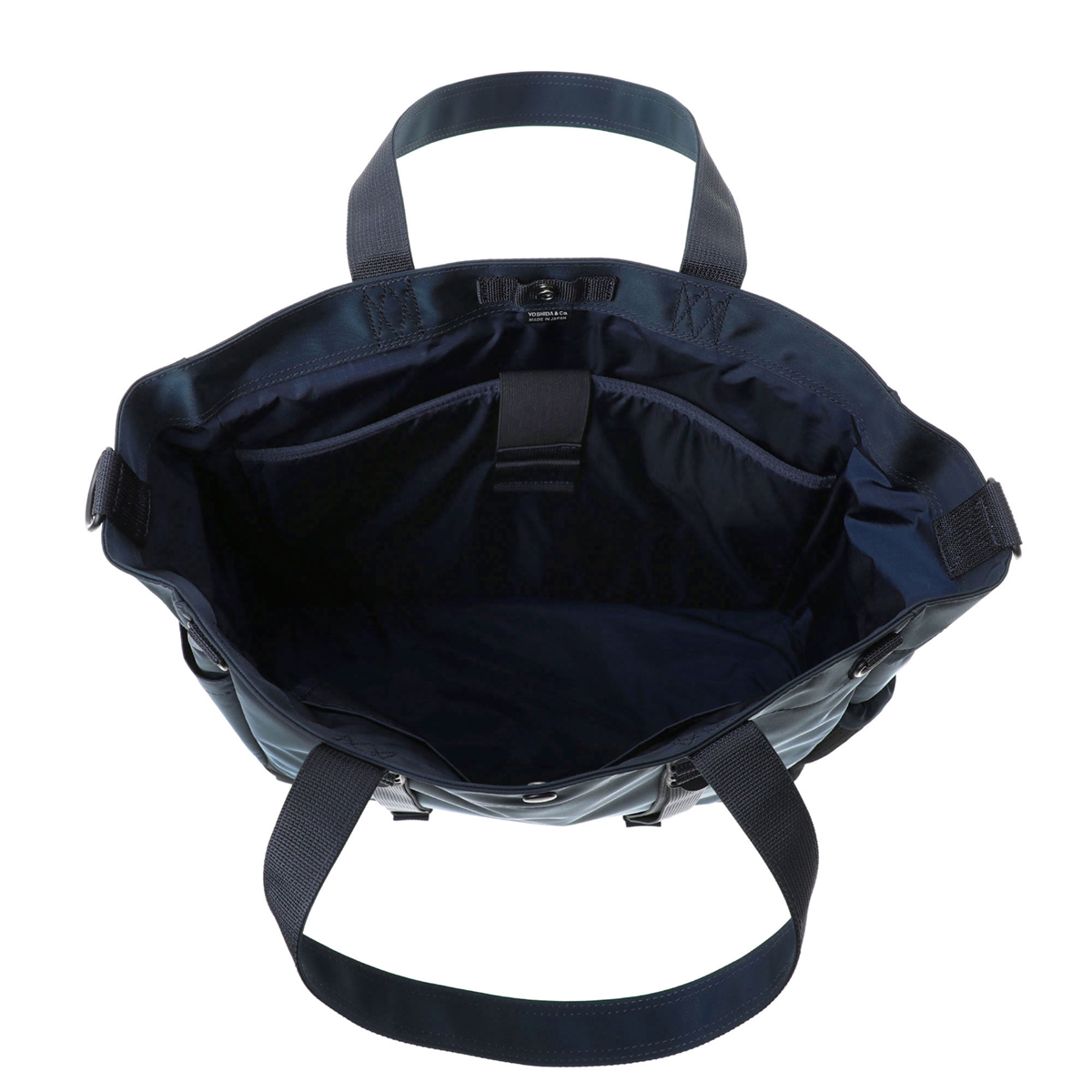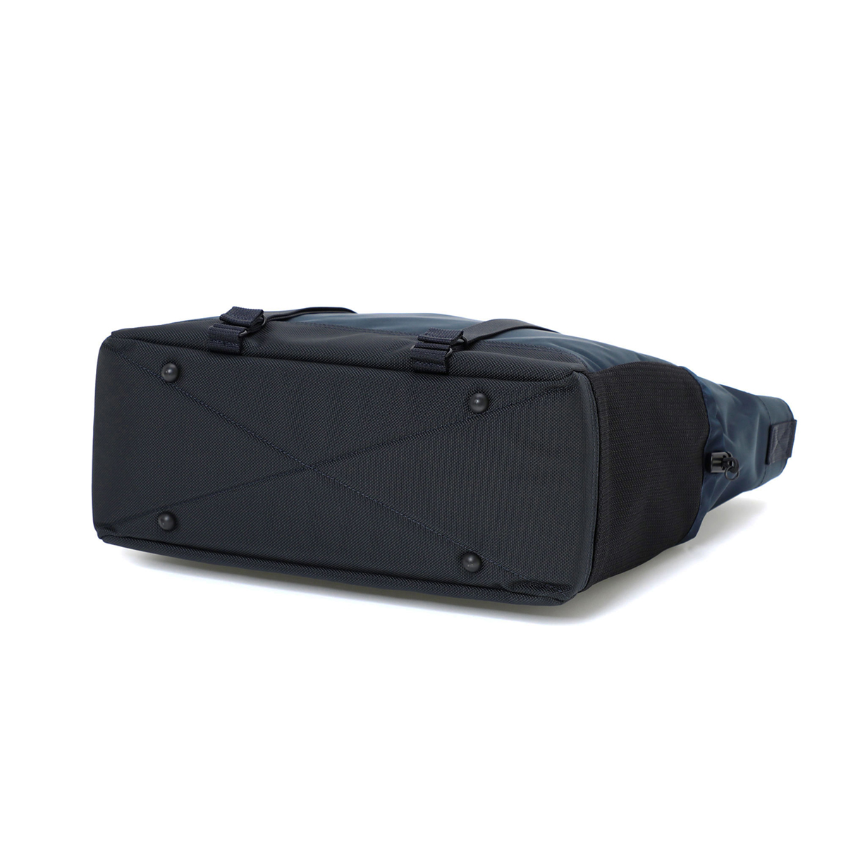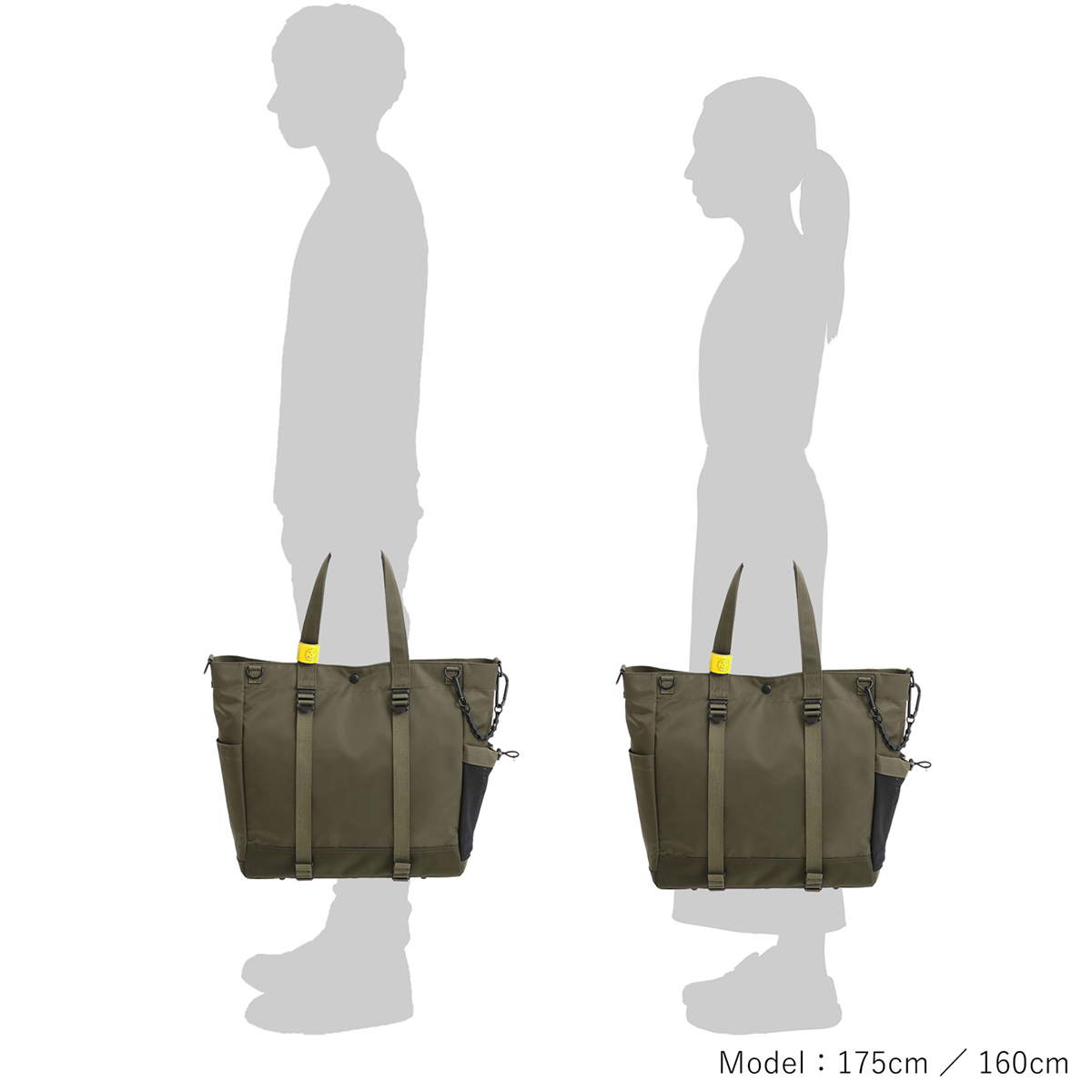 2WAYトートバッグ(L)は大容量のメイン収納部内に14inchのPCを収納できるクッション材入りのポケットを設けた、オン・オフどちらのシーンでも使いやすいアイテムです。ハンドルは肩掛けにも対応しています。サイドのポケットには600mlのペットボトルや折り畳み傘が収納できます。