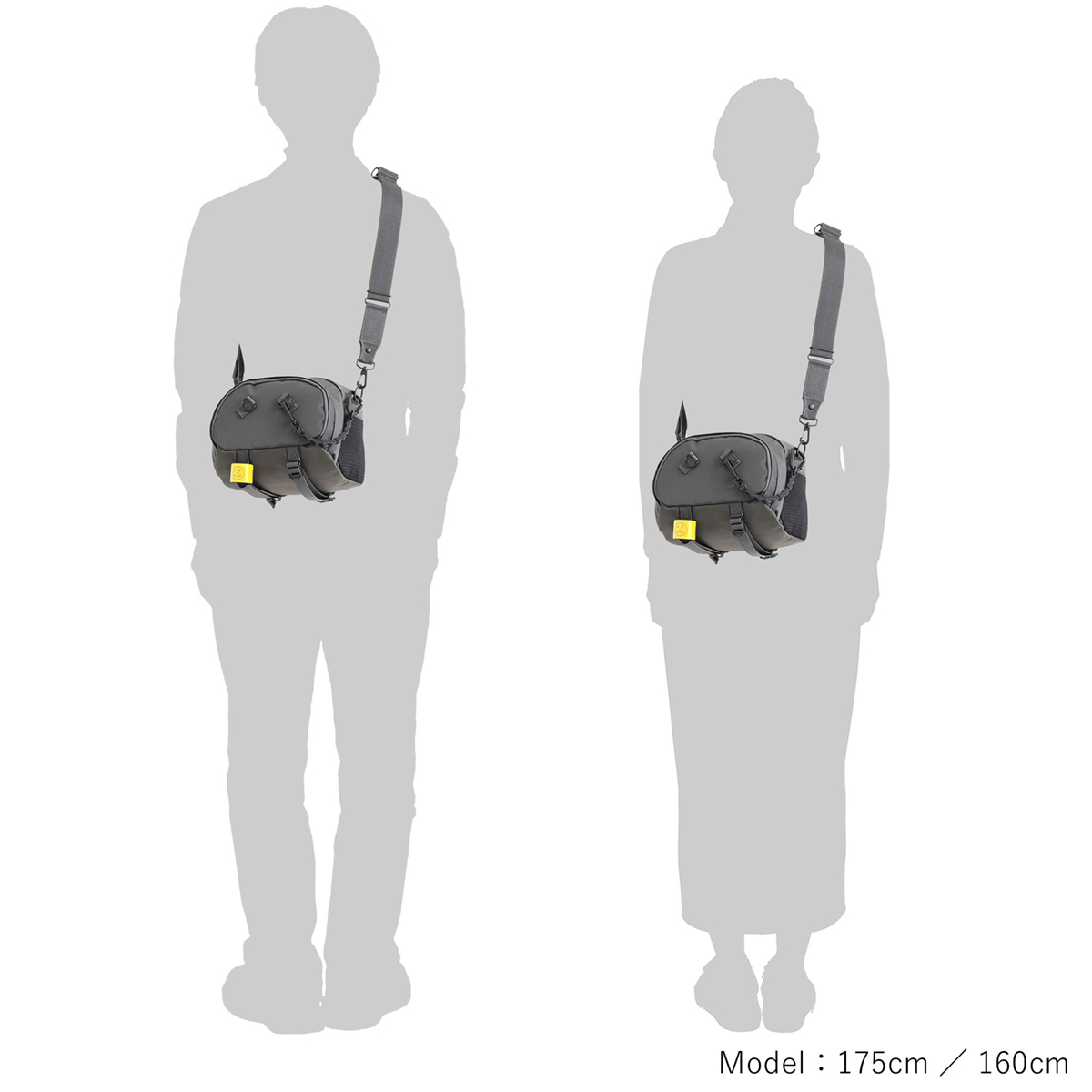 メイン素材にナイロンツイル生地を使用しており、PVC加工を施すことで耐水性を高めています。負荷のかかりやすい底マチ部分にはコーデュラバリスティックナイロンを採用し、耐久性も上げました。本体の前面や底面に身の回りのものを簡易的に固定して持ち運ぶことができるスリングバインダーも配しています。バックパックやウエストバッグはテープをクロスさせることで、見た目のアクセントにしました。ショルダーストラップはワンアクションで滑らかな調節が可能な画期的な仕様です。