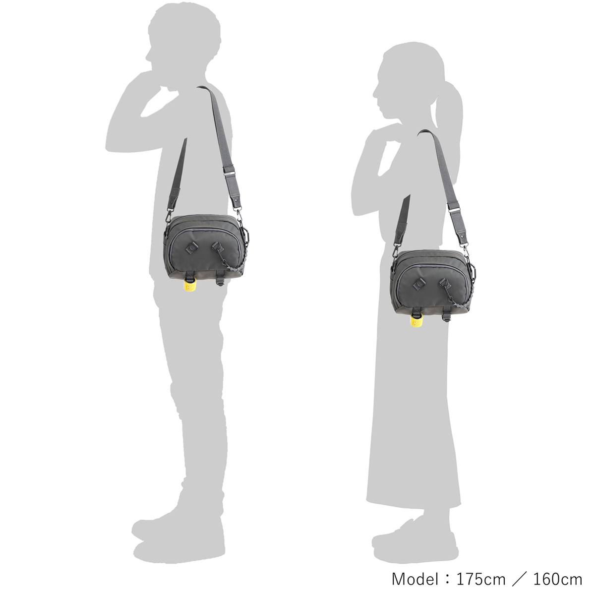 ショルダーバッグは2層式で、小ぶりながらもマチ幅があり、身の回りの必需品や350mlのペットボトルが収納できるサイズで普段使いに最適なアイテムです。メイン収納部と前層の内装に小分けに便利なポケットを設けており、細かな荷物の収納が可能です。
