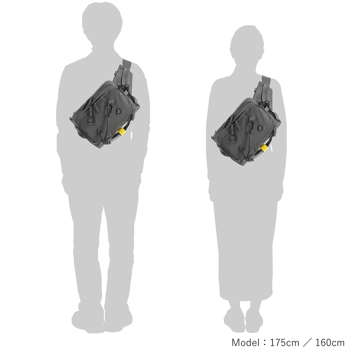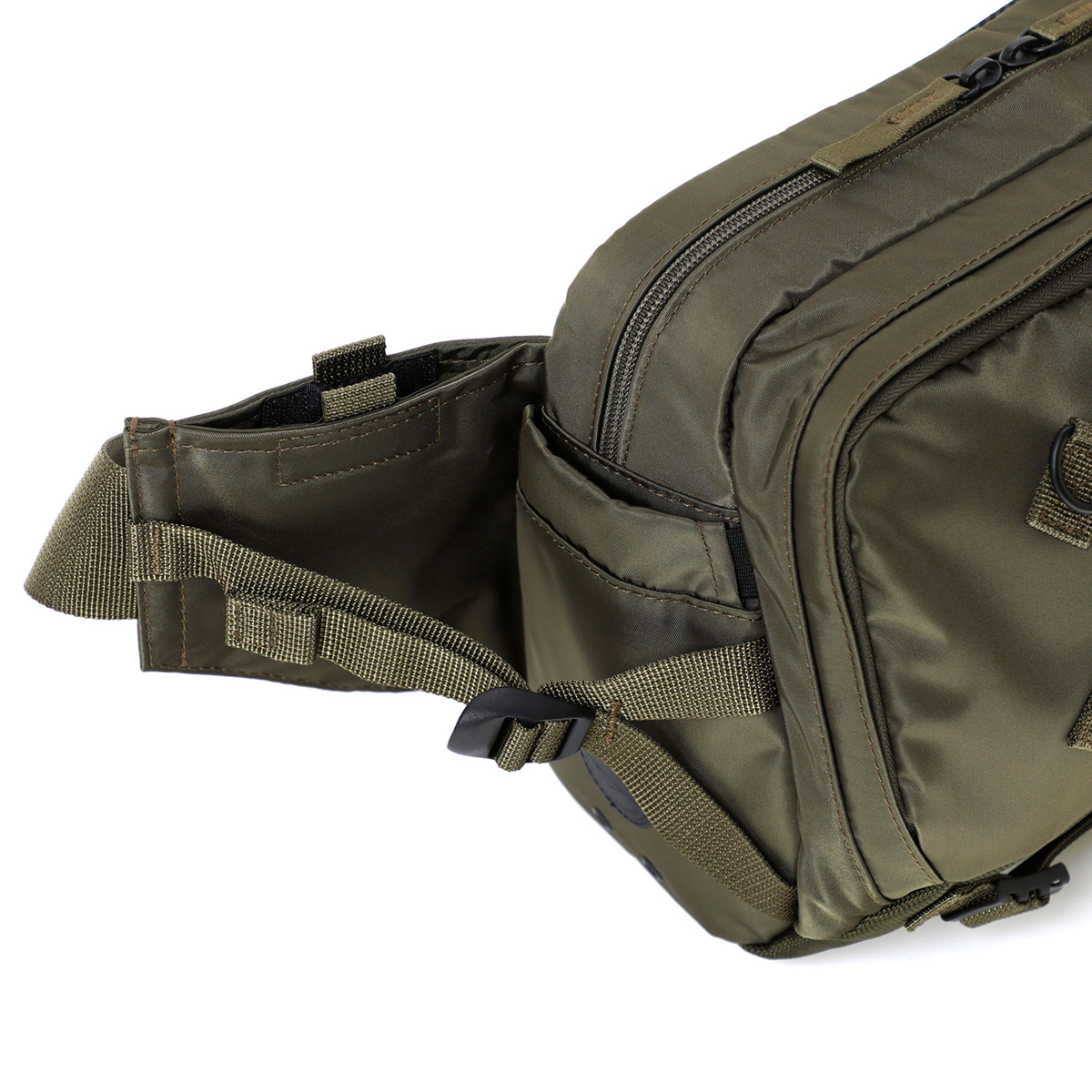 メイン素材にナイロンツイル生地を使用しており、PVC加工を施すことで耐水性を高めています。負荷のかかりやすい底マチ部分にはコーデュラバリスティックナイロンを採用し、耐久性も上げました。本体の前面や底面に身の回りのものを簡易的に固定して持ち運ぶことができるスリングバインダーも配しています。バックパックやウエストバッグはテープをクロスさせることで、見た目のアクセントにしました。ショルダーストラップはワンアクションで滑らかな調節が可能な画期的な仕様です。