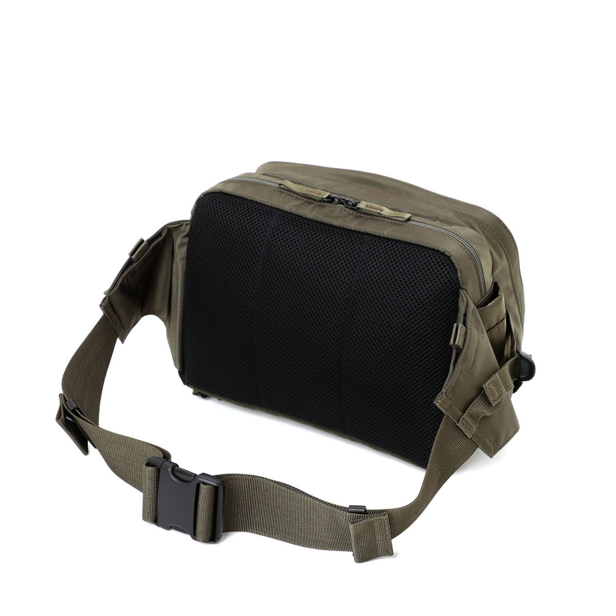 ウエストバッグは大容量のメイン収納部と、ウォレットやスマートフォンの収納に便利な前層部を備えた2層式のアイテムです。メイン収納部の内装には11inchのiPadが収納できるクッション材入りのポケットを設けています。サイドのポケットには口元に伸縮性のある素材を採用したポケットと、メッシュ素材のポケットを備えました。ハーネス部分のポケットにはワイヤレスイヤホンなどが収納可能です。