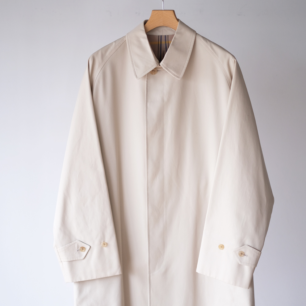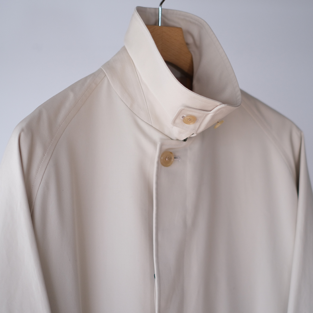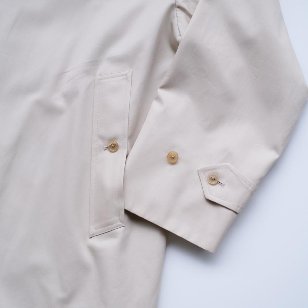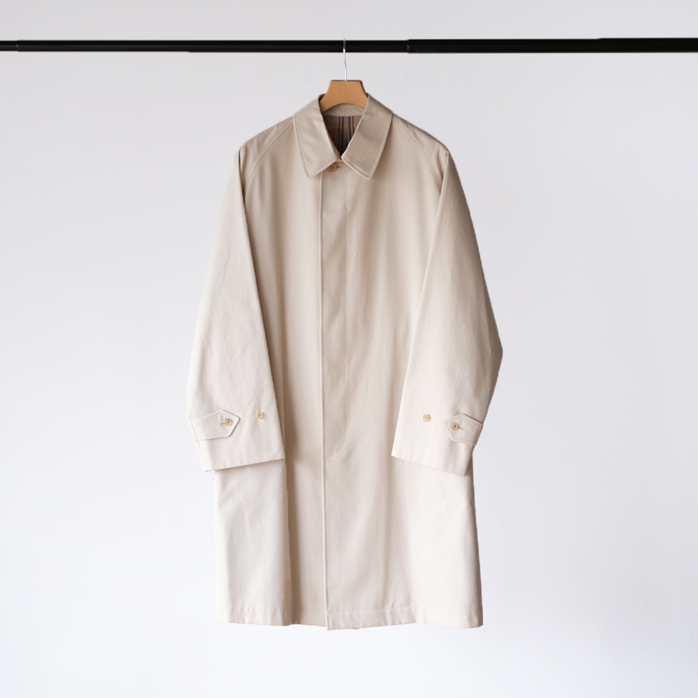 こちらはクラシックなシルエットでありながらモダンな要素も兼ね備えた<ANATOMICA>の名作シングルラグランコートになります。表生地はオリジナル高密度コットンギャバジンを使用しており、高い撥水性が特徴となっています。通常2枚の生地を使うのに対して、こちらは1枚の生地を筒状に使いラグランスリーブを作っており、大きくゆとりのある美しいAラインシルエットに仕上げています。