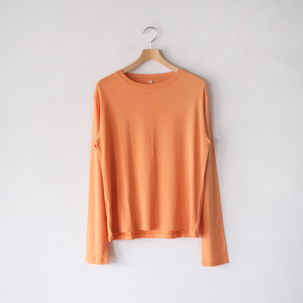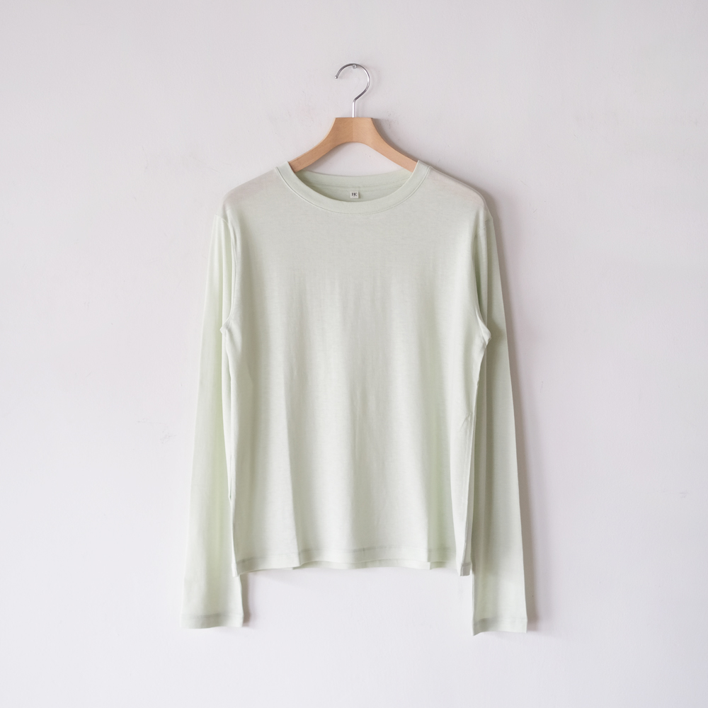 こちらはセルロースコットン糸で編み上げたオリジナル天竺生地を使用した定番長袖Tシャツです。襟のフロントは跨ぎ二本針でフラットに、襟後ろはタコバインダーで細部まで美しい仕様になっています。細二本針縫製で仕上げたカジュアルな中でも繊細な印象を目指した一着となっています。