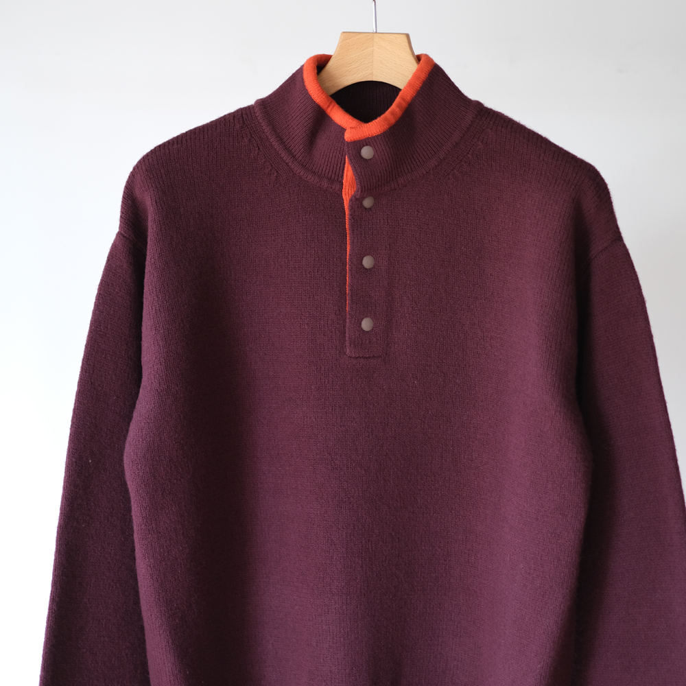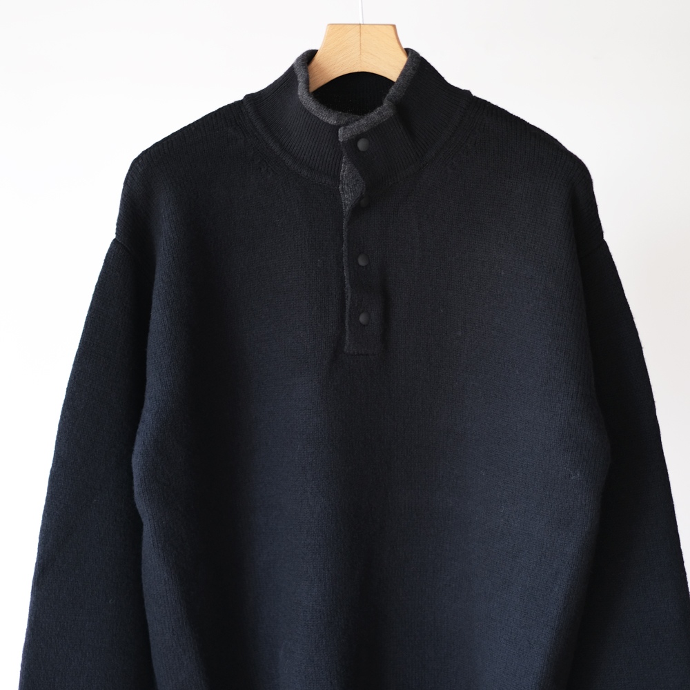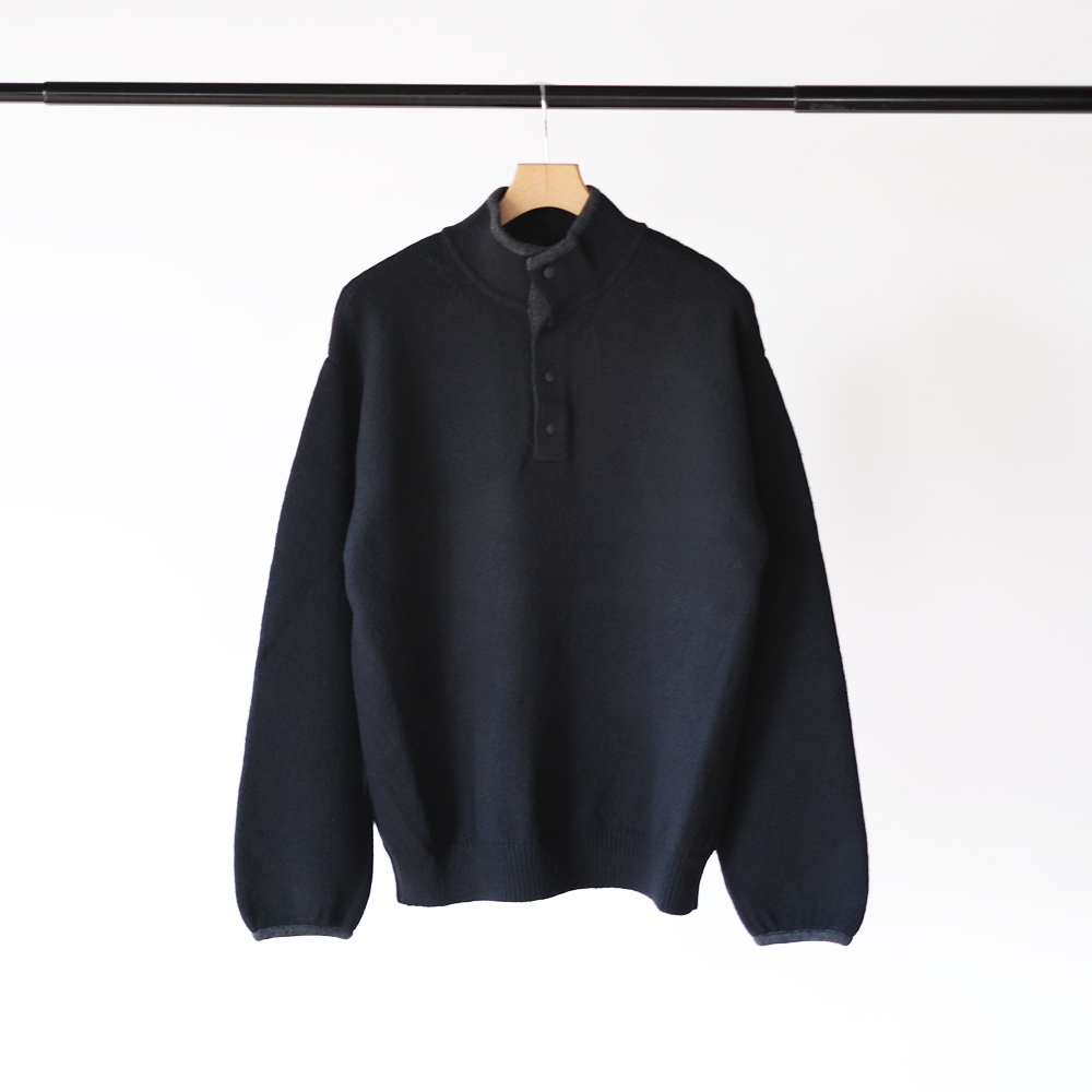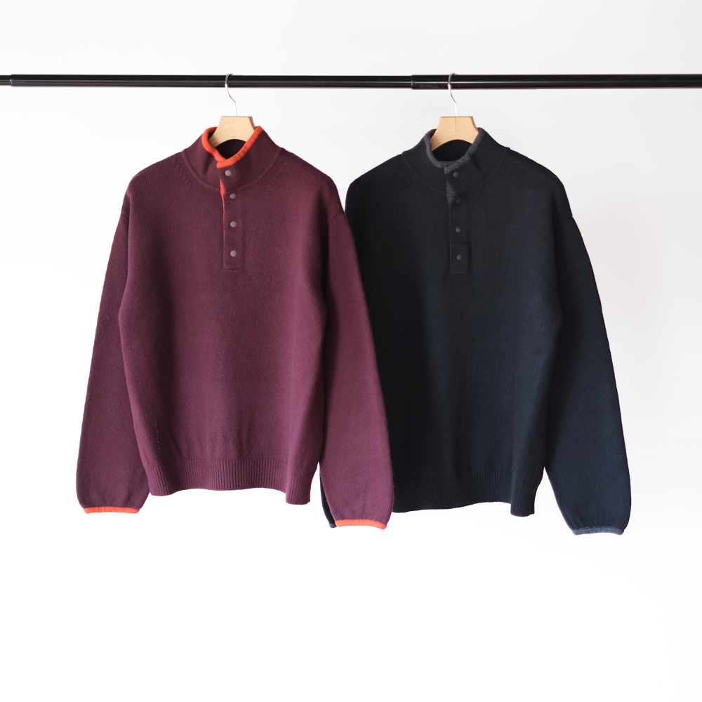 こちらは南フランス・アルル地方という標高1500~3000mの大自然の中で放牧飼育されたフラ ンスメリノ種を原料として使用したニットで、通常のウールより非常に膨らみがあり、軽く保温性が特に優れています。 プルオーバーのボディー部分は3本撚りで編んでいますが、パイピングや前立て部分などは厚くならないよう2本撚りの糸で編み機のゲージも変え編立てられました。ミドルゲージではありますが、糸の膨らみと編み目を詰めた事で、ハイゲージのようなキレイな編み目に仕上げられています。