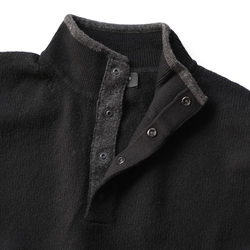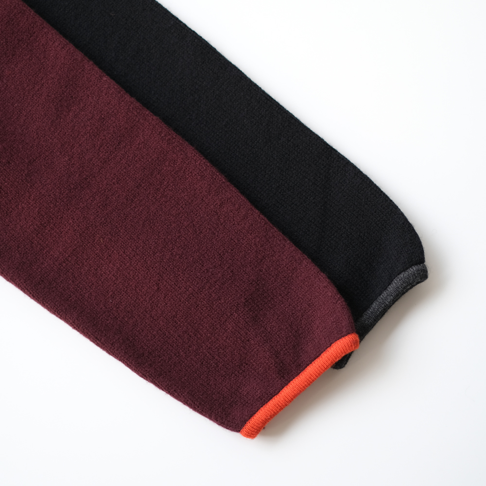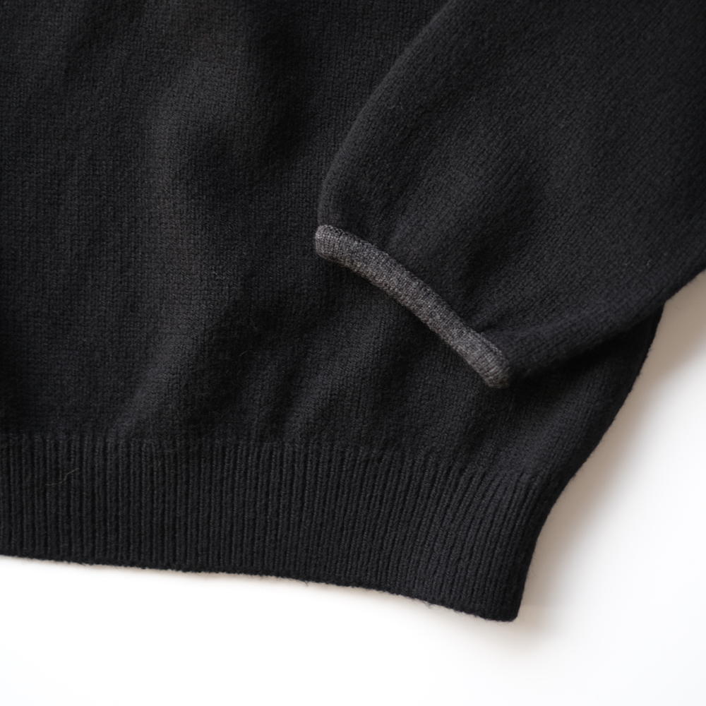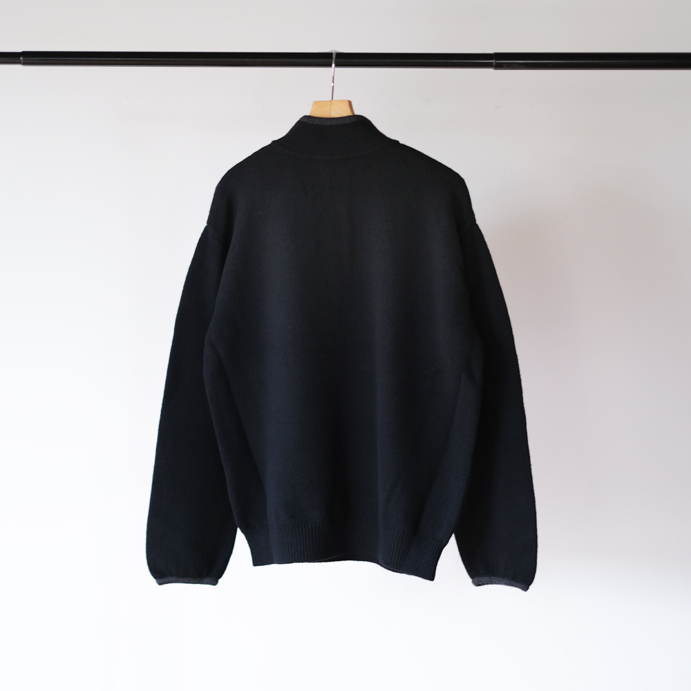 こちらは南フランス・アルル地方という標高1500~3000mの大自然の中で放牧飼育されたフラ ンスメリノ種を原料として使用したニットで、通常のウールより非常に膨らみがあり、軽く保温性が特に優れています。 プルオーバーのボディー部分は3本撚りで編んでいますが、パイピングや前立て部分などは厚くならないよう2本撚りの糸で編み機のゲージも変え編立てられました。ミドルゲージではありますが、糸の膨らみと編み目を詰めた事で、ハイゲージのようなキレイな編み目に仕上げられています。